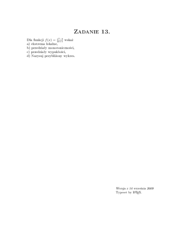 Zadanie 13. Dla funkcji f (x) = x2 −3 wska» 2x+1 a) ekstrema lokalne, b) przedziaªy monotoniczno±ci, c) przedziaªy wypukªo±ci, d) Narysuj przybli»ony wykres. Wersja z 14 wrze±nia 2009 A Typeset by L TEX.