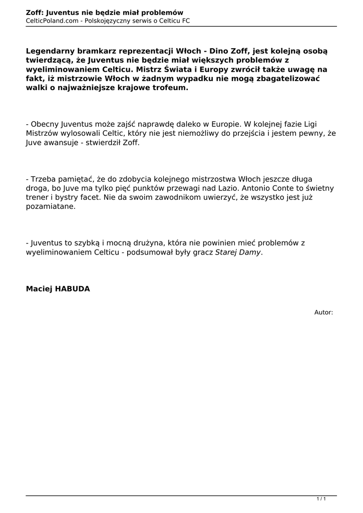 Zoff: Juventus nie będzie miał problemów CelticPoland.com - Polskojęzyczny serwis o Celticu FC Legendarny bramkarz reprezentacji Włoch - Dino Zoff, jest kolejną osobą twierdzącą, że Juventus nie będzie miał większych problemów z wyeliminowaniem Celticu. Mistrz Świata i Europy zwrócił także uwagę na fakt, iż mistrzowie Włoch w żadnym wypadku nie mogą zbagatelizować walki o najważniejsze krajowe trofeum. - Obecny Juventus może zajść naprawdę daleko w Europie. W kolejnej fazie Ligi Mistrzów wylosowali Celtic, który nie jest niemożliwy do przejścia i jestem pewny, że Juve awansuje - stwierdził Zoff. - Trzeba pamiętać, że do zdobycia kolejnego mistrzostwa Włoch jeszcze długa droga, bo Juve ma tylko pięć punktów przewagi nad Lazio. Antonio Conte to świetny trener i bystry facet. Nie da swoim zawodnikom uwierzyć, że wszystko jest już pozamiatane. - Juventus to szybką i mocną drużyna, która nie powinien mieć problemów z wyeliminowaniem Celticu - podsumował były gracz Starej Damy. Maciej HABUDA Autor: 1/1 Powered by TCPDF (www.tcpdf.org)
