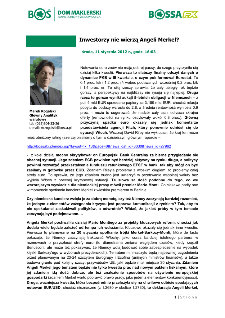 Inwestorzy nie wierzą Angeli Merkel? środa, 11 stycznia 2012 r., godz. 16:03 Notowania euro znów nie mają dobrej passy, do czego przyczyniło się dzisiaj kilka kwestii. Pierwsza to słabszy finalny odczyt danych o dynamice PKB w III kwartale, o czym poinformował Eurostat. To 0,1 proc. k/k i 1,2 proc. r/r wobec podawanych wcześniej 0,2 proc. k/k i 1,4 proc. r/r. To siłą rzeczy sprawia, że cały ubiegły rok będzie gorszy, a perspektywy na najbliższy nie rysują się najlepiej. Druga rzecz to gorsze wyniki aukcji 5-letnich obligacji w Niemczech – z puli 4 mld EUR sprzedano papiery za 3,159 mld EUR, chociaż relacja popytu do podaży wzrosła do 2,8, a średnia rentowność wyniosła 0,9 Marek Rogalski proc. – może to sugerować, że nadzór cały czas odrzuca skrajne Główny Analityk oferty (rentowności na rynku oscylowały wokół 0,8 proc.). Główną walutowy przyczyną spadku euro okazały się jednak komentarze tel: (022)504-33-26 przedstawiciela agencji Fitch, który ponownie odniósł się do e-mail: [email protected] sytuacji Włoch. Wczoraj David Riley nie wykluczał, że kraj ten może mieć obniżony rating (szerzej pisaliśmy o tym w dzisiejszym głównym raporcie – http://bossafx.pl/index.jsp?layout=fx_13&page=0&news_cat_id=3030&news_id=27962 - z kolei dzisiaj mocno skrytykował on Europejski Bank Centralny za bierne przyglądanie się obecnej sytuacji. Jego zdaniem ECB powinien być bardziej aktywny na rynku długu, a politycy powinni rozważyć przekształcenie funduszu ratunkowego EFSF w bank, tak aby mógł on być zasilany w gotówkę przez ECB. Zdaniem Riley’a problemy z włoskim długiem, to problemy całej strefy euro. To sprawia, że jego zdaniem trudno jest uwierzyć w przetrwanie wspólnej waluty bez wyjścia Włoch z obecnej kryzysowej sytuacji. Te słowa są dość podobne do tego, co we wczorajszym wywiadzie dla niemieckiej prasy mówił premier Mario Monti. Co ciekawe padły one w momencie spotkania kanclerz Merkel z włoskim premierem w Berlinie. Czy niemiecka kanclerz wzięła je za dobrą monetę, czy też Niemcy zaczynają bardziej rozumieć, że jednym z elementów zażegnania kryzysu jest poprawa komunikacji z rynkiem? Tak, aby to nie spekulanci zaskakiwali polityków, a odwrotnie? Widać, że jakieś próby w tym temacie zaczynają być podejmowane…. Angela Merkel pochwaliła dzisiaj Mario Montiego za projekty kluczowych reform, chociaż jak dodała wiele będzie zależeć od tempa ich wdrażania. Kluczowe okazały się jednak inne kwestie. Pierwsza to planowane na 20 stycznia spotkanie trójki Merkel-Sarkozy-Monti, które de facto pokazuje, że Niemcy zaczynają traktować Włochy, jako coraz bardziej istotnego partnera w rozmowach o przyszłości strefy euro (to diametralna zmiana względem czasów, kiedy rządził Berlusconi, ale może też pokazywać, że Niemcy wolą budować sobie zabezpieczenie na wypadek klęski Sarkozy’ego w wyborach prezydenckich). Tematem mini-szczytu będą najpewniej uzgodnienia przed planowanym na 23-24 szczytem Eurogrupy i Ecofinu (unijnych ministrów finansów), a także budowa gruntu pod kolejny szczyt przywódców UE, jaki będzie miał miejsce 30 stycznia. Zdaniem Angeli Merkel jego tematem będzie nie tylko kwestia prac nad nowym paktem fiskalnym, które jej zdaniem idą dość dobrze, ale też znalezienie sposobów na ożywienie europejskiej gospodarki (zdaniem Merkel warto poprawić prawo pracy, jako jeden z elementów konkurencyjności). Druga, ważniejsza kwestia, która bezpośrednio przełożyła się na chwilowe odbicie spadających notowań EUR/USD, chociaż nieznaczne (z 1,2680 w okolice 1,2730), to deklaracja Angeli Merkel, 1|Strona iż Niemcy nie wykluczają dodatkowego wsparcia kapitałowego dla ESM (Europejskiego Mechanizmu Stabilizacyjnego), który według ostatnich ustaleń ma zacząć funkcjonować na stałe od połowy roku. Kluczowe pytanie, które należy sobie teraz postawić to, czy słowa Angeli Merkel będą wiążące (wcześniej Niemcy dawali do zrozumienia, że nie ma mowy o dalszym „dorzucaniu euro do pustego worka”) i to w jaki sposób ten cel miałby zostać osiągnięty. Mechanizm lewarowania, który miał zwiększyć moc obecnego funduszu ratunkowego, czyli EFSF, raczej się nie sprawdził. Z tych też powodów, rynki reagują ostrożnie na słowa niemieckiej kanclerz. Na rynku jest w krótkim terminie wiele niewiadomych. Pierwsza dotyczy ewentualnego cięcia ratingów przez S&P dla krajów strefy euro, a konkretnie skali tego posunięcia i jego rzeczywistego wpływu na rynku i obraz obecnego kryzysu – termin decyzji wciąż jest nieznany, co sprawia, iż temat wisi nad rynkami jak „topór”. Druga rzecz to jutrzejsze posiedzenie Europejskiego Banku Centralnego – teoretycznie stopy mają się nie zmienić, ale… Trzecia to planowane na jutro (Hiszpania) i piątek (Włochy) aukcje obligacji – czy uda się sprzedać papiery i po jakich rentownościach? Rys. 1.: Wykres dzienny EUR/USD Układ techniczny na EUR/USD pogorszył się od rana, widać, że wskazywany rano scenariusz spadku w okolice ostatnich minimów (1,2665) jest realizowany i być może jeszcze dzisiaj okolice te zostaną przebite. Teoretycznie cały czas bardziej istotna jest strefa 1,2580-1,2640 i to ona powinna zatrzymać spadki, o ile nie będzie żadnego zaskoczenia z ECB i aukcjami długu w tym tygodniu. Kluczowym wsparciem i też celem dla obecnego ruchu pozostają okolice 1,24501,2500 i niewykluczone, że zostaną one osiągnięte po tym, jak agencja S&P wyda swoją decyzję ws. ratingów. 2|Strona Rys. 2: Wykres tygodniowy EUR/USD Opracował: Marek Rogalski – Główny analityk walutowy DM BOŚ Nota prawna: Prezentowany raport został przygotowany w Wydziale Doradztwa i Analiz Rynkowych Domu Maklerskiego Banku Ochrony Środowiska S.A. z siedzibą w Warszawie tylko i wyłącznie w celach informacyjnych i nie stanowi analizy inwestycyjnej, ani analizy finansowej ani rekomendacji w 