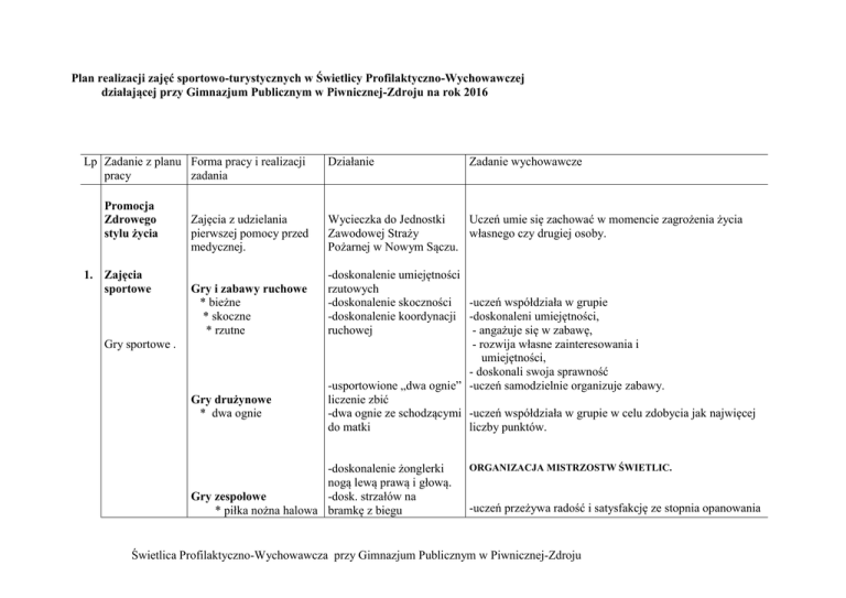 Plan realizacji zajęć sportowo-turystycznych w Świetlicy
