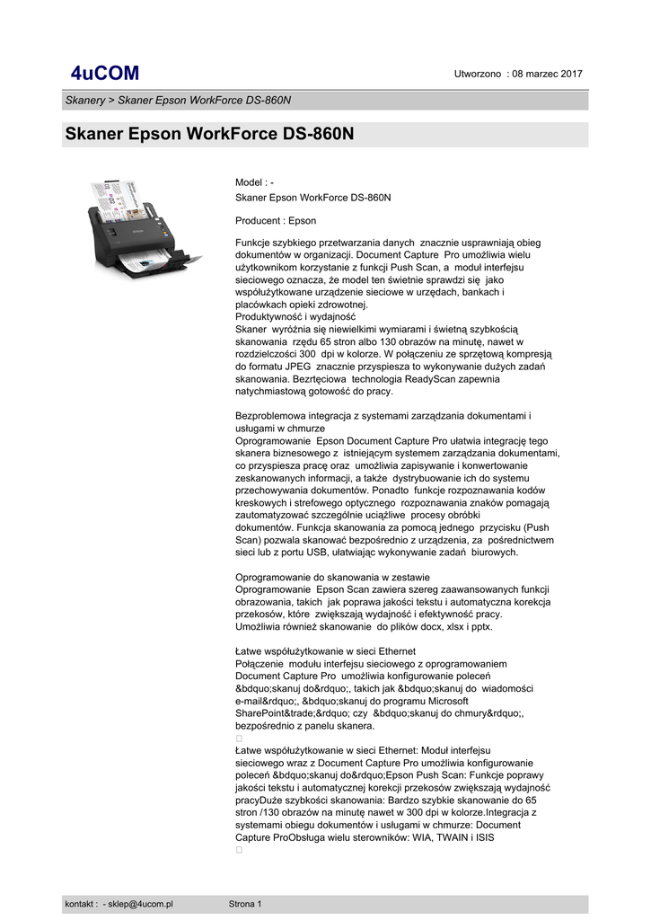 4uCOM Utworzono : 08 marzec 2017 Skanery > Skaner Epson WorkForce DS-860N Skaner Epson WorkForce DS-860N Model : Skaner Epson WorkForce DS-860N Producent : Epson Funkcje szybkiego przetwarzania danych znacznie usprawniają obieg dokumentów w organizacji. Document Capture Pro umożliwia wielu użytkownikom korzystanie z funkcji Push Scan, a moduł interfejsu sieciowego oznacza, że model ten świetnie sprawdzi się jako współużytkowane urządzenie sieciowe w urzędach, bankach i placówkach opieki zdrowotnej. Produktywność i wydajność Skaner wyróżnia się niewielkimi wymiarami i świetną szybkością skanowania rzędu 65 stron albo 130 obrazów na minutę, nawet w rozdzielczości 300 dpi w kolorze. W połączeniu ze sprzętową kompresją do formatu JPEG znacznie przyspiesza to wykonywanie dużych zadań skanowania. Bezrtęciowa technologia ReadyScan zapewnia natychmiastową gotowość do pracy. Bezproblemowa integracja z systemami zarządzania dokumentami i usługami w chmurze Oprogramowanie Epson Document Capture Pro ułatwia integrację tego skanera biznesowego z istniejącym systemem zarządzania dokumentami, co przyspiesza pracę oraz umożliwia zapisywanie i konwertowanie zeskanowanych informacji, a także dystrybuowanie ich do systemu przechowywania dokumentów. Ponadto funkcje rozpoznawania kodów kreskowych i strefowego optycznego rozpoznawania znaków pomagają zautomatyzować szczególnie uciążliwe procesy obróbki dokumentów. Funkcja skanowania za pomocą jednego przycisku (Push Scan) pozwala skanować bezpośrednio z urządzenia, za pośrednictwem sieci lub z portu USB, ułatwiając wykonywanie zadań biurowych. Oprogramowanie do skanowania w zestawie Oprogramowanie Epson Scan zawiera szereg zaawansowanych funkcji obrazowania, takich jak poprawa jakości tekstu i automatyczna korekcja przekosów, które zwiększają wydajność i efektywność pracy. Umożliwia również skanowanie do plików docx, xlsx i pptx. Łatwe współużytkowanie w sieci Ethernet Połączenie modułu interfejsu sieciowego z oprogramowaniem Document Capture Pro umożliwia konfigurowanie poleceń „skanuj do”, takich jak „skanuj do wiadomości e-mail”, „skanuj do programu Microsoft SharePoint™” czy „skanuj do chmury”, bezpośrednio z panelu skanera. � Łatwe współużytkowanie w sieci Ethernet: Moduł interfejsu sieciowego wraz z Document Capture Pro umożliwia konfigurowanie poleceń „skanuj do”Epson Push Scan: Funkcje poprawy jakości tekstu i automatycznej korekcji przekosów zwiększają wydajność pracyDuże szybkości skanowania: Bardzo szybkie skanowanie do 65 stron /130 obrazów na minutę nawet w 300 dpi w kolorze.Integracja z systemami obiegu dokumentów i usługami w chmurze: Document Capture ProObsługa wielu sterowników: WIA, TWAIN i ISIS � kontakt : - [email protected] Strona 1 4uCOM Utworzono : 08 marzec 2017 Skanery > Skaner Epson WorkForce DS-860N Skaner Epson WorkForce DS-860N Cena : 0,00 zł Brutto ( 0,00 zł Netto) Dostępność: Produkt dostępny w naszym sklepie od 13 październik 2014 kontakt : - [email protected] Strona 2