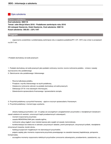 BDO - informacje o szkoleniu Opis szkolenia Dane o szkoleniu Kod szkolenia: 908116 Temat: odw-Akcja bilans 2016 - Podatkowe zamknięcie roku 2016 29 Listopad Zawiercie, Hotel Zawiercie, Kod szkolenia: 908116 Koszt szkolenia: 350.00 + 23% VAT Program - zapoznanie uczestników z problematyką zamknięcia roku w aspekcie podatków(PIT, CIT, VAT) oraz zmian w przepisach na 2017 rok, I Podatek dochodowy od osób prawnych: 1. Podatek dochodowy od osób prawnych jako podatek rozliczany rocznie; roczne rozliczenie podatku - zmiana i zasady wyznaczania roku podatkowego 2. Zakończenie roku podatkowego i bilansowego - Roczna kalkulacja podatku, - Przejście z wyniku bilansowego na wynik podatkowy, - Ostateczne rozliczenie zaliczek na podatek dochodowy od osób prawnych, - Deklaracja CIT-8 i inne obowiązki informacyjne, - Zatwierdzenie sprawozdania finansowego i sprawozdania zarządu. 3. Przychód podatkowy a przychód finansowy - ujęcie w rocznym sprawozdaniu finansowym. 4. Przychód podatkowy i moment jego uzyskania. - otwarty katalog przychodów z art. 12 updop (ze szczególnym uwzględnieniem przychodów z nieodpłatnych świadczeń i zasad ustalania ich wartości, umorzonych bądź przedawnionych zobowiązań) - moment rozpoznania przychodu: - zasada MEMORIAŁOWA jako zasada ogólna, - rozliczanie usług ciągłych oraz metoda kasowa jako wyjątki od zasady memoriałowej, - korekta bieżąca lub wsteczna w zakresie: przyznanych rabatów, premii pieniężnych, otrzymanych próbek, nieodpłatnie otrzymanych towarów, korekt obrotu. - katalog przysporzeń majątkowych nie stanowiących przychodów, - pojęcie zapłaty jako momentu rozpoznania przychodu powstającego na zasadzie kasowej (kapitalizacja, potrącenie, kompensata), - szczególne momenty rozpoznania niektórych przychodów (umorzenie zobowiązania, przedawnienie, zasiedzenie), czy BDO - informacje o szkoleniu umorzenie odsetek skutkuje powstaniem przychodu - moment rozpoznania przychodu lub potrącenia kosztu z tytułu sprzedawanych lub nabywanych usług poręczeń i gwarancji - moment powstania przychodu z tytułu otrzymanej premii pieniężnej 5. Koszty uzyskania przychodu - definicja i zasady rozliczania kosztów w czasie: - koszty związane z przychodem danego roku, - koszty dotyczące lat poprzednich, - koszty przyszłych okresów, - koszty rozliczane kasowo. 6. Koszty sporządzenia i badania rocznego sprawozdania finansowego: - wydatki stanowiące koszty podatkowe, - moment zaliczenia wydatków do kosztów podatkowych. 7. Dokumentowanie kosztów. 8. Koszty podatkowe a koszty bilansowe. 9. Zaliczki na podatek dochodowy opłacane w trakcie roku: - uproszczone zaliczki na podatek dochodowy, - zwykłe zaliczki na podatek dochodowy, - konsekwencje błędnego naliczenia zaliczek na podatek dochodowy, - błędne zaliczki po zakończeniu roku - czy korygować? 10. Zakupy od podmiotów zagranicznych i obowiązki płatnika - podatek u źródła. 11. Obliczenie podatku: - stawka podatku, - odliczenia od dochodu, - dochody osiągane za granicą RP. 12. Zeznanie roczne. 13. Zmiany przepisów obowiązujących od 1.01.2015 r.: BDO - informacje o szkoleniu - opodatkowanie dochodów niektórych zagranicznych spółek kontrolowanych przez krajowe podmioty - CFC - zasady dotyczące niedostatecznej kapitalizacji, - instytucja kredytu podatkowego dla rozpoczynających działalność gospodarczą, - nowa definicja zysków niepodzielonych, przy przekształcaniu spółek - nowy zakres przypadków przekazywania administracji podatkowej informacji o dochodach podatników wyłącznie drogą elektroniczną - certyfikat rezydencji w rozliczeniach podatkowych II. Podatek dochodowy od osób fizycznych dla osób prawnych: 1. Pracodawca jako płatnik podatku dochodowego od osób fizycznych: - terminy zapłaty podatku, - deklaracje i informacje w trakcie roku, - roczne deklaracje i informacje. 2. Przychód pracownika i zleceniobiorcy: - moment uzyskania, - źródło, - koszty 3. Pobór zryczałtowanego podatku, w tym podatku pobieranego u źródła a obowiązki roczne (PIT-8AR, IFT-1) (CIT-10Z, IFT-2) III. NOWELIZACJA VAT 1. poszerzony katalog towarów objętych odwrotnym obciążeniem - warunki stosowania 2. nowy załącznik 11 3. limit wartości umowy > 20 000,4. transakcje jednolite - jak interpretować - informacje podsumowujące krajowe (VAT-27) BDO - informacje o szkoleniu - rozszerzony załącznik 13 - odpowiedzialność solidarna - nowe regulacje - nowe zasady rozliczania podatku naliczonego przy sprzedaży mieszanej - ustalanie proporcji - VAT naliczony od wydatków związanych z działalnością gospodarczą i czynnościami pozostającymi poza VAT - ulga na złe długi - nowe wzory deklaracji VAT-7(15), VAT-7K, VAT-7D, VAT-28 - zasady wypełniania - komornicy sądowi podatnikami VAT IV. Jednolity Plik Kontrolny - nowe zasady przeprowadzania kontroli - prowadzenie ksiąg podatkowych przy użyciu programów komputerowych - przekazanie ksiąg oraz dowodów księgowych w formie elektronicznej. - struktura logiczna jednolitego pliku kontrolnego (JPK). - sposób przesyłania za pomocą środków komunikacji elektronicznej ksiąg - podatkowych, części tych ksiąg oraz dowodów księgowych w postaci - elektroniczne oraz wymagania techniczne. - Wdrożenie JPK w ciągu roku obrotowego. - dane za okresy sprzed 1 lipca 2016 r. - podział na dużych, średnich, małych i mikro przedsiębiorców w rozumieniu Ustawy o swobodzie działalności gospodarczej - inne zagadnienia dotyczące struktur JPK. - raportowanie JPK - wyjaśnienia MF - rejestry VAT a JPK Prowadzący Henryk Grychtoł doświadczony doradca podatkowy, właściciel Kancelarii Podatkowej i Biura Rachunkowego, wieloletni wykładowca szkoleń z zakresu: prawa podatkowego i księgowości, cen transferowych - dokumentacji podatkowej. Wybitny specjalista w zakresie prawa podatkowego, rachunkowości i sprawozdawczości finansowej Informacje organizacyjne Kalendarz zajęć: Informacje i zgłoszenia