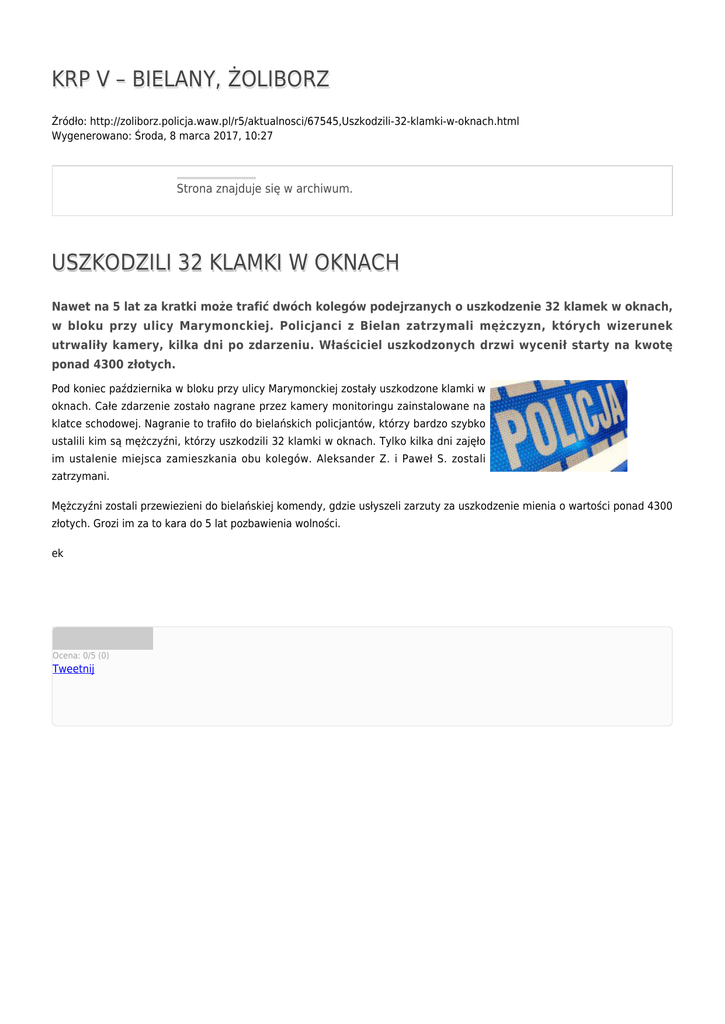 KRP V – BIELANY, ŻOLIBORZ Źródło: http://zoliborz.policja.waw.pl/r5/aktualnosci/67545,Uszkodzili-32-klamki-w-oknach.html Wygenerowano: Środa, 8 marca 2017, 10:27 Strona znajduje się w archiwum. USZKODZILI 32 KLAMKI W OKNACH Nawet na 5 lat za kratki może trafić dwóch kolegów podejrzanych o uszkodzenie 32 klamek w oknach, w bloku przy ulicy Marymonckiej. Policjanci z Bielan zatrzymali mężczyzn, których wizerunek utrwaliły kamery, kilka dni po zdarzeniu. Właściciel uszkodzonych drzwi wycenił starty na kwotę ponad 4300 złotych. Pod koniec października w bloku przy ulicy Marymonckiej zostały uszkodzone klamki w oknach. Całe zdarzenie zostało nagrane przez kamery monitoringu zainstalowane na klatce schodowej. Nagranie to trafiło do bielańskich policjantów, którzy bardzo szybko ustalili kim są mężczyźni, którzy uszkodzili 32 klamki w oknach. Tylko kilka dni zajęło im ustalenie miejsca zamieszkania obu kolegów. Aleksander Z. i Paweł S. zostali zatrzymani. Mężczyźni zostali przewiezieni do bielańskiej komendy, gdzie usłyszeli zarzuty za uszkodzenie mienia o wartości ponad 4300 złotych. Grozi im za to kara do 5 lat pozbawienia wolności. ek Ocena: 0/5 (0) Tweetnij