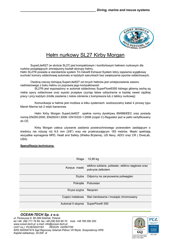 ___________________________________________ Diving, marine and rescue systems Hełm nurkowy SL27 Kirby Morgan SuperLite®27 (w skrócie SL27) jest kompaktowym i komfortowym hełmem nurkowym dla nurków pożądających zmniejszony kształt skorupy hełmu. Hełm SL27® posiada w standardzie system Tri-Valve® Exhaust System który zapewnia wyjątkową suchość komory oddechowej automatu w każdych warunkach bez zwiększania oporów oddechowych. Osobną rzeczą różniącą SuperLite®27 od innych hełmów jest umiejscowienie zaworu nadmiarowego z boku hełmu co poprawia jego kompaktowość SL27® jest wyposażony w automat oddechowy SuperFlow®350 którego główną cechą są niskie opory oddechowe oraz wysoki przepływ czyniąc łatwe oddychanie w każdej nawet ciężkiej pracy i przy każdym źródle zasilania ( niskie ciśnienie z kompresora lub z tablicy nurkowej) Komunikacja w hełmie jest możliwa w kilku systemach: wodoszczelny kabel 4 pinowy typu Marsh Marine lub 2 wtyki bananowe. Hełm Kirby Morgan SuperLite®27 spełnia normy dyrektywy 89/686/EEC oraz posiada normę EN250:2000, EN250/A1:2006 i EN15333-1:2008 (część C).Regulator jest w pełni certyfikowany do CE. Kirby Morgan zaleca używanie zasilania powierzchniowego przewodem zasilającym o średnicy nie niższej niż 9,5 mm (3/8”) oraz nie przekraczającym 183 metrów. Maski spełniają wszystkie wymagania NPD, Healt and Safety (Wielka Brytania), US Navy, ADCI oraz CR ( DiveLab, USA) Specyfikacja techniczna: Waga Korpus maski Szyba Pokrętła Kryza szyjna Części metalowe Automat II stopnia 12,90 kg włókno szklane, poliester, włókno węglowe oraz pokrycie żelkotem Odporny na zarysowania poliwęglan Poliuretan Neopren Stal nierdzewna i mosiądz chromowany SuperFlow® 350 OCEAN-TECH Sp. z o.o. ul. Perseusza 9, 80-299 Gdańsk, Poland. tel.+48 (58) 711 76 85, fax +48 (58) 620 85 70 mob. +48 785 050 250 www.ocean-tech.pl e-mail: [email protected] (VAT no.) PL5833023163 REGON 220597795 KRS 0000547474 Sąd Rejonowy Gdańsk-Północ VII Wydz. Gospodarczy KRS Kapitał zakładowy: 20.000 zł ___________________________________________ Diving, marine and rescue systems Aplikacje: - prace podwodne - służby ratownicze - wojsko, policja, straż pożarna Dodatkowe akcesoria: Nakładka do spawania – nr kat. 525-403 Tuleja ochronna na bolec zamykający zapobiegająca zaczepom sieci, linek itp. nr kat: 550-232 Restryktor przepływu do wolnego portu LP zapobiegający nadmiernemu wypływowi powietrza przypadku awarii nr kat. 555-210 Szkolenie: Możliwe jest przeprowadzenie szkolenia z użycia oraz serwisu Certyfikacja: - EN 250 - EN 15333 - US Navy Numery katalogowe do zamówienia: SL®27 z komunikacją 4pin 500-041 OCEAN-TECH Sp. z o.o. ul. Perseusza 9, 80-299 Gdańsk, Poland. tel.+48 (58) 711 76 85, fax +48 (58) 620 85 70 mob. +48 785 050 250 www.ocean-tech.pl e-mail: [email protected] (VAT no.) PL5833023163 REGON 220597795 KRS 0000547474 Sąd Rejonowy Gdańsk-Północ VII Wydz. Gospodarczy KRS Kapitał zakładowy: 20.000 zł ___________________________________________ Diving, marine and rescue systems SL®27 z komunikacją wtyki bananowe 500-040 OCEAN-TECH Sp. z o.o. ul. Perseusza 9, 80-299 Gdańsk, Poland. tel.+48 (58) 711 76 85, fax +48 (58) 620 85 70 mob. +48 785 050 250 www.ocean-tech.pl e-mail: [email protected] (VAT no.) PL5833023163 REGON 220597795 KRS 0000547474 Sąd Rejonowy Gdańsk-Północ VII Wydz. Gospodarczy KRS Kapitał zakładowy: 20.000 zł