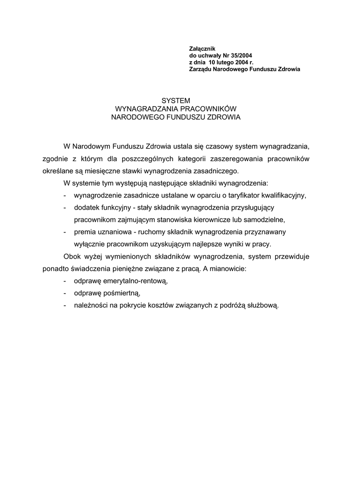 Załącznik do uchwały Nr 35/2004 z dnia 10 lutego 2004 r. Zarządu Narodowego Funduszu Zdrowia SYSTEM WYNAGRADZANIA PRACOWNIKÓW NARODOWEGO FUNDUSZU ZDROWIA W Narodowym Funduszu Zdrowia ustala się czasowy system wynagradzania, zgodnie z którym dla poszczególnych kategorii zaszeregowania pracowników określane są miesięczne stawki wynagrodzenia zasadniczego. W systemie tym występują następujące składniki wynagrodzenia: - wynagrodzenie zasadnicze ustalane w oparciu o taryfikator kwalifikacyjny, - dodatek funkcyjny - stały składnik wynagrodzenia przysługujący pracownikom zajmującym stanowiska kierownicze lub samodzielne, - premia uznaniowa - ruchomy składnik wynagrodzenia przyznawany wyłącznie pracownikom uzyskującym najlepsze wyniki w pracy. Obok wyżej wymienionych składników wynagrodzenia, system przewiduje ponadto świadczenia pieniężne związane z pracą. A mianowicie: - odprawę emerytalno-rentową, - odprawę pośmiertną, - należności na pokrycie kosztów związanych z podróżą służbową.