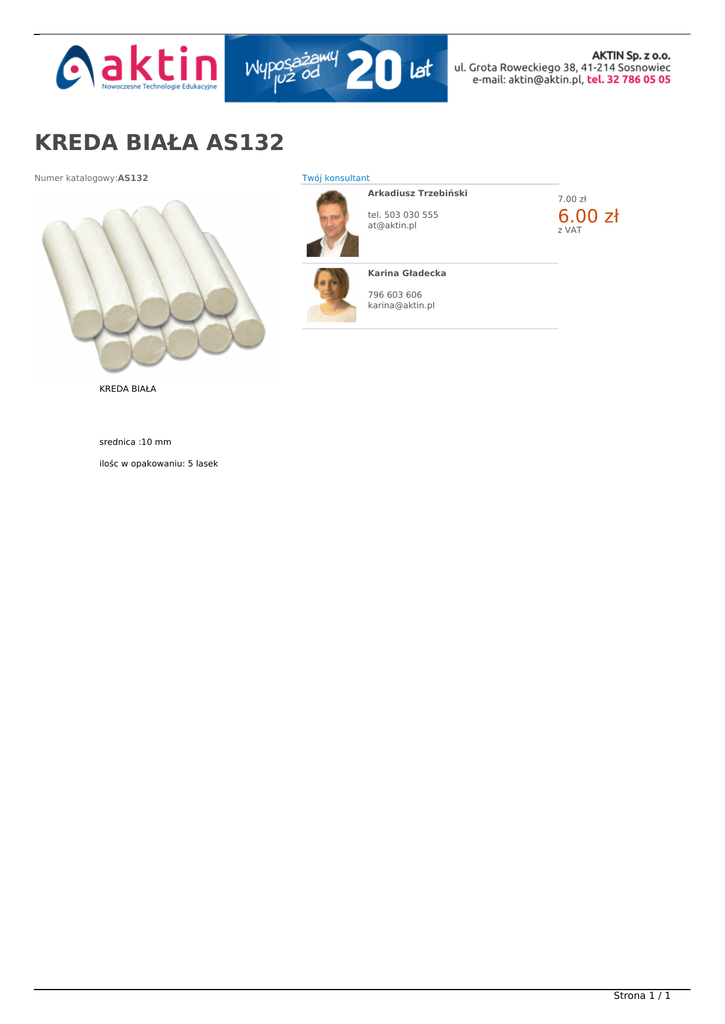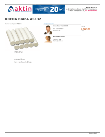KREDA BIAŁA AS132 Numer katalogowy:AS132 Twój konsultant Arkadiusz Trzebiński tel. 503 030 555 [email protected] NOWOŚĆ W OFERCIE 7.00 zł 6.00 zł z VAT Karina Gładecka 796 603 606 [email protected] KREDA BIAŁA srednica :10 mm ilośc w opakowaniu: 5 lasek Strona 1 / 1 Powered by TCPDF (www.tcpdf.org)