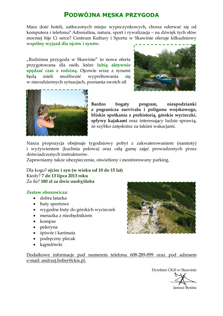 PODWÓJNA MĘSKA PRZYGODA Masz dość hoteli, zatłoczonych miejsc wypoczynkowych, chcesz oderwać się od komputera i telefonu? Adrenalina, natura, sport i rywalizacja – na dźwięk tych słów mocniej bije Ci serce? Centrum Kultury i Sportu w Skawinie oferuje kilkudniowy wspólny wyjazd dla ojców i synów. „Rodzinna przygoda w Skawinie” to nowa oferta przygotowana dla osób, które lubią aktywnie spędzać czas z rodziną. Ojcowie wraz z synami będą mieli możliwość wypróbowania się w niecodziennych sytuacjach, poznania swoich sił. Bardzo bogaty program, niespodzianki z pogranicza survivalu i poligonu wojskowego, bliskie spotkania z prehistorią, górskie wycieczki, spływy kajakami oraz interesujący ludzie sprawią, że szybko zatęsknisz za takimi wakacjami. Nasza propozycja obejmuje tygodniowy pobyt z zakwaterowaniem (namioty) i wyżywieniem (kuchnia polowa) oraz całą gamę zajęć prowadzonych przez doświadczonych instruktorów. Zapewniamy także ubezpieczenie, oświetlony i monitorowany parking. Dla kogo? ojciec i syn (w wieku od 10 do 15 lat) Kiedy? 7 do 13 lipca 2013 roku Za ile? 180 zł za dwie osoby/doba Zestaw obozowicza: dobra latarka buty sportowe wygodne buty do górskich wycieczek menażka z niezbędnikiem kompas peleryna śpiwór i karimata podręczny plecak kąpielówki Dodatkowe informacje pod numerem telefonu 608-289-899 oraz pod adresem e-mail: [email protected]. Dyrektor CKiS w Skawinie Janusz Bysina