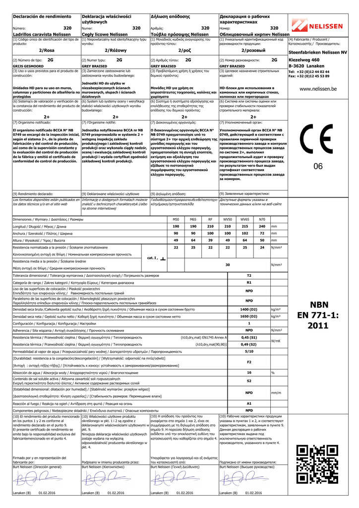 Declaración de rendimiento Deklaracja właściwości użytkowych 320 Ladrillos caravista Nelissen Numer: Número: 320 Cegły licowe Nelissen (1) Código único de identificación del tipo de (1) Niepowtarzalny kod identyfikacyjny typu producto: wyrobu: 2/Rosa (2) Número de tipo: 2G ∆ήλωση απόδοσης Декларация о рабочих характеристиках Αριθµός: 320 Τούβλα πρόσοψης Nelissen Номер: (1) Μοναδικός κωδικός αναγνώρισης του προϊόντος-τύπου: (1) Уникальный идентификационный код разновидности продукции: 2/Różowy 2/ροζ 2G (2) Numer typu: 320 Облицовочный кирпич Nelissen 2/розовый 2G (2) Αριθµός τύπου: Steenfabrieken Nelissen NV 2G (2) Номер разновидности: GRIJS GESMOORD (3) Uso o usos previstos para el producto de construcción: GREY BRAISED (3) Zamierzone zastosowanie lub zastosowania wyrobu budowlanego: GREY BRAISED (3) Προβλεπόµενη χρήση ή χρήσεις του δοµικού προϊόντος: GREY BRAISED (3) Целевое назначение строительных изделий: Unidades HD para su uso en muros, columnas y particiones de albañilería no protegidos (6) Sistema/s de valoración y verificación de la constancia del rendimiento del producto de construcción: Jednostki HD do użytku w niezabezpieczonych ścianach murowanych, słupach i ścianach działowych (6) System lub systemy oceny i weryfikacji stałości właściwości użytkowych wyrobu budowlanego: Μονάδες HD για χρήση σε απροστάτευτες τοιχοποιίες, κολόνες και χωρίσµατα (6) Σύστηµα ή συστήµατα αξιολόγησης και επαλήθευσης της σταθερότητας της απόδοσης του δοµικού προϊόντος: HD-блоки для использования в каменных или кирпичных стенах, колоннах или перегородках (6) Система или системы оценки или проверки стабильности показателей строительного материала: 2+ 2+ 2+ (7) l’Organisme notifié: (7) ∆ιακοινωµένος οργανισµός: (7) Уполномоченный орган: El organismo notificado BCCA N° NB 0749 se encargó de la inspección inicial, según el sistema 2+, de la planta de fabricación y del control de producción, así como de la supervisión constante y la evaluación del control de producción de la fábrica y emitió el certificado de conformidad de control de producción. Jednostka notyfikowana BCCA nr NB 0749 przeprowadziła w systemie 2 + wstępną inspekcję zakładu produkcyjnego i zakładowej kontroli produkcji oraz wykonała ciągły nadzór, ocenę i ewaluację zakładowej kontroli produkcji i wydała certyfikat zgodności zakładowej kontroli produkcji. Ο διακοινωµένος οργανισµός BCCA N° NB 0749 πραγµατοποίησε υπό το σύστηµα 2+ την αρχική επιθεώρηση της µονάδας παραγωγής και του εργοστασιακού ελέγχου παραγωγής, πραγµατοποίησε τη συνεχή εποπτεία, εκτίµηση και αξιολόγηση του εργοστασιακού ελέγχου παραγωγής και εξέδωσε το πιστοποιητικό συµµόρφωσης του εργοστασιακού ελέγχου παραγωγής. Уполномоченный орган BCCA N° NB 0749, действующий в соответствии с правилами первичной проверки производственного завода и контроля производственных процессов завода по системе 2+, выполнил продолжительный аудит и проверку производственного процесса завода, по результатам чего был выдан сертификат соответствия производственных процессов завода за номером. (9) ∆ηλωµένη απόδοση: (9) Заявленные характеристики: (9) Deklarowane właściwości użytkowe Los formatos disponibles están publicados en Informację o dostępnych formatach możecie los datos técnicos y/o en el sitio web znaleźć u technicznych charakterystyk i/albo na stronie internetowej Kiezelweg 460 B-3620 Lanaken Tel: +32 (0)12 44 02 44 Fax: +32 (0)12 45 53 89 www.nelissen.be 2+ (7) Organismo notificado: (9) Rendimiento declarado: (4) Fabricante / Producent / Κατασκευαστής / Производитель: 06 Γιαδιαθέσιµααντίγραφααπευθυνθείτεστοτεχνι Доступные форматы указаны в κότµήµακαι/ηστηνιστοσελίδα технических данных и/или на веб-сайте Dimensiones / Wymiary / ∆ιαστάσεις / Размеры M50 M65 RF WV50 WV65 N70 Longitud / Długość / Μήκος / Длина 190 190 210 210 215 240 mm Anchura / Szerokość / Πλάτος / Ширина 90 90 100 100 102 72 mm Altura / Wysokość / Ύψος / Высота 49 64 39 49 64 50 mm Resistencia normalizada a la presión / Ściskanie znormalizowane 22 25 22 22 25 24 N/mm² Κανονικοποιηµένη αντοχή σε θλίψη / Номинальная компрессионная прочность cat. I , Resistencia media a la presión / Ściskanie średnie ﬩ 30 N/mm² Μέση αντοχή σε θλίψη / Средняя компрессионная прочность Tolerancia dimensional / Tolerancja wymiarowa / ∆ιαστασιολογική ανοχή / Погрешность размеров T2 Cat