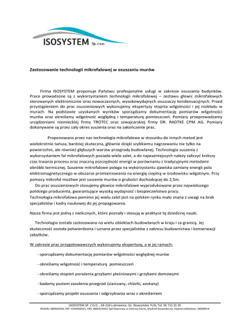 Zastosowanie technologii mikrofalowej w osuszaniu murów Firma ISOSYSTEM proponuje Państwu profesjonalne usługi w zakresie osuszania budynków. Prace prowadzone są z wykorzystaniem technologii mikrofalowej – zestawu głowic mikrofalowych sterowanych elektronicznie oraz nowoczesnych, wysokowydajnych osuszaczy kondensacyjnych. Przed przystąpieniem do prac osuszeniowych wykonujemy ekspertyzy stopnia wilgotności i jej rozkładu w murach. Na podstawie uzyskanych wyników sporządzamy dokumentację pomiarów wilgotności murów oraz określamy wilgotność względną i temperaturę pomieszczeń. Pomiary przeprowadzamy urządzeniami niemieckiej firmy TROTEC oraz szwajcarskiej firmy DR. RADTKE CPM AG. Pomiary dokonywane są przez cały okres suszenia oraz na zakończenie prac. Proponowana przez nas technologia mikrofalowa w stosunku do innych metod jest wielokrotnie tańsza, bardziej skuteczna, głównie dzięki szybkiemu nagrzewaniu nie tylko na powierzchni, ale również głębszych warstw przegrody budowlanej. Technologia suszenia z wykorzystaniem fal mikrofalowych posiada wiele zalet, a do najważniejszych należy zaliczyć krótszy czas trwania procesu oraz znaczną oszczędność energii w porównaniu z tradycyjnymi metodami obróbki termicznej. Suszenie mikrofalowe polega na wykorzystaniu zjawiska zamiany energii pola elektromagnetycznego w obszarze promieniowania na energię cieplną w środowisku wilgotnym. Przy pomocy mikrofal możliwe jest suszenie murów o grubości dochodzącej do 2,5m. Do prac osuszeniowych stosujemy głowice mikrofalowe wyprodukowane przez najwiekszego polskiego producenta, gwarantujące wysoką wydajność i bezpieczeństwo pracy. Technologia mikrofalowa pomimo jej wielu zalet jest na polskim rynku mało znana z uwagi na brak specjalistów i kadry naukowej do jej propagowania. Nasza firma jest jedną z nielicznych, które poznały i stosują w praktyce tę dziedzinę nauki. Technologia została zastosowana na wielu obiektach budowlanych w kraju i za granicą. Jej skuteczność została potwierdzona i uznana przez specjalistów z zakresu budownictwa i konserwacji zabytków. W zakresie prac przygotowawczych wykonujemy ekspertyzę, a w jej ramach: - sporządzamy dokumentację pomiarów wilgotności względnej murów - określamy wilgotność i temperaturę pomieszczeń - określamy stopień porażenia grzybami pleśniowymi i grzybami domowymi - badamy poziom zasolenia przegród (siarczany, chlorki, azotany) - sporządzamy projekt osuszania i odgrzybiania wraz z określeniem ISOSYSTEM SP. Z O.O. , 69-210 Lubniewice, Os. Słowiańskie 7c/6, Tel. 95 715 35 35 REGON: 080963934, NIP: 4290068421, KRS: 0000419262 Sąd Rejonowy w Zielonej Górze, Wydział Gospodarczy, Kapitał zakładowy: 10000PLN kosztów usługi Dokumentacja ta może na żądanie zlecającego zawierać również: 1. Plany sytuacyjne z zaznaczeniem punktów pomiarowych. 2. Opis alternatywnych technologii do wykonania powierzonych prac. 3. Dokumentację zdjęciową. Po akceptacji inwestora przeprowadzamy prace osuszenia budynków. Dzięki zastosowaniu głowic mikrofalowych usuwamy wilgoć z elementów budowlanych (beton, cegła, drewno) oraz niszczymy grzyby pleśniowe zapobiegając tym korozji biologicznej budynku oraz alergiom mieszkańców. Opis technologii Głowice mikrofalowe dzięki zastosowanym magnetronom emitują fale o częstotliwości 2,45 GHz. Fale o tej częstotliwości są wystarczająco długie (= niska częstotliwość), aby móc wnikać w materiał wystarczająco głęboko w całą objętość, a równocześnie wystarczająco krótkie (= wysoka częstotliwość) by przenieść energię potrzebną do wprawienia molekuł w drgania. Zjawisko objętościowego rozgrzewania materiałów za pomocą mikrofal oparte jest na absorpcji energii promieniowania. Molekuły wody, białka, tłuszczu, większość żywic w silnym polu elektromagnetycznym zaczynają drgać z tą samą częstotliwością, co pole elektromagnetyczne. Drgania prowadzą do tarcia cząstek materii i wydzielenia się ciepła. Woda bardzo skutecznie pochłania energię mikrofal, kilka tysięcy razy mocniej niż suchy materiał. Dzięki temu woda nagrzewa się, wzrasta prężność par w murze i następuje wypychanie wody z przegrody. Zaletą tej metody jest również to, że mikrofale nagrzewają równomiernie mur w całym przekroju, dzięki temu, że mogą wnikać do jego wnętrza. Inne technologie ogrzewają jedynie powierzchnię. Ta cecha decyduje o tym, że osuszanie obiektów budowlanych promieniowaniem mikrofalowym w stosunku do innych metod jest wielokrotnie tańsze i bardziej skuteczne. Na efektywność tej metody nie ma wpływu temperatura otoczenia, stopień zasolenia i zawilgocenia murów. Prawidłowo wykonane osuszanie nie niszczy struktury murów oraz nie uszkadza instalacji wewnątrz przegrody. Zalety sprawiają, że mikrofale nieocenione są również w ratowaniu zabytków, fresków i polichromii oraz starodruków. Należy zwrócić uwagę na fakt, że wykonanie izolacji przeciwwilgociowej poziomej i pionowej nie rozwiązuje problemu wody w murze. Izolacje te zabezpieczają przed przenikaniem wody do murów. Jednak woda obecna już w murze wymaga działań zmierzających do jej usunięcia. Dlatego też zalecamy jako nieodłączną część procesu izolacji wykonanie osuszania murów wspomaganych głowicami mikrofalowymi. Należy podkreślić, że niedopuszczalne jest wykonywanie prac tynkarskich, malarskich i termoizolacyjnych na zawilgoconych ścianach. Przybliżony czas naturalnego wysychania murów budynku, oczywiście przy prawidłowo założonej izolacji pionowej od strony zewnętrznej i poziomej (zależy od wielu czynników) i może wynosić 4-6, a w najgorszym przypadku do 9 lat. Jak widać właściwy proces osuszania budynku nie powinien kończyć się na prawidłowym wykonaniu izolacji pionowej i poziomej lecz powinien również przewidywać działania usunięcia wody już zalegającej w murach. Najlep