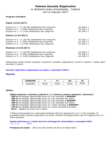 Halowe Zawody Regionalne w skokach przez przeszkody - Leszno 10-12 marzec 2017 Program zawodów: Piątek (10.03.2017) Konkurs nr 1 – LL (do 90) dokładności bez rozgrywki Konkurs nr 2 – L (100) dokładności bez rozgrywki Konkurs nr 3 – L1 (105) dokładności bez rozgrywki art.238.1.1 art.238.1.1 art.238.1.1 Sobota (11.03.2017) Konkurs nr 4 – LL (do 90) dokładności bez rozgrywki Konkurs nr 5 – L (100) dokładności bez rozgrywki Konkurs nr 6 – L1 (105) dokładności bez rozgrywki art.238.1.1 art.238.1.1 art.238.1.1 Niedziela (12.03.2017) Konkurs nr 7 – LL (do 90) dokładności bez rozgrywki Konkurs nr 8 – L (100) dokładności bez rozgrywki Konkurs nr 9 – L1 (105) dokładności bez rozgrywki art.238.1.1 art.238.1.1 art.238.1.1 Maksymalna liczba startów podczas 3-dniowych zawodów regionalnych wynosi 6 startów ( każdy dzień zawodów 2 starty). Zawody regionalne rozgrywane są razem z zawodami HZO1* Nagrody: KONKURS I II III LL/L/L1 floots floots floots IV floots Opłaty: Opłata wpisowa i startowa (pakiet 3, 2 i 1 dniowy zawiera wpisowe i startowe): - 500 zł od każdego zgłoszonego konia na 3 dni zawodów z BOKSEM - 280 zł od każdego zgłoszonego konia na 3 dni zawodów bez boksu - 400 zł od każdego zgłoszonego konia na 2 dni zawodów z BOKSEM - 200 zł od każdego zgłoszonego konia na 2 dni zawodów bez boksu - 220 zł od każdego zgłoszonego konia na 1 dzień zawodów z BOKSEM* - 120 zł od każdego zgłoszonego konia na 1 dzień zawodów bez boksu - 60 zł – dopłata za trociny (za 1 balot) * Boksy przyznawane są w pierwszej kolejności dla koni zgłoszonych na 2 i 3 dni zawodów. W przypadku braku boksów organizator ma prawo odmówić wynajęcie boksu dla koni zgłoszonych na 1 dzień zawodów. Opłata startowa za 1 dzień dla koni startujących równolegle w zawodach HZO: - LL, L, L1 - 50 zł Przyłącze do prądu – 180 zł za całe zawody lub 60 zł za każdy dzień KONTO: Jeździecki Klub Sportowy Przybyszewo przy Wyższej Szkole Marketingu i Zarządzania w Lesznie ul. Ostroroga 9a, 64-100 Leszno BZ WBK S.A. o/Leszno 14 1090 1245 0000 0000 2404 0389 z dopiskiem: ZAWODY Regionalne (z datą zawodów i nazwą konia) Osoby oficjalne: Przewodniczący: Tadeusz Ludwiczak Sędzia WZJ: Jolanta Imalska Raczak Sędzia: Andrzej Cieślak Szef Komisarzy: Grzegorz Kwaczyński Komisarze: Joanna Mularczyk Gospodarz Toru: Łukasz Jankowski Asystent Gospodarza Toru: Roman Sobkowiak Lekarz weterynarii zawodów: Michał Grunwald, tel.: 602-231-314 Sprawy organizacyjne 1. Parkur ziemny – piasek kwarcowy z włókniną JS-Grandi, rozprężalnia – piasek kwarcowy z włókniną WZS-Grandi. 2. Wymagana dokumentacja zgodna z przepisami i regulaminem PZJ – zawodnicy i konie. 3. Wymagane aktualne badania koni i zawodników. 4. Organizator nie ponosi odpowiedzialności za kradzieże, wypadki i inne szkody mogące wyniknąć w trakcie transportu i uczestnictwa w zawodach. 5. Zalecane ubezpieczenie koni oraz następstw od innych zdarzeń losowych. 6. Zgłoszenia wyłącznie przez stronę www.zawodykonne.com na 4 dni przed zawodami, tj. do poniedziałku do godz. 12.00. Powyższy termin przesyłania zgłoszeń oraz przedpłaty dotyczy również zgłoszeń dokonywanych tylko na sobotę lub niedzielę. Przedpłata (opłata minimalna) za poszczególne pakiety: - za za za za za za każdego każdego każdego każdego każdego każdego zgłoszonego zgłoszonego zgłoszonego zgłoszonego zgłoszonego zgłoszonego konia konia konia konia konia konia na na na na na na 3 3 2 2 1 1 dni zawodów z BOKSEM – przedpłata 300 zł dni zawodów bez boksu – przedpłata 200 zł dni zawodów z BOKSEM – przedpłata 300 zł dni zawodów bez boksu – przedpłata 100 zł dzień zawodów z BOKSEM* – przedpłata 200 zł dzień zawodów bez boksu – przedpłata 100 zł * Boksy przyznawane są w pierwszej kolejności dla koni zgłoszonych na 2 i 3 dni zawodów. W przypadku braku boksów organizator ma prawo odmówić wynajęcie boksu dla koni zgłoszonych na 1 dzień zawodów. Przedpłata (opłata minimalna) jest kosztem przygotowania organizatora do zawodów. Opłaty wpisowe oraz za boksy nie podlegają zwrotowi w wypadku rezygnacji ze startów w zawodach (niezależnie od przyczyny), zgłoszonej od poniedziałku po godzinie 12-tej. W przypadku braku wpłaty na koncie w odpowiednim terminie - opłaty za boksy i wpisowe opłacane na miejscu x 2. W przypadku nie przestrzegania ww. warunków możemy odmówić wzięcia udziału w zawodach. Na zgłoszeniu należy podać adres e-mail lub telefon kontaktowy osoby zgłaszającej. tel. 526-32-00 e-mail: [email protected] 7. W stajniach mogą przebywać tylko osoby biorące udział w zawodach (jeździec, trener, luzak, właściciel konia) oraz konie mające wykupione boksy. 8. Dokonanie zmiany w zapisach do k0onkursu (po opublikowaniu list startowych) za zgodą sędziego głównego: 30 zł (nie dotyczy skreśleń). Organizator nie odpowiada za złe zapisy dokonane przez zgłaszającego. 9. Listy startowe na stronie internetowej od czwartku – godz. 20.00 www.jksprzybyszewo.com 10. Noclegi - CENY DLA UCZESTNIKÓW ZAWODÓW: Hotel „Ach To Tu” (2,5 km) - tel/fax 65 526 99 40/41, tel. kom. 606-302-525, e-mail: [email protected] NIŻSZE CENY DLA UCZESTNIKÓW ZAWODÓW: - pokój 1 osobowy - 105 zł - pokój 2 osobowy - 140 zł - pokój 3 osobowy - 180 zł - śniadanie (szwedzki stół) - 15 zł Hotel Sandro Silver (100 m) - tel. 65 526 99 15/28, e-mail: [email protected] - pokój 1 osobowy - 280 zł (ze śniadaniem) - pokój 2 osobowy - 360 zł (ze śniadaniem) - apartament – 450-500 zł dla dwóch osób (ze śniadaniem) NA TERENIE OŚRODKA PSY MOGĄ PORUSZAĆ SIĘ TYLKO NA SMYCZY!!! WŁAŚCICIEL ZOBOWIĄZANY JEST DO SPRZĄTANIA PO SWOIM PUPILU I ODPOWIADA ZA SZKODY WYRZĄDZONE PRZEZ ZWIERZĘ ZAKAZ PALENIA NA HALI, ROZPRĘŻALNI I W STAJNIACH !!!! PARKOWANIE NA WYZNACZONYCH MIEJSCACH PARKINGOWYCH DLA KONIOWOZÓW, PRZYCZEP I TRAILERÓW. Propozycje zat
