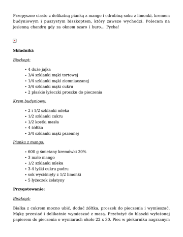 Przepyszne ciasto z delikatną pianką z mango i odrobiną soku z limonki, kremem budyniowym i puszystym biszkoptem, który zawsze wychodzi. Polecam na jesienną chandrę gdy za oknem szaro i buro… Pycha! Składniki: Biszkopt: 4 duże jajka 3/4 szklanki mąki tortowej 1/4 szklanki mąki ziemniaczanej 3/4 szklanki mąki cukru 2 płaskie łyżeczki proszku do pieczenia Krem budyniowy: 2 i 1/2 szklanki mleka 1/2 szklanki cukru 1/2 kostki masła 4 żółtka 3/4 szklanki mąki pszennej Pianka z mango: 600 g śmietany kremówki 30% 3 małe mango 1/2 szklanki mleka 3-4 łyżki cukru pudru sok wyciśnięty z 1/2 limonki 5 łyżeczek żelatyny Przygotowanie: Biszkopt: Białka z cukrem mocno ubić, dodać żółtka, proszek do pieczenia i wymieszać. Mąkę przesiać i delikatnie wymieszać z masą. Przełożyć do blaszki wyłożonej papierem do pieczenia o wymiarach około 22 x 30. Piec w piekarniku nagrzanym do 170°C przez około 20-25 minut. Ostudzić. Krem budyniowy: Zagotować 1,5 szklanki mleka. Mąkę, cukier, żółtka, 1 szklankę mleka zmiksować i powoli dolewać do gorącego mleka, przez cały czas mieszając. Gotować na najmniejszym ogniu stale mieszając, aż budyń zgęstnieje. Schłodzić i zmiksować z masłem na gładki krem. Pianka z mango: Do rondelka wlać zimne mleko i wsypać żelatynę. Odstawić do napęcznienia. Następnie postawić na gaz i podgrzewać do całkowitego rozpuszczenia żelatyny (nie wolno zagotować!). Ostudzić. Mango obrać, usunąć pestki i zmiksować na gładki mus. Śmietanę ubić z cukrem pudrem, dodać mus z mango, sok z limonki i delikatnie wymieszać. Kilka łyżek dodać do mleka z żelatyną, wymieszać i przełożyć do ubitej śmietany z mango, delikatnie wszystko mieszając. Na ostudzonym biszkopcie równo rozprowadzić krem budyniowy. Na wierzch wylać przygotowaną piankę z mango i wyrównać. Wstawić do lodówki na kilka godzin, aż pianka stężeje. Udekorować wedle uznania. Smacznego Sezon na truskawki w pełni, więc przygotowałam tartę na kruchym, maślanym spodzie z kremem budyniowym, serkiem mascarpone i truskawkami. Tarta wyszła pyszna, niestety… szybko znikła Składniki: Kruche ciasto: 1 i 3/4 szklanki mąki pszennej 5 żółtek 140 g masła 3 łyżki cukru pudru szczypta soli Krem waniliowy: 2 i 1/2 szklanki mleka 1/2 szklanki cukru 3/4 szklanki mąki pszennej 4 żółtka 250 g serka mascarpone 1 laska wanilii Dodatkowo: około 1/2 kg truskawek Przygotowanie: Kruche ciasto: Do miski przesiewamy mąkę, dodajemy sól, cukier puder i żółtka. Dokładamy masło i siekamy na malutkie kawałeczki (składniki można również przełożyć do malaksera i lekko zmiksować). Delikatnie zagniatamy ciasto, ale nie za długo. Ciasto owijamy folią i wstawiamy do lodówki na około 1 godzinę. Po schłodzeniu rozwałkowujemy na papierze do pieczenia i wylepiamy formę do tarty o średnicy 27 cm i wysokości 3,5-4 cm. Nakłuwamy spód widelcem, wykładamy papier do pieczenia i wysypujemy ryż, fasolę lub specjalne kulki, które obciążą ciasto. Następnie podpiekamy około 13 minut w piekarniku nagrzanym do 190°C. Zdejmujemy papier z obciążeniem i pieczemy przez około 15 minut. Krem waniliowy: Mąkę, cukier, żółtka, ziarenka wyskrobane z laski wanilii (laski nie wyrzucamy) i 1 szklankę mleka miksujemy. Zagotowujemy 1,5 szklanki mleka z odłożoną laską, zmniejszamy ogień na najmniejszy i powoli dolewamy zmiksowane składniki przez cały czas mieszając. Gotujemy na najmniejszym ogniu ciągle mieszając, aż krem zgęstnieje. Schładzamy, dodajemy serek mascarpone i miksujemy na gładki krem. Upieczoną tartę wypełniamy kremem, na wierzch układamy przekrojone na pół truskawki. Schładzamy. Smacznego Eklerki…, ptysie… każdy zna i większość z nas je lubi. Można nadziewać je serkiem mascarpone, kremem budyniowym lub klasycznie bitą śmietaną. Moje eklerki przełożyłam kremem budyniowym z orzechami włoskimi i polałam roztopioną czekoladą. Pycha Składniki: Ciasto parzone: 4 jajka 1 szklanka mąki 1 szklanka wody 125 g margaryny Palma „Bielmar” mała szczypta soli Krem orzechowy: 2 i 1/2 szklanki mleka 1/2 szklanki cukru 3/4 szklanki mąki 125 g masła 4 żółtka 1 łyżka miodu 1 szklanka orzechów włoskich Polewa czekoladowa: 100 g czekolady mlecznej 30 g masła 2 łyżki posiekanych orzechów włoskich Przygotowanie: Ciasto parzone: Zagotować wodę z margaryną i szczyptą soli. Ustawić ogień na najmniejszy, wsypać mąkę i energicznie mieszać, aż składniki się połączą. Ostudzić. Następnie dodać jajka i wszystko dokładnie połączyć. Masę przełożyć do rękawa cukierniczego i wyciskać eklery (lub nakładać łyżką) na blaszce wyłożonej papierem do pieczenia. Między eklerkami zostawić trochę miejsca bo urosną. Piec w piekarniku nagrzanym do 180°C przez około 25 minut. Ostudzić i przekroić wzdłuż. Krem orzechowy: Zagotować 1,5 szklanki mleka. Mąkę, cukier, żółtka, 1 szklankę mleka zmiksować i powoli dolewać do gorącego mleka, przez cały czas mieszając. Gotować na najmniejszym ogniu stale mieszając, aż budyń zgęstnieje. Dodać miód i ponownie wymieszać. Ostudzić. Orzechy uprażyć na suchej patelni i zmiksować. Masło utrzeć, dodać ostudzony budyń i orzechy. Wszystko razem ucierać, aż powstanie gładki krem. Gotowym kremem orzechowym wypełniać spody eklerków i przykryć drugą połówką. Polewa czekoladowa: Czekoladę roztopić w kąpieli wodnej, dodać masło i dokładnie wymieszać. Posmarować eklerki i posypać posiekanymi orzechami. Smacznego Pyszny deser na bazie kremu pâtissière i serka mascarpone z dodatkiem soczystych nektarynek. Niebo w gębie… Składniki (na 4 porcje): Krem pâtissière: 1 szklanka mleka 1 łyżka mąki ziemniaczanej 3 żółtka 3 łyżki cukru Dodatkowo: 4 nektarynki 1 serek mascarpone (250 g) 100 ml śmietanki 30 % 1,5 łyżki cukru pudru Przygotowanie: Krem pâtissière: Żółtka ubijamy z cu
