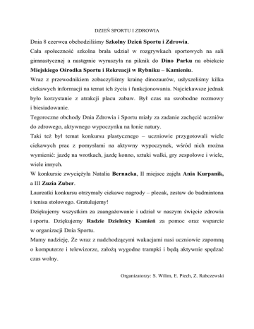 DZIEŃ SPORTU I ZDROWIA Dnia 8 czerwca obchodziliśmy Szkolny Dzień Sportu i Zdrowia. Cała społeczność szkolna brała udział w rozgrywkach sportowych na sali gimnastycznej a następnie wyruszyła na piknik do Dino Parku na obiekcie Miejskiego Ośrodka Sportu i Rekreacji w Rybniku – Kamieniu. Wraz z przewodnikiem zobaczyliśmy krainę dinozaurów, usłyszeliśmy kilka ciekawych informacji na temat ich życia i funkcjonowania. Najciekawsze jednak było korzystanie z atrakcji placu zabaw. Był czas na swobodne rozmowy i biesiadowanie. Tegoroczne obchody Dnia Zdrowia i Sportu miały za zadanie zachęcić uczniów do zdrowego, aktywnego wypoczynku na łonie natury. Taki też był temat konkursu plastycznego – uczniowie przygotowali wiele ciekawych prac z pomysłami na aktywny wypoczynek, wśród nich można wymienić: jazdę na wrotkach, jazdę konno, sztuki walki, gry zespołowe i wiele, wiele innych. W konkursie zwyciężyła Natalia Bernacka, II miejsce zajęła Ania Kurpanik, a III Zuzia Zuber. Laureatki konkursu otrzymały ciekawe nagrody – plecak, zestaw do badmintona i tenisa stołowego. Gratulujemy! Dziękujemy wszystkim za zaangażowanie i udział w naszym święcie zdrowia i sportu. Dziękujemy Radzie Dzielnicy Kamień za pomoc oraz wsparcie w organizacji Dnia Sportu. Mamy nadzieję, Że wraz z nadchodzącymi wakacjami nasi uczniowie zapomną o komputerze i telewizorze, założą wygodne trampki i będą aktywnie spędzać czas wolny. Organizatorzy: S. Wilim, E. Piech, Z. Rabczewski