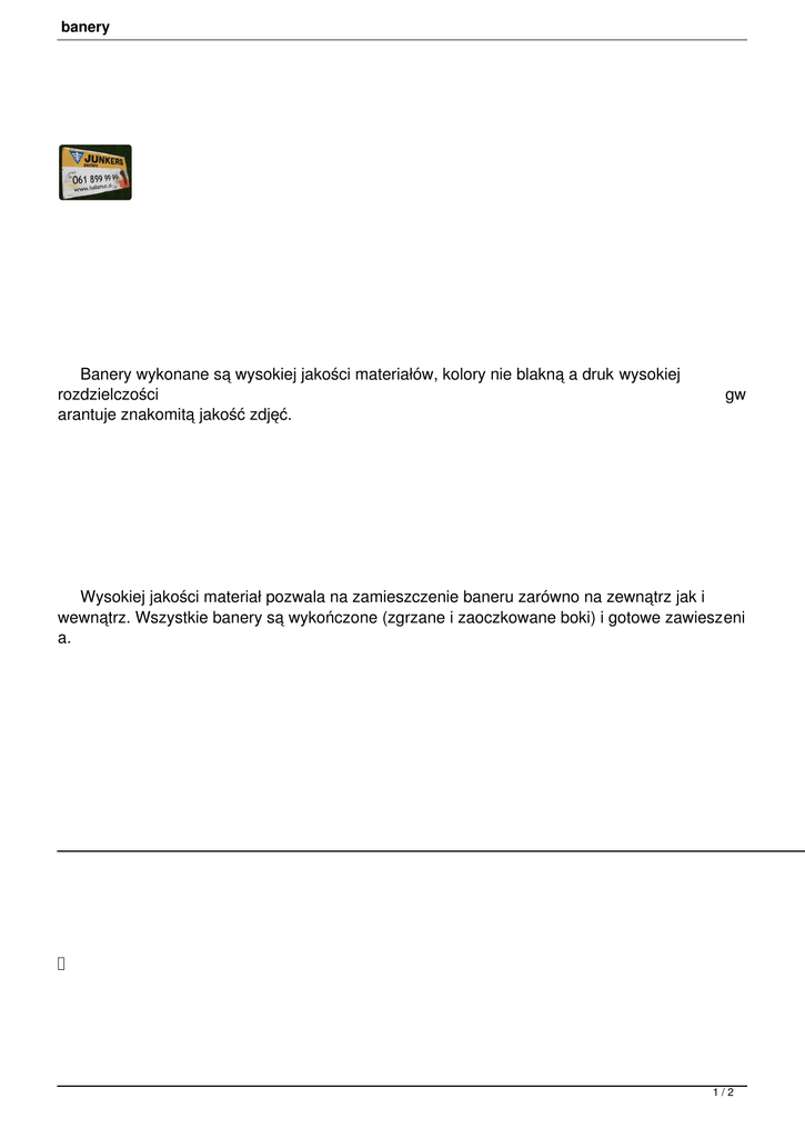 banery Banery wykonane są wysokiej jakości materiałów, kolory nie blakną a druk wysokiej rozdzielczości arantuje znakomitą jakość zdjęć. gw Wysokiej jakości materiał pozwala na zamieszczenie baneru zarówno na zewnątrz jak i wewnątrz. Wszystkie banery są wykończone (zgrzane i zaoczkowane boki) i gotowe zawieszeni a. 1/2 banery OBRÓBKA KOŃCOWA: - docinanie do wymiaru, - zgrzewanie lub klejenie brytów i krawędzi na zakładkę - zaoczkowanie krawędzi oczkami ze stali nierdzewnej - 10mm (standardowo oczkowanie co 50 cm), 2/2
