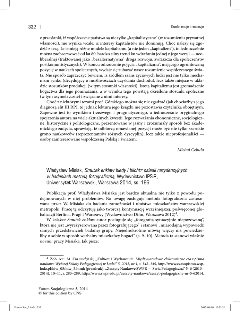 332 Konferencje i recenzje z przesłanki, iż współczesne państwa są nie tylko „kapitalistyczne” (w rozumieniu prywatnej własności), nie wynika wcale, iż interesy kapitalistów nie dominują. Choć należy się zgodzić z tezą, że istnieją różne modele kapitalizmu (a nie jeden „kapitalizm”), to jednocześnie można zaobserwować od lat 80. bardzo silny trend ku wdrażaniu jednej z jego wersji — neoliberalnej (traktowanej jako „bezalternatywna” droga rozwoju, zwłaszcza dla społeczeństw postkomunistycznych). W końcu odrzucenie pojęcia „kapitalizmu”, mającego ugruntowaną pozycję w naukach społecznych, wydaje się zubażać nasze rozumienie współczesnego świata. Nie sposób zaprzeczyć bowiem, iż źródłem szans życiowych ludzi jest nie tylko mechanizm rynku (decydujący o możliwościach uzyskania dochodu), lecz także miejsce w układzie stosunków produkcji (w tym stosunki własności). Istotą kapitalizmu jest gromadzenie bogactwa dla jego pomnażania, a w wyniku tego powstają określone stosunki społeczne (w tym asymetryczne) i związane z nimi interesy. Choć z niektórymi tezami prof. Górskiego można się nie zgadzać (jak chociażby z jego diagnozą elit III RP), to jednak lektura jego książki nie pozostawia czytelnika obojętnym. Zapewne jest to wynikiem trzeźwego i pragmatycznego, a jednocześnie oryginalnego spojrzenia autora na wiele aktualnych kwestii. Jego rozważania ekonomiczne, socjologiczne, historyczne i politologiczne, prezentowane w jasny i zrozumiały sposób bez akademickiego zadęcia, sprawiają, iż odbiorcą omawianej pozycji może być nie tylko szerokie grono naukowców (reprezentantów różnych dyscyplin), lecz także nieprofesjonaliści — osoby zainteresowane współczesną Polską i światem. Michał Cebula Władysław Misiak, Smutek enklaw biedy i blichtr osiedli rezydencyjnych w badaniach metodą fotograficzną, Wydawnictwo IPSiR, Uniwersytet Warszawski, Warszawa 2014, ss. 186 Publikacja prof. Władysława Misiaka jest bardzo aktualna nie tylko z powodu podejmowanych w niej problemów. Na uwagę zasługuje metoda fotograficzna zastosowana przez W. Misiaka do badania zamożności i ubóstwa mieszkańców warszawskiej metropolii. Pracę tę odczytuję jako twórczą kontynuację wcześniejszej, poświęconej globalizacji Berlina, Pragi i Warszawy (Wydawnictwo Difin, Warszawa 2012)4. W książce Smutek enklaw autor posługuje się „fotografią sytuacyjnie niepozowaną”, która nie jest „wyreżyserowana przez fotografującego” i stanowi „miarodajną wypowiedź samych przedstawicieli badanej grupy. Niejednokrotnie mówią więcej niż powiedzieliby o sobie w sposób werbalny mieszkańcy bogaci” (s. 9–10). Metoda ta stanowi właśnie novum pracy Misiaka. Jak pisze: 4 Zob. rec.: M. Krasnodębski, „Kultura i Wychowanie. Międzynarodowe elektroniczne czasopismo naukowe Wyższej Szkoły Pedagogicznej w Łodzi” 5, 2013, nr 1, s. 142–145, http://www.czasopismo.wsp. lodz.pl/kiw_05/kiw_5.html; [przedruk]: „Zeszyty Naukowe SWPR — Seria Pedagogiczna” 5–6 (2013– 2014), 10–11, s. 283–289, http://www.swpr.edu.pl/zeszyty-naukowe/zeszyt-pedagogiczny-nr-5-62014. Forum Socjologiczne 5, 2014 © for this edition by CNS Forum Soc_5.indb 332 2015-06-10 10:52:32 Konferencje i recenzje 333 w przypadku badań współczesnych problemów społeczno-przestrzennych metropolii i wielkich miast znajduje zastosowanie metoda fotograficzna. Jako przykład w tej dziedzinie może służyć badanie procesów gentryfikacji określonym obszarów miast, w których to procedurze metodologicznej najpierw sporządzona jest lista tematyczna, a następnie fotografowane są konkretne obiekty przed procesami gentryfikacji i po nich (s. 47). Fotografię wykorzystywano z powodzeniem jako narzędzie propagandy w III Rzeszy Niemieckiej (s. 64), w działaniach wojennych podczas drugiej wojny światowej (s. 56), a następnie w dobie zimnej wojny. Fotografia oprócz funkcji artystycznej, propagandowej i informacyjnej posiada także wymiar terapeutyczny. Jako taka może być źródłem katharsis (duchowego oczyszczenia) i metanoi (zmiany sposobu postępowania). Wybitny fotograf mający tendencje do pogłębionych refleksji społecznych — pisze W. Misiak — odnośnie do swojej twórczości, Jerzy Lewczyński, stwierdził: „Moja idee fixe, czyli mój sposób rozumienia fotografii polega na przekonaniu, że jest ona medium, które możne polepszyć ludzką egzystencję, umocnić naszą obecność w świecie, pomóc wiele rzeczy zrozumieć. To bardzo trudna sprawa. Mnie się wydaje, że fotografia może być środkiem poprawiającym nasz kontakt ze światem” (s. 64–65). Stanowisko to koresponduje z autorską koncepcją autoterapii Tomasza Rudowskiego, którą odczytuję jako postaci etyki ochrony osób5. Zdaniem autora recenzowanej pracy włączenie fotografii do instrumentarium oddziaływań terapeutycznych odgrywa znaczącą rolę w terapii i resocjalizacji (s. 49–50). W książce nie podjęto wątku, czy bogaci zubożają biednych, czy biedni wzbogacają bogatych (s. 10–11). Wydaje się, że W. Misiak jest daleki od wartościowania omawianego przez siebie zjawiska. Na tym właśnie polega obiektywizm zastosowanej przez niego metody. Metoda fotograficzna wsparta danymi statystycznymi wydaje się sama wyjaśniać, czym jest „biegun” biedy i bogactwa. W konsekwencji otrzymujemy obraz Warszawy jako metropolii, w którym dokonuje się wyraźny podział na zamożnych i ubogich jej mieszkańców. Autor omawia wyznaczniki posiadania: miejsce zamieszkania w wydzielonych osiedlach lub uprzywilejowanych częściach miasta, luksusową konsumpcję, ekskluzywną rozrywkę i sport (s. 96–121). Według Rocznika Statystycznego (z 2010 roku) średnie wynagrodzenie w Warszawie wynosiło 4504 zł (s. 86). Najwyższe wynagrodzenie mieli pracownicy prywatnego sektora medycznego — 11 953 zł, ich koledzy zaś pracujący w sektorze pa