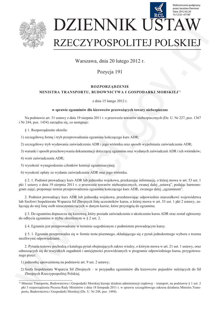 Elektronicznie podpisany przez Jaroslaw Deminet Data: 2012.02.20 15:12:32 +01'00' DZIENNIK USTAW w. rcl .go v.p l RZECZYPOSPOLITEJ POLSKIEJ Warszawa, dnia 20 lutego 2012 r. Pozycja 191 ROZPORZĄDZENIE MINISTRA TRANSPORTU, BUDOWNICTWA I GOSPODARKI MORSKIEJ 1) z dnia 15 lutego 2012 r. w sprawie egzaminów dla kierowców przewożących towary niebezpieczne Na podstawie art. 31 ustawy z dnia 19 sierpnia 2011 r. o przewozie towarów niebezpiecznych (Dz. U. Nr 227, poz. 1367 i Nr 244, poz. 1454) zarządza się, co następuje: § 1. Rozporządzenie określa: 1) szczegółową formę i tryb przeprowadzania egzaminu kończącego kurs ADR; 2) szczegółowy tryb wydawania zaświadczenia ADR i jego wtórnika oraz sposób wypełniania zaświadczenia ADR; 3) warunki i sposób przechowywania dokumentacji dotyczącej egzaminu oraz wydanych zaświadczeń ADR i ich wtórników; 4) wzór zaświadczenia ADR; 5) wysokość wynagrodzenia członków komisji egzaminacyjnej; 6) wysokość opłaty za wydanie zaświadczenia ADR oraz jego wtórnika. § 2. 1. Podmiot prowadzący kurs ADR lub jednostka wojskowa, przekazując informację, o której mowa w art. 53 ust. 1 pkt 1 ustawy z dnia 19 sierpnia 2011 r. o przewozie towarów niebezpiecznych, zwanej dalej „ustawą”, podając harmonogram zajęć, proponuje termin przeprowadzenia egzaminu kończącego kurs ADR, zwanego dalej „egzaminem”. 2. Podmiot prowadzący kurs ADR lub jednostka wojskowa, przedstawiając odpowiednio marszałkowi województwa lub Szefowi Inspektoratu Wsparcia Sił Zbrojnych listę uczestników kursu, o której mowa w art. 53 ust. 1 pkt 2 ustawy, załączają do niej listę osób nieuczestniczących w danym kursie, które przystąpią do egzaminu. § 3. Do egzaminu dopuszcza się kierowcę, który posiada zaświadczenie o ukończeniu kursu ADR oraz został zgłoszony do odbycia egzaminu w trybie określonym w § 2 ust. 2. § 4. Egzamin jest przeprowadzany w terminie uzgodnionym z podmiotem prowadzącym kursy. ww § 5. 1. Egzamin przeprowadza się w formie testu pisemnego, składającego się z pytań jednokrotnego wyboru z trzema możliwymi odpowiedziami. 2. Pytania testowe pochodzą z katalogu pytań obejmujących zakres wiedzy, o którym mowa w art. 21 ust. 1 ustawy, oraz odnoszących się do wszystkich zagadnień i umiejętności przewidzianych w programie odpowiedniego kursu, przygotowanego przez: 1) jednostkę upoważnioną na podstawie art. 9 ust. 2 ustawy; 2) Szefa Inspektoratu Wsparcia Sił Zbrojnych – w przypadku egzaminów dla kierowców pojazdów należących do Sił Zbrojnych Rzeczypospolitej Polskiej. 1) Minister Transportu, Budownictwa i Gospodarki Morskiej kieruje działem administracji rządowej – transport, na podstawie § 1 ust. 2 pkt 3 rozporządzenia Prezesa Rady Ministrów z dnia 18 listopada 2011 r. w sprawie szczegółowego zakresu działania Ministra Transportu, Budownictwa i Gospodarki Morskiej (Dz. U. Nr 248, poz. 1494). Dziennik Ustaw – 2 – Poz. 191 3. Test, o którym mowa w ust. 1, składa się z: w. rcl .go v.p l 1) 30 pytań – w przypadku egzaminu z zakresu szkolenia podstawowego w zakresie przewozu towarów niebezpiecznych wszystkich klas; 2) 18 pytań – w przypadku egzaminu z zakresu szkolenia specjalistycznego w zakresie przewozu drogowego towarów niebezpiecznych w cysternach; 3) 15 pytań – w przypadku egzaminu z zakresu szkolenia specjalistycznego w zakresie przewozu drogowego towarów niebezpiecznych klasy 1; 4) 15 pytań – w przypadku egzaminu z zakresu szkolenia specjalistycznego w zakresie przewozu drogowego towarów niebezpiecznych klasy 7. § 6. Czas trwania egzaminu kończącego kurs ADR wynosi: 1) 60 minut – w przypadku egzaminu z zakresu szkolenia podstawowego w zakresie przewozu towarów niebezpiecznych wszystkich klas; 2) 40 minut – w przypadku egzaminu z zakresu szkolenia specjalistycznego w zakresie przewozu drogowego towarów niebezpiecznych w cysternach; 3) 30 minut – w przypadku egzaminu z zakresu szkolenia specjalistycznego w zakresie przewozu drogowego towarów niebezpiecznych klasy 1; 4) 30 minut – w przypadku egzaminu z zakresu szkolenia specjalistycznego w zakresie przewozu drogowego towarów niebezpiecznych klasy 7. § 7. Egzamin uważa się za zdany, jeżeli osoba egzaminowana udzieli poprawnych odpowiedzi na co najmniej 2/3 pytań z każdego zdawanego testu, o którym mowa w § 5 ust. 3. § 8. 1. Zaświadczenie ADR wydawane jest: 1) na podstawie protokołu potwierdzającego złożenie egzaminu z wynikiem pozytywnym; 2) po przedłożeniu dowodu uiszczenia opłat, o których mowa w art. 25 ust. 1 ustawy, z wyłączeniem kierowców pojazdów należących do Sił Zbrojnych Rzeczypospolitej Polskiej. 2. Zaświadczenie ADR doręcza się kierowcy za pokwitowaniem: 1) w trybie określonym w art. 23 ust. 3 ustawy; 2) w siedzibie marszałka województwa właściwego ze względu na miejsce przeprowadzenia egzaminu – na wniosek kierowcy; 3) w jednostce wojskowej – w przypadku kierowcy pojazdów należących do Sił Zbrojnych Rzeczypospolitej Polskiej. ww § 9. Zaświadczenie ADR wypełnia się na maszynie lub komputerze w języku polskim czcionką zapewniającą dobrą czytelność wpisów. § 10. 1. W przypadku utraty zaświadczenia ADR, na pisemny wniosek osoby zainteresowanej, której utracone zaświadczenie było wydane, odpowiednio właściwy marszałek województwa albo Szef Inspektoratu Wsparcia Sił Zbrojnych wydają wtórnik tego zaświadczenia. Przepisy § 8 i 9 stosuje się odpowiednio. 2. Wydając wtórnik zaświadczenia ADR, odpowiednio marszałek województwa albo Szef Inspektoratu Wsparcia Sił Zbrojnych zamieszczają adnotację o treści „WTÓRNIK” na 4 stronie zaświadczenia „TYLKO NA PRZEPISY KRAJOWE” oraz wpisują datę zamieszczenia adnotacji, składają podpis i pieczęć organu. § 11. 1. Protokoły, o których mowa w art. 23 ust. 1 ustawy, oraz dokumentację dotyczącą egzaminu i wydania zaświadczeń ADR i ich wtórników przechowuj