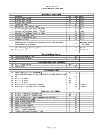 ZAŁĄCZNIK NR 6 ZESTAWIENIE ELEMENTÓW kanalizacja deszczowa 1 2 3 4 5 5 5 Materiały Rura PVC klasa S, fi160 Rura PVC klasa S, fi200 Rura PVC klasa S, fi250 Studnia PVC fi600 Kineta prosta do studni PVC fi 600 o Kineta kąt 90 prawy do studni PVC fi 600 o Kineta kąt 60 prawy do studni PVC fi 600 o Ilość 55 81 27 8 5 Jedn. m m m szt. szt. firma Wavin Wavin Wavin Wavin Wavin 1 szt. Wavin 1 szt. Wavin 5 7 6 7 Kineta kąt 30 prawy do studni PVC fi 600 Właz do studni fi600, D400 Studnia z osadnikiem PVC fi415 Wpust uliczny D400 1 8 6 6 szt. szt. szt. szt. Wavin Wavin Wavin Wavin 8 Separator subst. Ropopochodnych betonowy Qnom=3l/s Q max =30l/s z osadnikiem 900 l i by-passem 1 szt. Biocent typ BIOSEPOCB 3/30/900 9 10 Zbiornik retencyjny betonowy 20 m Pompa z pływakiem 2 1 szt. szt. Biocent TYP PW-150 11 12 Studnia betonowa dn 1200 Właz do studni dn 1200 1 1 szt. szt. 14 15 Rura PVC klasa S, fi160 studnia fi 600 45 2 m szt. 45 m 1 35 27 17 1 1 szt. m m m szt. szt. 120 45 1 1 1 3 2 2 2 2 m m szt. szt. szt. szt. szt. szt. szt. szt. 3 kanalizacja sanitarna przewody i studnia do likwidacji przyłącze gazowe 16 17 18 19 20 21 22 istniejące przyłącze PE40 do likwidacji istniejąca przeniesiona stacja redukcyjna II stopnia, typ PRK-100/T-G65/GXG6 Przewód PE DN40 Przewód PE DN110 Przewód PE DN50 Gazomierz G6 o przepływie Omax=10m3/h Gazomierz G65 o przepływie Omax=70m3/h przyłącze wodociągowe 23 23 24 25 26 27 28 29 30 31 przewód PE100 SDR17 PN10 160x9,5mm przewód PE100 SDR17 PN10 75x4,5mm studnia wodomierzowa z włazem najazdowym D400 1500mm wodomierz sprzężony DN 65 zawór antyskażeniowy DN65 zawór odcinający DN65 hydrant zewnętrzny DN80 zawór odcinający DN80 PN16 zasuwa z żeliwa sferoidalnego skrzynka żeliwna uliczna do zasuwy DN80 Strona 1 z 1 np. Metrix np. Metrix