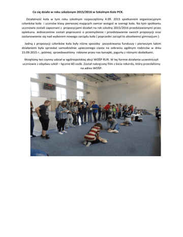 Co się działo w roku szkolonym 2015/2016 w Szkolnym Kole PCK. Działalność koła w tym roku szkolnym rozpoczęliśmy 4.09. 2015 spotkaniem organizacyjnym członków koła i uczniów klasy pierwszej mających zamiar wstąpić w szeregi koła. Na tym spotkaniu uczniowie zostali zapoznani z propozycjami działań na rok szkolny 2015/2016 przedstawionymi przez opiekuna. Jednocześnie zostali poproszeni o przemyślenie i przedstawienie swoich propozycji oraz zastanowienie się nad wyborem nowego zarządu koła ( poprzedni zarząd to absolwenci gimnazjum ). Jedną z propozycji członków koła były różne sposoby pozyskiwania funduszy i pierwszym takim działaniem była sprzedaż samodzielnie upieczonego ciasta na zebraniu ogólnym rodziców w dniu 15.09.2015 r., później sprzedawaliśmy robione przez nas kanapki, jogurty z różnymi dodatkami. Wzięliśmy też czynny udział w ogólnopolskiej akcji WOŚP RUR. W tej formie działania uczestniczyli uczniowie z obydwu szkół – łącznie 60 osób. Został nakręcony film z bicia rekordu, który przesłaliśmy na adres WOŚP. Każdego roku uczestniczymy Ogólnopolskiej Kweście „Walka z głodem”. Podobnie było w tym roku - 17.10.2015 r. - można było nas spotkać w Poznaniu. Jesteśmy jednym z niewielu gimnazjów, jeżeli nie jedynym, biorącym udział w tym przedsięwzięciu. Jest to dla nas mała wyprawa, bo kwesty mają miejsce w weekend, a wtedy jest znacznie trudniej dostać się do Poznania i po kweście wrócić. Zawsze jest jednak znaczna liczba chętnych, gotowych poświęcić swój wolny czas dla innych potrzebujących różnego rodzaju wsparcia. W tym roku szkolny później niż zwykle, bo 20.11.2015 r., miał miejsce apel Szkolnego Koła PCK, w którym zawsze uczestniczy dyrektor gimnazjum oraz przedstawiciel ZR PCK Poznań. Na apelu wszyscy uczniowie mieli okazję poznać Zarząd Szkolnego Koła PCK oraz usłyszeć o działaniach przewidywanych w bieżącym roku szkolnym. Jest to też okazja by przybliżyć uczniom historię MCK, zasady obowiązujące w PCK, przyjąć nowych członków wręczając im legitymacje. Przedstawicie ZR PCK przeprowadził po apelu praktyczny pokaz zasad udzielania pierwszej pomocy przedmedycznej. W dniu 28.11.2015 r. grupka chętnych osób wzięła udział w akcji „Żurawinka” mającej na celu pozyskanie funduszy dla niepełnosprawnych dzieci. Kwestowaliśmy na terenie Kupca Poznańskiego, i ta kwesta również miała miejsce w czasie wolnym od zajęć w szkole. Na terenie wsi Czapury działa od kilku lat działa DOP , w którym przebywają osoby w podeszłym wieku, mające problemy zdrowotne. Podejmujemy różne działania by uprzyjemnić pobyt mieszkańcom domu. W tym roku szkolnym byliśmy z wizytą kilka razy i mamy zamiar kontynuować nasze odwiedziny. Pierwszy raz pojechaliśmy 5.12.2015 r., a że to czas mikołajkowy więc przygotowaliśmy dla każdego z pensjonariuszy drobne niespodzianki, panie opiekujące się osobami tam przebywającymi przygotowały osoby, które chciały pójść na spacer , a więc mogliśmy pospacerować na dworze, porozmawiać z pensjonariuszami. Następne nasze odwiedziny miały miejsce przed Świętami Bożego Narodzenia, pojechaliśmy 22.12.2015 r., by wręczyć kartki z życzeniami świątecznymi , które wykonali uczniowie gimnazjum. Mieliśmy też drobne upominki, które mogliśmy zakupić dzięki funduszom pozyskanym ze sprzedaży kanapek, jogurtów. 14.01.2016 r. to kolejna nasza wizyta. Pojechaliśmy z inscenizacją świątecznych Jasełek. Jasełka przygotowali uczniowie Szkoły Podstawowej, więc tym razem przeważającą część grupy stanowili uczniowie podstawówki. W przedstawieniu uczestniczyła grupa podopiecznych DOP. Okres, w jakim byliśmy to tuż przed dniem Babci i Dziadka, więc zabawiliśmy się we wnuków i wręczyliśmy każdemu mieszkańcowi Domu kwiatki wykonane przez nas na zajęciach z techniki oraz złożyliśmy życzenia. Nie mogło zabraknąć nas i składnych przez nas życzeń z okazji Dnia Kobiet. Więc 5.03.2016 r. byliśmy w Czapurach. Tym razem dla Pań zakupiliśmy tulipany natomiast dla Panów słodycze. Nasza wizyta wywołała wzruszenie, że ktoś pamięta i ofiarowuje swój czas. W okresie poprzedzającym Święta Gwiazdkowe grupa członków koła co roku kwestuje w Selgros, aby pozyskać fundusze na wsparcie hospicjum Palium i DD w Bninie. Podobnie było w tym roku, udało nam się uzyskać zgodę dyrekcji Selgros i 19.12.2015r. kwestowaliśmy ok. 6 godzin. Później przeliczyliśmy zebrane pieniądze i sprawiedliwie podzieli. Część przeznaczoną dla hospicjum wpłaciliśmy na konto, a po uzgodnieniu z dyrektorem DD zrobimy zakupy i odwiedzimy Bnin. Tradycją naszego koła jest udział w kweście WOŚP. Nie inaczej było w tym roku, więc 10.01.2016 r. wolontariusze wyruszyli w teren. Prócz osób mających identyfikatory w kweście biorą udział osoby towarzyszące. Kwesta trwa od wczesnych godzin rannych do momentu kiedy zebrane pieniądze należy przekazać do Sztabu, któremu podlegamy. W tym roku kwestujący zebrali znaczną kwotę – 7,208,88 zł. Kolejnym zadaniem, w którym uczestniczyliśmy był „Motyli wolontariat”. Po pogadance i prezentacji przeprowadzonej przez pracowników i wolontariuszy hospicjum Palium, 29.02.2016 r., wyjaśniającej cel działania cała szkoła zabrała się za malowanie motyli. Akcja wolontariatu zbiegła się z informacją, że absolwent naszego gimnazjum cierpi na rzadką chorobę – stwardnienie boczne zanikowe – i potrzebne są pieniądze na rehabilitację. Mieliśmy zamiar kwestować w Selgros, ale postanowiono zorganizować na terenie szkoły koncert charytatywny. W przygotowaniach wzięli udział uczniowie, nauczyciele obu szkół. My włączyliśmy się w rozprowadzanie biletów- cegiełek pod sklepami Dino i Tesco w Daszewicach co miało miejsce w przedświątecznym okresie. Koncert odbył się 1.04.2016 r., żadna z osób, do których zwrócono się nie 