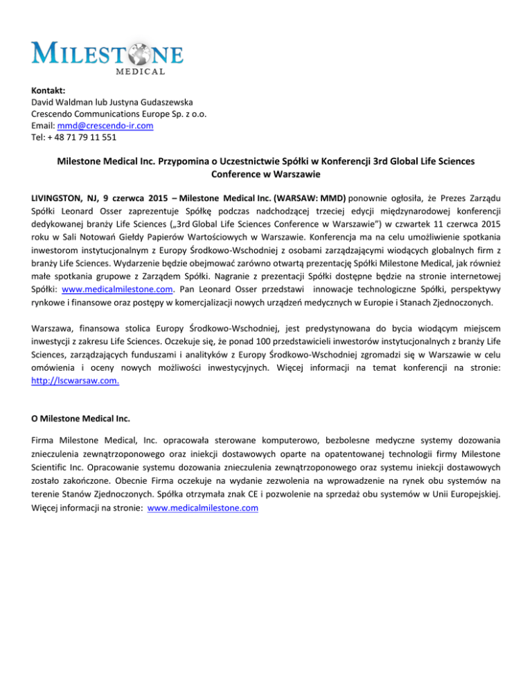 Kontakt: David Waldman lub Justyna Gudaszewska Crescendo Communications Europe Sp. z o.o. Email: [email protected] Tel: + 48 71 79 11 551 Milestone Medical Inc. Przypomina o Uczestnictwie Spółki w Konferencji 3rd Global Life Sciences Conference w Warszawie LIVINGSTON, NJ, 9 czerwca 2015 – Milestone Medical Inc. (WARSAW: MMD) ponownie ogłosiła, że Prezes Zarządu Spółki Leonard Osser zaprezentuje Spółkę podczas nadchodzącej trzeciej edycji międzynarodowej konferencji dedykowanej branży Life Sciences („3rd Global Life Sciences Conference w Warszawie”) w czwartek 11 czerwca 2015 roku w Sali Notowań Giełdy Papierów Wartościowych w Warszawie. Konferencja ma na celu umożliwienie spotkania inwestorom instytucjonalnym z Europy Środkowo-Wschodniej z osobami zarządzającymi wiodących globalnych firm z branży Life Sciences. Wydarzenie będzie obejmować zarówno otwartą prezentację Spółki Milestone Medical, jak również małe spotkania grupowe z Zarządem Spółki. Nagranie z prezentacji Spółki dostępne będzie na stronie internetowej Spółki: www.medicalmilestone.com. Pan Leonard Osser przedstawi innowacje technologiczne Spółki, perspektywy rynkowe i finansowe oraz postępy w komercjalizacji nowych urządzeń medycznych w Europie i Stanach Zjednoczonych. Warszawa, finansowa stolica Europy Środkowo-Wschodniej, jest predystynowana do bycia wiodącym miejscem inwestycji z zakresu Life Sciences. Oczekuje się, że ponad 100 przedstawicieli inwestorów instytucjonalnych z branży Life Sciences, zarządzających funduszami i analityków z Europy Środkowo-Wschodniej zgromadzi się w Warszawie w celu omówienia i oceny nowych możliwości inwestycyjnych. Więcej informacji na temat konferencji na stronie: http://lscwarsaw.com. O Milestone Medical Inc. Firma Milestone Medical, Inc. opracowała sterowane komputerowo, bezbolesne medyczne systemy dozowania znieczulenia zewnątrzoponowego oraz iniekcji dostawowych oparte na opatentowanej technologii firmy Milestone Scientific Inc. Opracowanie systemu dozowania znieczulenia zewnątrzoponowego oraz systemu iniekcji dostawowych zostało zakończone. Obecnie Firma oczekuje na wydanie zezwolenia na wprowadzenie na rynek obu systemów na terenie Stanów Zjednoczonych. Spółka otrzymała znak CE i pozwolenie na sprzedaż obu systemów w Unii Europejskiej. Więcej informacji na stronie: www.medicalmilestone.com