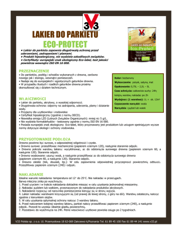 LAKIER DO PARKIETU ECO-PROTECT • Lakier do parkietu zapewnia długotrwałą ochronę przed uderzeniami, zadrapaniami i plamami. • Produkt hipoalergiczny, nie wydziela szkodliwych związków. • Certyfikaty: europejski znak ekologiczny Eco-label, test jakości powietrza wewnątrz ISO EN 16 000. PRZEZNACZENIE • Do parkietów, podłóg i schodów wykonanych z drewna, zarówno nowego jak i starego, wewnątrz pomieszczeń. • Nadaje się do europejskich i egzotycznych gatunków drewna. • W przypadku tłustych i rzadkich gatunków drewna prosimy skonsultować się z działem technicznym. Kolor: bezbarwny Wykończenie: połysk, satyna, mat Opakowanie: 0,75L – 2,5L – 5L Czas schnięcia: całkowicie suchy: 24h; kolejną warstwę nakładać po 2h WŁAŚCIWOŚCI Wydajność (1 warstwa): 1L = ok. 12m2 • Lakier do parkietu, akrylowy, o wysokiej odporności. Czyszczenie narzędzi: woda • Długotrwała ochrona: odporny na zadrapania, uderzenia, plamy i działanie Narzędzia : pędzel lub wałek wody. • Przyjazny dla uŜytkownika i środowiska: • Certyfikat hipoalergiczny (zgodnie z normą OECD). • Niewielka emisja LZO (Lotnych Związków Organicznych): mniej niŜ 5 g/L. • Nie wydziela formaldehydów - testowany zgodnie z normą ISO EN 16 000. • Posiada europejski znak ekologiczny Eco-label, który przyznawany jest produktom lub usługom spełniającym wyŜsze normy dotyczące ekologii i ochrony środowiska. PRZYGOTOWANIE PODŁOśA Drewno powinno być surowe, o odpowiedniej wilgotności i czyste. • Drewno surowe: przeszlifować mechanicznie (papierem ściernym 120), następnie starannie odpylić. • Drewno pokryte warstwą lakieru: wycyklinować, aŜ do odsłonięcia surowego drewna (papierem ściernym 60, a następnie 120). Starannie odpylić. • Drewno woskowane: usunąć wosk, a następnie przeszlifować aŜ do odsłonięcia surowego drewna (papierem ściernym 60, a następnie 120). Starannie odpylić. • Drewno oleiste (tek, doussié, itp.): W celu zapewnienia odpowiedniej przyczepności powierzchnię odtłuścić. Przeszlifować papierem ściernym (240) i odpylić. NAKŁADANIE Idealne warunki nakładania: temperatura od 12° do 25°C. Nie nakładać w przeciągach. Barwa mleczna znika po wyschnięciu. 1. Przed uŜyciem i w trakcie nakładania dokładnie mieszać w celu uzyskania jednorodnej mieszaniny. 2. Nakładać pędzlem lub wałkiem, przeznaczonym do nakładania produktów akrylowych. 3. Nakładanie rozpocząć od naroŜnika pomieszczenia kierując się w stronę wyjścia. 4. Lakier nakładać warstwami krzyŜującymi się (od prawej do lewej strony, z góry na dół). Warstwę ostateczną nałoŜyć zgodnie z kierunkiem słojów. 5. W celu uzyskania optymalnej ochrony nałoŜyć 3 warstwy lakieru. 6. Przed nałoŜeniem kolejnej warstwy lakieru, parkiet naleŜy przeszlifować papierem ściernym (240), a następnie odpylić. Pozwoli to uzyskać idealnie gładką powierzchnię. 7. Pozostawić do wyschnięcia na 24h. Pełne właściwości uŜytkowe powłoka osiąga po 2 tygodniach. V33 Polska sp. z o.o. Ul. Przemysłowa 18 62-069 Zakrzewo k/Poznania Tel. 61 89 45 100 Fax 61 89 44 141 www.v33.pl