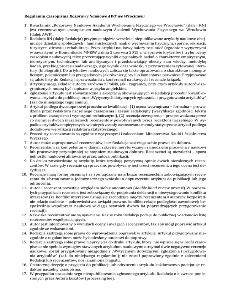 Regulamin czasopisma Rozprawy Naukowe AWF we Wrocławiu 1. Kwartalnik „Rozprawy Naukowe Akademii Wychowania Fizycznego we Wrocławiu” (dalej: RN) jest recenzowanym czasopismem naukowym Akademii Wychowania Fizycznego we Wrocławiu (dalej: AWF). 2. Redakcja RN (dalej: Redakcja) przyjmuje nigdzie wcześniej niepublikowane artykuły naukowe obejmujące dziedzinę społecznych i humanistycznych nauk o wychowaniu fizycznym, sporcie, rekreacji, turystyce, zdrowiu i rehabilitacji. Przez artykuł naukowy należy rozumieć (zgodnie z wytycznymi w zawartymi w Komunikacie MNiSW z dnia 2 czerwca 2015 r. w sprawie kryteriów i trybu oceny czasopism naukowych) tekst prezentujący wyniki oryginalnych badań o charakterze empirycznym, teoretycznym, technicznym lub analitycznym i przedstawiający obecny stan wiedzy, metodykę badań, przebieg procesu badawczego, jego wyniki oraz wnioski, z przytoczeniem cytowanej literatury (bibliografii). Do artykułów naukowych zalicza się także opracowania o charakterze monograficznym, polemicznym lub przeglądowym, jak również glosy lub komentarze prawnicze. Przyjmowane są także listy do Redakcji, sprawozdania z konferencji naukowych i recenzje książek. 3. Artykuły mogą składać autorzy zarówno z Polski, jak i zagranicy, przy czym artykuły autorów zagranicznych muszą być napisane w języku angielskim. 4. Zgłoszenie artykułu jest równoznaczne z akceptacją obowiązujących w Redakcji procedur kwalifikowania artykułu do publikacji oraz „Wytycznych dotyczących zgłaszania i przygotowania artykułów” (zał. do niniejszego regulaminu). 5. Artykuł podlega dwustopniowej procedurze kwalifikacji: (1) ocena wewnętrzna – formalna – prowadzona przez redaktora naczelnego czasopisma i zespół redakcyjny (weryfikacja zgodności tekstu z profilem czasopisma i wymogami technicznymi), (2) recenzja zewnętrzna – przeprowadzana przez co najmniej dwóch niezależnych recenzentów powoływanych przez redaktora naczelnego. W wypadku artykułów empirycznych, w których zostały zastosowane metody statystyczne, artykuł podlega dodatkowo weryfikacji redaktora statystycznego. 6. Procedury recenzowania są zgodne z wytycznymi i zaleceniami Ministerstwa Nauki i Szkolnictwa Wyższego. 7. Autor może zaproponować recenzentów, lecz Redakcja zastrzega sobie prawo ich doboru. 8. Recenzentami są kompetentni w danym zakresie merytorycznym samodzielni pracownicy naukowi lub pracownicy przynajmniej ze stopniem naukowym doktora. Recenzenci są niezależni – spoza jednostki naukowej afiliowanej przez autora publikacji. 9. Do druku zatwierdzane są artykuły, które uzyskają pozytywną opinię dwóch niezależnych recenzentów. W razie gdy recenzje są sprzeczne, powoływany jest trzeci recenzent, a jego ocena jest decydująca. 10. Recenzje mają formę pisemną i są sporządzane na arkuszu recenzenckim zobowiązującym recenzenta do sformułowania jednoznacznego wniosku o dopuszczeniu artykułu do publikacji lub jego odrzuceniu. 11. Autor i recenzent pozostają względem siebie anonimowi (double blind review process). W pozostałych przypadkach recenzent jest zobowiązany do podpisania deklaracji o niewystępowaniu konfliktu interesów (za konflikt interesów uznaje się zachodzące między recenzentem a autorem: bezpośrednie relacje osobiste – pokrewieństwo, związki prawne, konflikt; relacje podległości zawodowej; bezpośrednia współpraca naukowa w ciągu ostatnich dwóch lat poprzedzających przygotowanie recenzji). 12. Nazwiska recenzentów nie są ujawniane. Raz w roku Redakcja podaje do publicznej wiadomości listę recenzentów współpracujących. 13. Autor jest informowany o wynikach oceny i uwagach recenzentów, tak aby mógł poprawić artykuł zgodnie ze wskazaniami. 14. Redakcja zastrzega sobie prawo do wprowadzenia poprawek w artykule. Artykuł przygotowany niezgodnie z regulaminem może być odesłany autorowi do poprawy. 15. Redakcja zastrzega sobie prawo nieprzyjęcia do druku artykułu, który: nie wpisuje się w profil czasopisma; nie spełnia wymogów stawianych artykułom naukowym; otrzymał dwie negatywne recenzje naukowe; został przygotowany niezgodnie z „Wytycznymi dotyczącymi zgłoszenia i przygotowania artykułów” (zał. do niniejszego regulaminu); nie został poprawiony zgodnie z zaleceniami Redakcji lub recenzentów; nosi znamiona plagiatu. 16. Ostateczną decyzję o przyjęciu do publikacji lub odrzuceniu artykułu każdorazowo podejmuje redaktor naczelny czasopisma. 17. W przypadku uzasadnionego nieopublikowania zgłoszonego artykułu Redakcja nie zwraca poniesionych przez Autora kosztów (processing fee). 18. Autor jest zobowiązany do podpisania licencji, tym samym zgadzając się na upowszechnianie artykułu w postaci drukowanej, na nośnikach cyfrowych i w Internecie. Jeśli artykuł powstał we współpracy z innymi autorami, główny autor jest zobowiązany dostarczyć licencje podpisane przez wszystkich współautorów i poinformować ich o warunkach zawartych w regulaminie czasopisma. 19. Autor jest zobowiązany do złożenia oświadczenia w sprawie procedur etycznych obowiązujących w nauce oraz do ujawnienia wkładu poszczególnych autorów w powstanie artykułu (z podaniem ich afiliacji oraz kontrybucji, tj. informacji, kto jest autorem koncepcji, założeń, metod, protokołu itp. wykorzystywanych przy przygotowaniu publikacji), przy czym główną odpowiedzialność ponosi autor zgłaszający artykuł. 20. Autorem nie może być osoba, która wykonała tylko obliczenia statystyczne, przygotowała tylko wykaz bibliograficzny lub tylko zorganizowała bądź dofinansowała badania. 21. Redakcja nie przyjmie artykułu, w którym występują zjawiska „ghostwritting” i „guest authorship”, a wszelkie nieprawidłowości, zwłaszcza przejawy nierzetelności naukowej (łamania i naruszania zasad etyki obowiązujących w nauce), będą demaskowane przez Redakcję. 21. Autorzy są zobowiązani do zgłosze