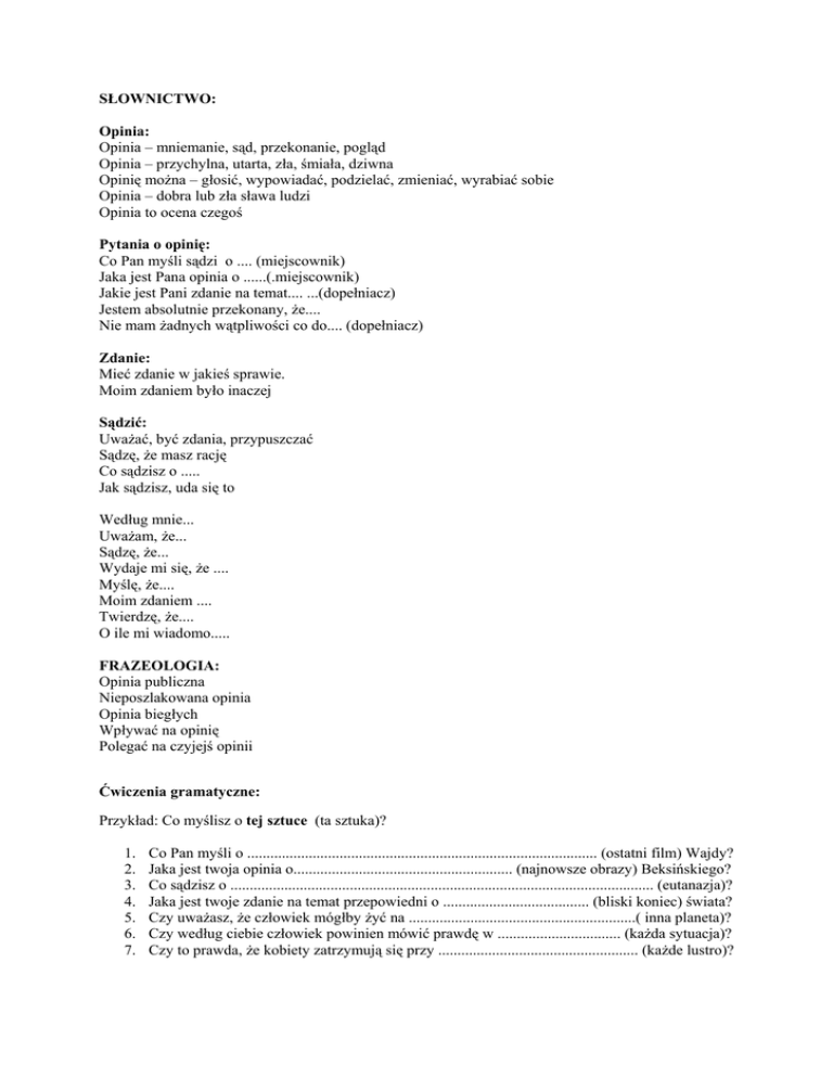 SŁOWNICTWO: Opinia: Opinia – mniemanie, sąd, przekonanie, pogląd Opinia – przychylna, utarta, zła, śmiała, dziwna Opinię moŜna – głosić, wypowiadać, podzielać, zmieniać, wyrabiać sobie Opinia – dobra lub zła sława ludzi Opinia to ocena czegoś Pytania o opinię: Co Pan myśli sądzi o .... (miejscownik) Jaka jest Pana opinia o ......(.miejscownik) Jakie jest Pani zdanie na temat.... ...(dopełniacz) Jestem absolutnie przekonany, Ŝe.... Nie mam Ŝadnych wątpliwości co do.... (dopełniacz) Zdanie: Mieć zdanie w jakieś sprawie. Moim zdaniem było inaczej Sądzić: UwaŜać, być zdania, przypuszczać Sądzę, Ŝe masz rację Co sądzisz o ..... Jak sądzisz, uda się to Według mnie... UwaŜam, Ŝe... Sądzę, Ŝe... Wydaje mi się, Ŝe .... Myślę, Ŝe.... Moim zdaniem .... Twierdzę, Ŝe.... O ile mi wiadomo..... FRAZEOLOGIA: Opinia publiczna Nieposzlakowana opinia Opinia biegłych Wpływać na opinię Polegać na czyjejś opinii Ćwiczenia gramatyczne: Przykład: Co myślisz o tej sztuce (ta sztuka)? 1. 2. 3. 4. 5. 6. 7. Co Pan myśli o ........................................................................................... (ostatni film) Wajdy? Jaka jest twoja opinia o......................................................... (najnowsze obrazy) Beksińskiego? Co sądzisz o .............................................................................................................. (eutanazja)? Jaka jest twoje zdanie na temat przepowiedni o ...................................... (bliski koniec) świata? Czy uwaŜasz, Ŝe człowiek mógłby Ŝyć na ...........................................................( inna planeta)? Czy według ciebie człowiek powinien mówić prawdę w ................................ (kaŜda sytuacja)? Czy to prawda, Ŝe kobiety zatrzymują się przy .................................................... (kaŜde lustro)?