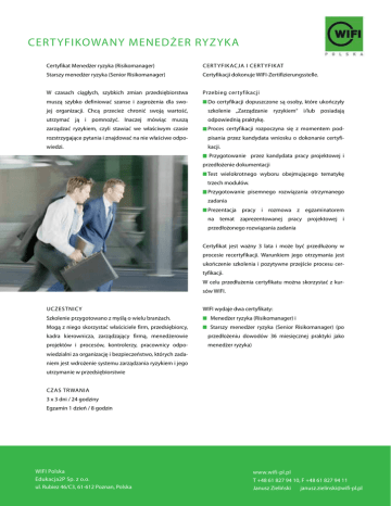 Certyfikowany menedżer ryzyka Certyfikat Menedżer ryzyka (Risikomanager) Certyfikacja i certyfikat Starszy menedżer ryzyka (Senior Risikomanager) Certyfikacji dokonuje WIFI-Zertifizierungsstelle. W czasach ciągłych, szybkich zmian przedsiębiorstwa Przebieg certyfikacji muszą szybko definiować szanse i zagrożenia dla swo- Do certyfikacji dopuszczone są osoby, które ukończyły jej organizacji. Chcą przecież chronić swoją wartość, szkolenie „Zarządzanie ryzykiem“ i/lub posiadają utrzymać ją i pomnożyć. Inaczej mówiąc muszą odpowiednią praktykę. zarządzać ryzykiem, czyli stawiać we właściwym czasie Proces certyfikacji rozpoczyna się z momentem pod- rozstrzygające pytania i znajdować na nie właściwe odpo- pisania przez kandydata wniosku o dokonanie certyfi- wiedzi. kacji. Przygotowanie przez kandydata pracy projektowej i przedłożenie dokumentacji Test wielokrotnego wyboru obejmującego tematykę trzech modułów. Przygotowanie pisemnego rozwiązania otrzymanego zadania Prezentacja pracy i rozmowa z egzaminatorem na temat zaprezentowanej pracy projektowej i przedłożonego rozwiązania zadania Certyfikat jest ważny 3 lata i może być przedłużony w procesie recertyfikacji. Warunkiem jego otrzymania jest ukończenie szkolenia i pozytywne przejście procesu certyfikacji. W celu przedłużenia certyfikatu można skorzystać z kursów WIFI. UCZESTNICY WIFI wydaje dwa certyfikaty: Szkolenie przygotowano z myślą o wielu branżach. Menedżer ryzyka (Risikomanager) i Mogą z niego skorzystać właściciele firm, przedsiębiorcy, Starszy menedżer ryzyka (Senior Risikomanager) (po kadra kierownicza, zarządzający firmą, menedżerowie przedłożeniu dowodów 36 miesięcznej praktyki jako projektów i procesów, kontrolerzy, pracownicy odpo- menedżer ryzyka) wiedzialni za organizację i bezpieczeństwo, których zadaniem jest wdrożenie systemu zarządzania ryzykiem i jego utrzymanie w przedsiębiorstwie CZAS TRWANIA 3 x 3 dni / 24 godziny Egzamin 1 dzień / 8 godzin WIFI Polska Edukacja2P Sp. z o.o. ul. Rubiez 46/C3, 61-612 Poznan, Polska www.wifi-pl.pl T +48 61 827 94 10, F +48 61 827 94 11 Janusz Zieliński [email protected] Certyfikowany menedżer ryzyka Certyfikacja „Menedżer ryzyka“ Prezentacja pracy i rozmowa z egzaminatorem Test wielokrotnego wyboru PROGRAM szkoleń Identyfikacja i zarządzanie ryzykiem Pojęcia i podstawy zarządzania ryzykiem Prawne aspekty zarządzania ryzykiem Praca projektowa Przegląd ustaw, norm i zarządzeń Polityka ryzyk, strategia ryzyk, związek z BSC Szkolenia „Zarządzanie ryzykiem“ Krajobraz ryzyk, macierz ryzyk 1. Moduł 24h Identyfikacja i zarządzanie ryzykiem 2. Moduł 24h Systematyczne zarządzanie ryzykiem 3. Moduł 24h Komunikacja i optymalizacja Metody identyfikacji i oceny ryzyka Przygotowanie pracy projektowej Systematyczne zarządzanie ryzykiem na co dzień Kontroling ryzyka, wskaźniki Przegląd aplikacji komputerowych Integracja systemu zarządzania ryzykiem z system zarządzania organizacji Synergia systemu zarządzania ryzykiem w zintegrowa- Spotkanie informacyjne nym systemie zarządzania Zarządzanie projektem budowy systemu zarządzania ryzykiem Komunikacja i optymalizacja zarządzania ryzykiem Sprawozdawczość w zarządzaniu ryzykiem Zależności organizacyjne w zarządz. ryzykiem Wewnętrzne systemy kontroli Zarządzanie kryzysowe, zarządzanie w sytuacjach katastrof i wypadków Wymagania stawiane menedżerowi ryzyka i osobom odpowiadającym za ryzyka Przegląd zagadnień z zakresu ciągłości zarządzania Przygotowanie do egzaminu i certyfikacji WIFI Polska Edukacja2P Sp. z o.o. ul. Rubiez 46/C3, 61-612 Poznan, Polska www.wifi-pl.pl T +48 61 827 94 10, F +48 61 827 94 11 Janusz Zieliński [email protected]
