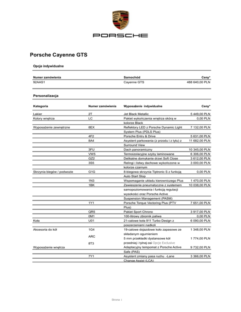 Porsche Cayenne GTS Opcje indywidualne Numer zamówienia Samochód 92AAS1 Cayenne GTS Ceny* 488 640,00 PLN Personalizacja Kategoria Numer zamówienia Wyposażenie indywidualne Lakier Kolory wnętrza 2T LC Wyposażenie zewnętrzne 8EX Jet Black Metallic Pakiet wykończenia wnętrza skórą w kolorze Black Reflektory LED z Porsche Dynamic Light System Plus (PDLS Plus) Porsche Entry & Drive Asystent parkowania (z przodu i z tyłu) z Surround View Dach panoramiczny Termoizolacyjne szyby laminowane Delikatne domykanie drzwi Soft Close Relingi i listwy dachowe wykończone w kolorze czarnym 8-biegowa skrzynia Tiptronic S z funkcją Auto Start Stop Wspomaganie układu kierowniczego Plus Zawieszenie pneumatyczne z systemem samopoziomowania i funkcją regulacji wysokości oraz Porsche Active 4F2 8A4 3FU VW5 GZ2 3S5 Skrzynia biegów / podwozie G1G 1N3 1BK Suspension Management (PASM) Porsche Torque Vectoring Plus (PTV Plus) Pakiet Sport Chrono 100-litrowy zbiornik paliwa 21-calowe koła 911 Turbo Design z poszerzeniami nadkoli 19-calowe dojazdowe koło zapasowe ze składanym ogumieniem 1Y1 Koła QR5 0M1 U01 Akcesoria do kół 1G4 ARC 8T3 Wyposażenie wnętrza Strona 1 5 449,00 PLN 0,00 PLN 7 132,00 PLN 5 631,00 PLN 11 682,00 PLN 10 345,00 PLN 6 306,00 PLN 3 612,00 PLN 3 000,00 PLN 0,00 PLN 1 470,00 PLN 10 038,00 PLN 7 651,00 PLN 3 917,00 PLN 0,00 PLN 6 090,00 PLN 1 348,00 PLN 5 mm przekładki dystansowe kół 1 774,00 PLN przedniej i tylnej osi Opcje Exclusive Adaptacyjny tempomat z Porsche Active 9 732,00 PLN Safe (PAS) Asystent zmiany pasa ruchu -Lane Change Assist (LCA) 7Y1 Ceny* 3 366,00 PLN Personalizacja (dalej) Kategoria Numer zamówienia Wyposażenie indywidualne 9Q6 System rozpoznawania ograniczenia prędkości Automatycznie przyciemniane lusterka zewnętrzne i wewnętrzne w połączeniu z pakietem pamięci 1 958,00 PLN PP6 Pakiet oświetlenia Komfort w połączeniu z pakietem pamięci 1 592,00 PLN VC1 HomeLink® (zdalne otwieranie drzwi garażowych) Adaptacyjne sportowe fotele z 18zakresową regulacją i pakietem pamięci 4-strefowy układ klimatyzacji 1 470,00 PLN PA2 PE6 Wnętrze: skóra 9AH 4A4 4D3 0TD 4X4 6A7 AXK AXF AXH Wnętrze: włókno węglowe 5MH 2FX Wnętrze: aluminium Audio / komunikacja Podgrzewane fotele (z przodu i z tyłu) Wentylowane fotele (z przodu) Dywaniki Boczne poduszki powietrzne (z tyłu) Gaśnica Pakiet wnętrza ze środkową częścią foteli ze skóry w kontrastowym kolorze Opcje Exclusive Wybrany kolor: Garnet Red Pakiet wnętrza z dekoracyjnymi przeszyciami w kolorze kontrastowym Opcje Exclusive Wybrany kolor: Garnet Red Pakiet wnętrza z dekoracyjnymi przeszyciami na fotelach w kolorze kontrastowym Opcje Exclusive Wybrany kolor: Garnet Red Pakiet wnętrza z włókna węglowego w połączeniu z dźwignią zmiany biegów Tiptronic S z aluminium Ogrzewana kierownica wielofunkcyjna Dźwignia zmiany biegów Tiptronic S z 6Q7 7T1 9W1 9VL QU0 Ceny* 1 836,00 PLN 9 732,00 PLN 4 223,00 PLN 4 469,00 PLN 4 774,00 PLN 919,00 PLN 2 112,00 PLN 766,00 PLN 11 568,00 PLN 7 927,00 PLN 7 285,00 PLN 4 407,00 PLN 3 091,00 PLN 2 356,00 PLN aluminium Opcje Exclusive Porsche Communication Management (PCM) Z modułem nawigacji Moduł telefoniczny BOSE® Surround Sound System Radio cyfrowe 17 445,00 PLN 4 041,00 PLN 6 947,00 PLN 2 449,00 PLN Cena całkowita* 688 550,00 PLN OFERTA SPECJALNA* 647 237,00 PLN RATA LEASINGOWA** 8 419,60 PLN *ceny zawierają 23 % VAT i nie stanowią oferty w rozumieniu art.71 Kodeksu cywilnego. ** Leasing 102%, 36 miesięcy, 45% opłaty wstępnej, 1% wartość wykupu. Oferta ważna do 31.01.2017r. lub do wyprzedania samochodów objętych ofertą specjalną Twój Kod Porsche: http://www.porsche-code.com/PGD8CD43 Ważne informacje Przedstawione w konfiguratorze modele samochodów prezentują wyposażenie dostępne na terenie Rzeczypospolitej Polskiej. Dostępność modeli i opcji może się różnić na poszczególnych rynkach z uwagi na lokalne przepisy i ograniczenia. Zawartość domówionego pakietu lub opcji może zmienić elementy wyposażenia standardowego – w niektórych przypadkach bezzwrotnie zastępując elementy wyposażenia standardowego. W celu uzyskania szczegółowych informacji w tym zakresie prosimy o kontakt z Porsche Centrum lub z wyłącznym przedstawicielem Dr. Ing, h.c.F. Porsche AG w Polsce – Volkswagen Group Polska Sp. z o.o. z siedzibą w Poznaniu, ul. Krańcowa 44, tel. 61 62 73 000. Dr. Ing, h.c.F. Porsche AG zastrzega sobie prawo do zmian designu, wyposażenia, kolorów, jak i specyfikacji samochodów. Kolory i materiały rzeczywiste mogą się różnić od kolorów i materiałów przedstawionych na zdjęciach. Zastrzega się prawo do błędów i pominięć w Konfiguratorze Porsche oraz na www.porsche.pl . Niniejsza konfiguracja nie stanowi oferty w rozumieniu art. 71 Kodeksu cywilnego, ma jedynie charakter poglądowy. Ceny i charakterystyka muszą być potwierdzone w wybranym Porsche Centrum. Wszystkie produkowane obecnie samochody Porsche są wykonywane z materiałów spełniających pod kątem możliwości odzysku i recyklingu wymagania określone w normie ISO 22628 i uzyskały w tym zakresie europejskie świadectwa homologacji zgodne z dyrektywą 2005/64/WE. Volkswagen Group Polska Sp. z o.o. zapewnia wszystkim użytkownikom samochodów sieć odbioru pojazdów po zakończeniu ich eksploatacji zgodną z wymaganiami ustawy z 25 stycznia 2005 r. o recyklingu pojazdów wycofanych z eksploatacji (Dz. U. Nr 25, poz. 202, z późn. zm.). Więcej informacji dotyczących ekologii znajdą państwo na stronach: www.porsche.pl. Pomiary zużycia paliwa oraz emisji CO₂ zostały wykonane zgodnie z rozporządzeniem WE 715/2007*692/2008A, 715/2007*566/2011F lub 715/2007*566/2011A.