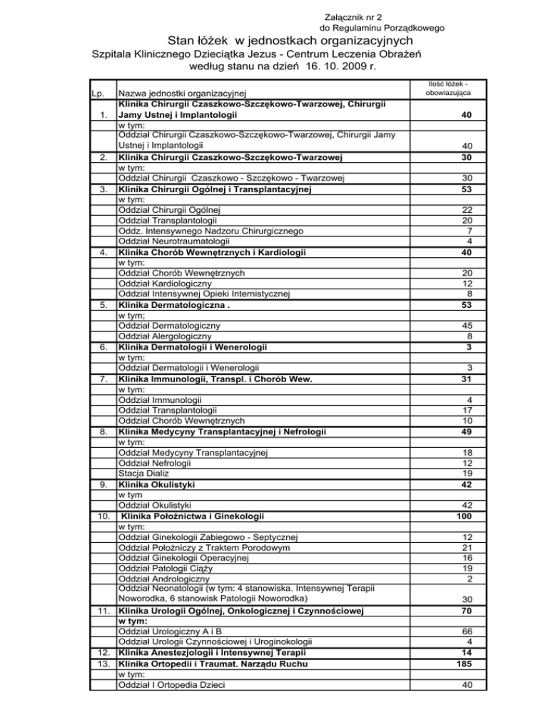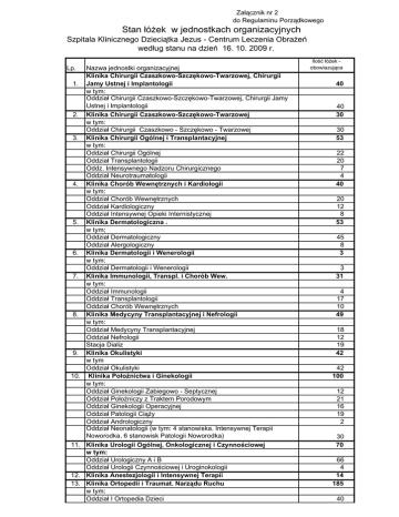 Załącznik nr 2 do Regulaminu Porządkowego Stan łóŜek w jednostkach organizacyjnych Szpitala Klinicznego Dzieciątka Jezus - Centrum Leczenia ObraŜeń według stanu na dzień 16. 10. 2009 r. Lp. 1. 2. 3. 4. 5. 6. 7. 8. 9. 10. 11. 12. 13. Nazwa jednostki organizacyjnej Klinika Chirurgii Czaszkowo-Szczękowo-Twarzowej, Chirurgii Jamy Ustnej i Implantologii w tym: Oddział Chirurgii Czaszkowo-Szczękowo-Twarzowej, Chirurgii Jamy Ustnej i Implantologii Klinika Chirurgii Czaszkowo-Szczękowo-Twarzowej w tym: Oddział Chirurgii Czaszkowo - Szczękowo - Twarzowej Klinika Chirurgii Ogólnej i Transplantacyjnej w tym: Oddział Chirurgii Ogólnej Oddział Transplantologii Oddz. Intensywnego Nadzoru Chirurgicznego Oddział Neurotraumatologii Klinika Chorób Wewnętrznych i Kardiologii w tym: Oddział Chorób Wewnętrznych Oddział Kardiologiczny Oddział Intensywnej Opieki Internistycznej Klinika Dermatologiczna . w tym; Oddział Dermatologiczny Oddział Alergologiczny Klinika Dermatologii i Wenerologii w tym: Oddział Dermatologii i Wenerologii Klinika Immunologii, Transpl. i Chorób Wew. w tym: Oddział Immunologii Oddział Transplantologii Oddział Chorób Wewnętrznych Klinika Medycyny Transplantacyjnej i Nefrologii w tym: Oddział Medycyny Transplantacyjnej Oddział Nefrologii Stacja Dializ Klinika Okulistyki w tym Oddział Okulistyki Klinika PołoŜnictwa i Ginekologii w tym: Oddział Ginekologii Zabiegowo - Septycznej Oddział PołoŜniczy z Traktem Porodowym Oddział Ginekologii Operacyjnej Oddział Patologii CiąŜy Oddział Andrologiczny Oddział Neonatologii (w tym: 4 stanowiska. Intensywnej Terapii Noworodka, 6 stanowisk Patologii Noworodka) Klinika Urologii Ogólnej, Onkologicznej i Czynnościowej w tym: Oddział Urologiczny A i B Oddział Urologii Czynnościowej i Uroginokologii Klinika Anestezjologii i Intensywnej Terapii Klinika Ortopedii i Traumat. Narządu Ruchu w tym: Oddział I Ortopedia Dzieci Ilość łóŜek obowiazująca 40 40 30 30 53 22 20 7 4 40 20 12 8 53 45 8 3 3 31 4 17 10 49 18 12 19 42 42 100 12 21 16 19 2 30 70 66 4 14 185 40 14. Oddział II Ortopedia Dorosłych Oddział III Traumatol. Narządu Ruchu Oddział IV Zapaleń Kości Oddział V Chirurgia Rekonstr i Chirur. Ręki Oddział VI Chirurgia Kolana Oddział Medycyny Ratunkowej w tym: Szpitalny Oddział Ratunkowy (SOR) Ogółem Warszawa, 16. 10. 2009 r. 50 50 15 15 15 10 10 720