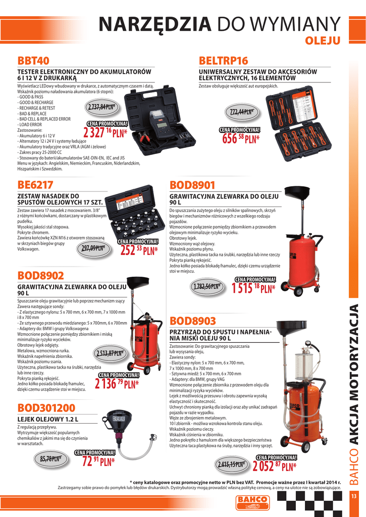 NARZĘDZIA DO WYMIANY OLEJU BBT40 BELTRP16 Tester elektroniczny do akumulatorów 6 i 12 V z drukarką Uniwersalny zestaw do akcesoriów elektrycznych, 16 elementów Wyświetlacz LEDowy wbudowany w drukarce, z automatycznym czasem i datą. Wskaźnik poziomu naładowania akumulatora (6 stopni): - GOOD & PASS - GOOD & RECHARGE PLN* - RECHARGE & RETEST - BAD & REPLACE - BAD CELL & REPLACED ERROR CENA PROMOCYJNA ! - LOAD ERROR Zastosowanie: - Akumulatory 6 i 12 V - Alternatory 12 i 24 V i systemy ładujące - Akumulatory tradycyjne oraz VRLA (AGM i żelowe) - Zakres pracy 25-2000 CC - Stosowany do baterii/akumulatorów SAE-DIN-EN, IEC and JIS Menu w językach: Angielskim, Niemieckim, Francuskim, Niderlandzkim, Hiszpańskim i Szwedzkim. Zestaw obsługuje większość aut europejskich. 2 737,84 772,44 PLN* 2 327 16 PLN* BE6217 656 58 PLN* CENA PROMOCYJNA ! BOD8901 Zestaw nasadek do spustów olejowych 17 szt. Grawitacyjna zlewarka do oleju 90 L Zestaw zawiera 17 nasadek z mocowaniem. 3/8” z różnymi końcówkami, dostarczany w plastikowym pudełku. Wysokiej jakości stal stopowa. Pokryte chromem. Zawiera końcówkę XZN M16 z otworem stosowaną w skrzyniach biegów grupy Volkswagen. PLN* Do spuszczania zużytego oleju z silników spalinowych, skrzyń biegów i mechanizmów różnicowych z wszelkiego rodzaju pojazdów. Wzmocnione połączenie pomiędzy zbiornikiem a przewodem olejowym minimalizuje ryzyko wycieku. Obrotowy lejek. Wzmocniony wąż olejowy. Wskaźnik poziomu płynu. Użyteczna, plastikowa tacka na śrubki, narzędzia lub inne rzeczy Pokryta pianką rękojeść. Jedno kółko posiada blokadę/hamulec, dzięki czemu urządzenie stoi w miejscu. 252 53 PLN* CENA PROMOCYJNA ! BOD8902 1 782,56 PLN* Grawitacyjna zlewarka do oleju 90 L Spuszczanie oleju grawitacyjnie lub poprzez mechanizm ssący Zawera następujące sondy: - Z elastycznego nylonu: 5 x 700 mm, 6 x 700 mm, 7 x 1000 mm i 8 x 700 mm - Ze sztywnego przewodu miedzianego: 5 x 700mm, 6 x 700mm - Adaptery do: BMW i grupy Volkswagena Wzmocnione połączenie pomiędzy zbiornikiem i miską minimalizuje ryzyko wycieków. Obrotowy lejek odgięty. Metalowa, wzmocniona rurka. PLN* Wskaźnik napełnienia zbiornika. Wskaźnik poziomu ssania. Użyteczna, plastikowa tacka na śrubki, narzędzia lub inne rzeczy. CENA PROMOCYJNA ! Pokryta pianką rękojeść. Jedno kółko posiada blokadę/hamulec, dzięki czemu urządzenie stoi w miejscu. 2 513,87 2 136 79 PLN* BOD301200 Lejek olejowy 1.2 l Z regulacją przepływu. Wytrzymuje większość popularnych chemikaliów z jakimi ma się do czynienia w warsztatach. 85,78 PLN* 72 91 PLN* 1 515 18 PLN* CENA PROMOCYJNA ! BOD8903 Przyrząd do spustu i napełniania miski oleju 90 l Zastosowanie: Do grawitacyjnego spuszczania lub wysysania oleju, Zawiera sondy: - Elastyczny nylon: 5 x 700 mm, 6 x 700 mm, 7 x 1000 mm, 8 x 700 mm - Sztywna miedź: 5 x 700 mm, 6 x 700 mm - Adaptery: dla BMW, grupy VAG Wzmocnione połączenie zbiornika z przewodem oleju dla minimalizacji ryzyka wycieków. Lejek z możliwością przesuwu i obrotu zapewnia wysoką elastyczność i skuteczność. Uchwyt chroniony pianką dla izolacji oraz aby unikać zadrapań pojazdu w razie wypadku. Węże ze zbrojeniem metalowym. 10 l zbiornik - możliwa wzrokowa kontrola stanu oleju. Wskaźnik poziomu cieczy. Wskaźnik ciśnienia w zbiorniku. Jedno pokrętło z hamulcem dla większego bezpieczeństwa Użyteczna taca plastykowa na śruby, narzędzia i inny sprzęt. CENA PROMOCYJNA ! 2 415,15 PLN* 2 052 87 PLN* CENA PROMOCYJNA ! * ceny katalogowe oraz promocyjne netto w PLN bez VAT. Promocje ważne przez I kwartał 2014 r. Zastrzegamy sobie prawo do pomyłek lub błędów drukarskich. Dystrybutorzy mogą prowadzić własną politykę cenową, a ceny na ulotce nie są zobowiązujące. Bahco akcja motoryzacja 297,09 13