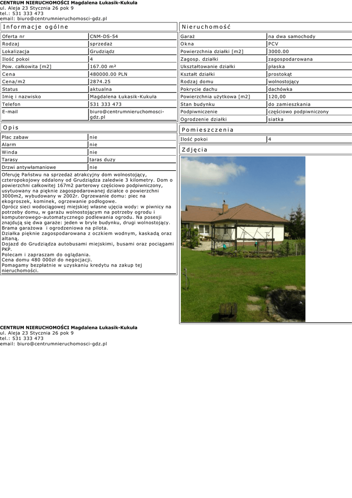 CENTRUM NIERUCHOMOŚCI Magdalena Łukasik-Kukuła ul. Aleja 23 Stycznia 26 pok 9 tel.: 531 333 473 email: [email protected] Informacje ogólne Nieruchomość Oferta nr CNM-DS-54 Garaż na dwa samochody Rodzaj sprzedaż Okna PCV Lokalizacja Grudziądz Powierzchnia działki [m2] 3000.00 Ilość pokoi 4 Zagosp. działki zagospodarowana Pow. całkowita [m2] 167.00 m² Ukształtowanie działki płaska Cena 480000.00 PLN Kształt działki prostokąt Cena/m2 2874.25 Rodzaj domu wolnostojący Status aktualna Pokrycie dachu dachówka Imię i nazwisko Magdalena Łukasik-Kukuła Powierzchnia użytkowa [m2] 120,00 Telefon 531 333 473 Stan budynku do zamieszkania E-mail [email protected] Podpiwniczenie częściowo podpiwniczony Ogrodzenie działki siatka Opis Pomieszczenia Plac zabaw nie Alarm nie Winda nie Tarasy taras duzy Drzwi antywłamaniowe nie Oferuję Państwu na sprzedaż atrakcyjny dom wolnostojący, czteropokojowy oddalony od Grudziądza zaledwie 3 kilometry. Dom o powierzchni całkowitej 167m2 parterowy częściowo podpiwniczony, usytuowany na pięknie zagospodarowanej działce o powierzchni 3000m2, wybudowany w 2002r. Ogrzewanie domu: piec na ekogroszek, kominek, ogrzewanie podłogowe. Oprócz sieci wodociągowej miejskiej własne ujęcia wody: w piwnicy na potrzeby domu, w garażu wolnostojącym na potrzeby ogrodu i komputerowego-automatycznego podlewania ogrodu. Na posesji znajdują się dwa garaże: jeden w bryle budynku, drugi wolnostojący. Brama garażowa i ogrodzeniowa na pilota. Działka pięknie zagospodarowana z oczkiem wodnym, kaskadą oraz altaną. Dojazd do Grudziądza autobusami miejskimi, busami oraz pociągami PKP. Polecam i zapraszam do oglądania. Cena domu 480 000zł do negocjacji. Pomagamy bezpłatnie w uzyskaniu kredytu na zakup tej nieruchomości. CENTRUM NIERUCHOMOŚCI Magdalena Łukasik-Kukuła ul. Aleja 23 Stycznia 26 pok 9 tel.: 531 333 473 email: [email protected] Ilość pokoi Zdjęcia 4