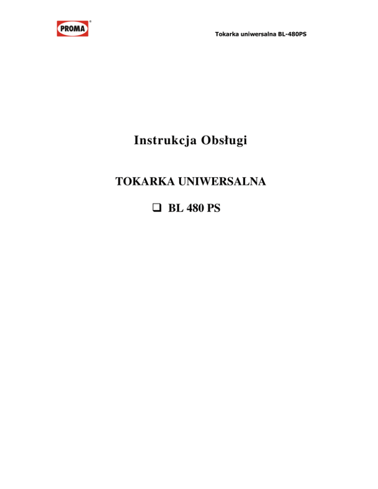 Tokarka uniwersalna BL-480PS Instrukcja Obsługi TOKARKA UNIWERSALNA BL 480 PS Tokarka uniwersalna BL-480PS Instrukcja obsługi 2 Tokarka uniwersalna BL-480PS SPIS TREŚCI 1. WSTĘP 1.1. Opis ogólny maszyny………………………………………………………………………………….…4 1.2. Parametry maszyny………………………………………………………………………………………6 1.3. Podstawowe zespoły, mechanizmy ..maszyny……………………………………………..………8 1.3.1. Elementy obsługi i regulacji mechanizmów tokarki. ……………………………………………….…9 2. BEZPIECZEŃSTWO PRACY 2.1. Zagrożenia w trakcie pracy maszyny…………………………………………………….……………10 2.2. Dopuszczalny poziom hałasu……………………………………………….………………………….10 2.3. Źródła niebezpieczeństwa……………………………………………….……………………………...10 2.4. Stanowisko pracy……………………………………………….……………………………………….11 2.5 . Osobiste wyposażenie ochronne……………………………………………….………………………11 2.6 . Środki bezpieczeństwa w miejscu ustawiania maszyny………………………………………………..11 2.7 . Urządzenia zabezpieczające BHP……………………………………………….………………………11 2.8. Postępowanie w razie wypadku lub awarii……………………………………………….………………11 3. INSTALACJA MASZYNY 3.1. Miejsce przeznaczone pod maszynę……………………………………………….…………………….12 3.2. Transport……………………………………………….………………………………………………...12 3.3. Rozpakowanie i odkonserwowanie……………………………………………….……………………..12 3.4. Montaż, fundamentowanie, ustawienie……………………………………………….…………………13 3.5. Podłączenie maszyny do sieci elektrycznej……………………………………………….…………….14 3.6. Uruchomienie……………………………………………….…………………………………………...14 4. PRACA NA MASZYNIE 4.1. Pulpit sterowniczy……………………………………………….………………………………………16 4.2. Czynności przygotowawcze do pracy ……………………………………………….………………….16 4.3. Dobór parametrów skrawania……………………………………………….…………………………..19 4.4. Prace na maszynie……………………………………………….………………………………………22 4.4.1. Przygotowanie maszyny do operacji toczenia wzdłużnego z ręcznym posuwem. ……………….….23 4.4.2. Przygotowanie maszyny do operacji toczenia wzdłużnego z mechanicznym posuwem. ……….…...23 4.4.3. Przygotowanie maszyny do operacji toczenia wzdłużnego w kłach. ……………….………………..23 4.4.4. Przygotowanie maszyny do operacji toczenia poprzecznego…………………………………………24 4.4.5. Przygotowanie maszyny do operacji toczenia stożków……………….……………………………….24 4.4.6. Toczenie gwintów……………….…………………………………………………………………….25 5. OBSŁUGA EKSPLOATACYJNA 5.1. Konserwacja, smarowanie……………………………………………….…………………………………….27 5.2. Regulacja zespołów i mechanizmów……………………………………………….………………………….29 5.2.1. Regulacja końcówki wrzeciona, montaż uchwytu tokarskiego……………………………………………...29 5.2.2. Regulacja konika tokarskiego……………………………………………….……………………………….30 5.2.3. Wymiana i regulacja naciągu pasków napędowych. ……………………………………………….……….30 5.2.4. Dobór kół zmianowych i regulacja przekładni gitarowej……………………………………………….….31 5.2.5. Regulacja luzu sań poprzecznych i nakrętki……………………………………………….………………...31 5.2.6. Regulacja łożysk wrzeciona ( specyfikacja części skrzyni prędkości ). ……………………………….…...32 5.2.7. Regulacja luzu osiowego śruby pociągowej (specyfikacja części łoża ). …………………………….……32 5.2.8. Podtrzymka stała, ruchoma ……………………………………………….………………………………...32 5.3. Specyfikacja łożysk……………………………………………….…………………………………………....33 5.4. Schemat kinematyczny tokarki……………………………………………….………………………………..33 5.5. Naprawy i remonty……………………………………………….…………………………………………….33 6. SPECYFIKACJA CZĘŚCI TOKAREK ……………………………………………….………………..34 7. INSTRUKCJA OBSŁUGI ( część elektryczna) ……………………………………………….………39 7.1. Wykaz elektrycznych elementów i części zamiennych ……………………………………………….………40 7.2. Schematy elektryczne dla maszyny……………………………………………….…………………………...41 Instrukcja obsługi 3 Tokarka uniwersalna BL-480PS 1. WSTĘP 1.1. Opis ogólny maszyny Charakterystyka maszyny Tokarka uniwersalna typu BL-480PS jest przeznaczona do wszelkiego rodzaju prac tokarskich. M