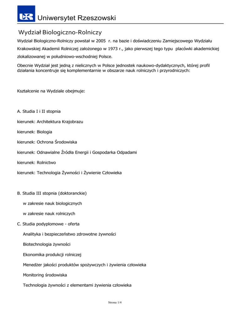 Uniwersytet Rzeszowski Wydział Biologiczno-Rolniczy Wydział Biologiczno-Rolniczy powstał w 2005 r. na bazie i doświadczeniu Zamiejscowego Wydziału Krakowskiej Akademii Rolniczej założonego w 1973 r., jako pierwszej tego typu placówki akademickiej zlokalizowanej w południowo-wschodniej Polsce. Obecnie Wydział jest jedną z nielicznych w Polsce jednostek naukowo-dydaktycznych, której profil działania koncentruje się komplementarnie w obszarze nauk rolniczych i przyrodniczych: Kształcenie na Wydziale obejmuje: A. Studia I i II stopnia kierunek: Architektura Krajobrazu kierunek: Biologia kierunek: Ochrona Środowiska kierunek: Odnawialne Źródła Energii i Gospodarka Odpadami kierunek: Rolnictwo kierunek: Technologia Żywności i Żywienie Człowieka B. Studia III stopnia (doktoranckie) w zakresie nauk biologicznych w zakresie nauk rolniczych C. Studia podyplomowe - oferta Analityka i bezpieczeństwo zdrowotne żywności Biotechnologia żywności Ekonomika produkcji rolniczej Menedżer jakości produktów spożywczych i żywienia człowieka Monitoring środowiska Technologia żywności z elementami żywienia człowieka Strona 1/4 Uniwersytet Rzeszowski Technologie w systemach produkcji rolniczej i rozwój obszarów wiejskich Strona 2/4 Uniwersytet Rzeszowski Żywność, gastronomia i dietetyka Enologia Liczba studentów na wydziale w roku akademickim 2015/2016 wynosiła ponad 1600 osób, natomiast liczba absolwentów wszystkich form kształcenia - ok. 1500. Kształcenie prowadzone jest na studiach stacjonarnych i niestacjonarnych. Badania prowadzone przez pracowników naukowo-dydaktycznych, zatrudnionych na Wydziale mają walor poznawczy jak i utylitarny ukierunkowany na współpracę z biznesem, przemysłem i jednostkami samorządowymi. Tematyka tych badań koncentruje się między innymi na następujących zagadnieniach: procesy życiowe zachodzące w komórkach, tkankach i w całym organizmie rośliny, dziedziczność cech roślin uprawnych, metody i sposoby ochrony roślin przed chorobami, procesy biosyntezy i biotransformacji przebiegające z udziałem drobnoustrojów, kultur tkankowych oraz enzymów, otrzymywanie tzw. bioproduktów, żywienie i uwarunkowania związane z jakością życia, badanie wytwarzania, użytkowania i gromadzenia energii przez żywą komórkę, badanie warunków środowiska pod kątem zdrowotnym i żywieniowym, wyhodowanie żywności do bezpośredniej konsumpcji jak i do przetworzenia, rozwiązania techniczno-technologiczne podnoszące innowacyjność i konkurencyjność producentów żywności, kształtowanie wartości odżywczej oraz bezpieczeństwa zdrowotnego żywności, rozwój rynku żywności w Polsce w kontekście zmian zachowań konsumentów (żywność ekologiczna, funkcjonalna, kształtowanie i ochrona środowiska naturalnego, technologie zagospodarowania odpadów i biomasy na energię aspekcie polityki energetycznej kraju. Pracownicy Wydziału biorą aktywny udział w licznych programach, kampaniach, akcjach i imprezach upowszechniających naukę. Do najważniejszych działań popularyzujących naukę prowadzonych przez Wydział należą: zajęcia dla młodzieży w ramach warsztaty dla klas akademickich z zakresu biologii i nauk o środowisku rozwijające uzdolnienia biologiczne uczniów, udział w realizacji filmów przyrodniczych promujących walory przyrodnicze Parków Narodowych i obszarów Natura 2000, realizacja projektu cykl wykładów otwartych dla młodzieży "Biologia dla każdego" w ramach Światowych Dni Wody, "Wprowadzenie do ekologii i ochrony środowiska" w ramach realizacji programu rozwoju rolnictwa ekologicznego na Podkarpaciu, Strona 3/4 Uniwersytet Rzeszowski cykl wykładów otwartych realizowanych w ramach Podkarpackiego Oddziału Polskiego Towarzystwa Technologów Żywności, edukacja w zakresie żywienia człowieka, oraz najnowsze osiągnięcia nauki, uniwersytecki Portal Wiedzy dotyczący żywności oraz żywienia człowieka, skierowany do uczniów szkół ponadgimnazjalnych, patronat merytoryczny oraz realizacja projektów badawczo-edukacyjnych i dydaktycznych, warsztaty terenowe w BdPN dla nauczycieli biologii szkół Ponadgimnazjalnych, konferencje dla pracowników Bieszczadzkiego Parku Narodowego. Chcesz zdobyć atrakcyjny zawód - podejmij studia na kierunkach Wydziału Biologiczno-Rolniczego Nasz Wydział zapewnia: kształcenie na wysokim poziomie, profesjonalną kadrę, dostęp do nowoczesnej i unikalnej aparatury, rozwijanie umiejętności zgodnie z własnymi zainteresowaniami, przyjazny i otwarty klimat studiowania, warunki do rozwijania swoich pasji oraz aktywnego spędzenia czasu pozalekcyjnego, możliwość studiowania w ramach wymiany zagranicznej studentów, profesjonalne kształcenie językowe, warunki do studiowania dla osób niepełnosprawnych. Strona 4/4 Powered by TCPDF (www.tcpdf.org)