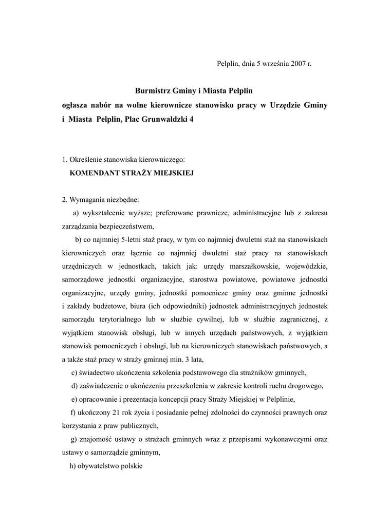 Pelplin, dnia 5 września 2007 r. Burmistrz Gminy i Miasta Pelplin ogłasza nabór na wolne kierownicze stanowisko pracy w Urzędzie Gminy i Miasta Pelplin, Plac Grunwaldzki 4 1. Określenie stanowiska kierowniczego: KOMENDANT STRAŻY MIEJSKIEJ 2. Wymagania niezbędne: a) wykształcenie wyższe; preferowane prawnicze, administracyjne lub z zakresu zarządzania bezpieczeństwem, b) co najmniej 5-letni staż pracy, w tym co najmniej dwuletni staż na stanowiskach kierowniczych oraz łącznie co najmniej dwuletni staż pracy na stanowiskach urzędniczych w jednostkach, takich jak: urzędy marszałkowskie, wojewódzkie, samorządowe jednostki organizacyjne, starostwa powiatowe, powiatowe jednostki organizacyjne, urzędy gminy, jednostki pomocnicze gminy oraz gminne jednostki i zakłady budżetowe, biura (ich odpowiedniki) jednostek administracyjnych jednostek samorządu terytorialnego lub w służbie cywilnej, lub w służbie zagranicznej, z wyjątkiem stanowisk obsługi, lub w innych urzędach państwowych, z wyjątkiem stanowisk pomocniczych i obsługi, lub na kierowniczych stanowiskach państwowych, a a także staż pracy w straży gminnej min. 3 lata, c) świadectwo ukończenia szkolenia podstawowego dla strażników gminnych, d) zaświadczenie o ukończeniu przeszkolenia w zakresie kontroli ruchu drogowego, e) opracowanie i prezentacja koncepcji pracy Straży Miejskiej w Pelplinie, f) ukończony 21 rok życia i posiadanie pełnej zdolności do czynności prawnych oraz korzystania z praw publicznych, g) znajomość ustawy o strażach gminnych wraz z przepisami wykonawczymi oraz ustawy o samorządzie gminnym, h) obywatelstwo polskie i) nieposzlakowana opinia, j) stan zdrowia pozwalający na zatrudnienie na wyżej wymienionym stanowisku zgodnie z rozporządzeniem Ministra Zdrowia z dnia 1 września 2004 r. (Dz. U. Nr 205, poz. 2105), k) uregulowany stosunek do służby wojskowej. 3. Wymagania dodatkowe: a) umiejętność obsługi komputera i urządzeń biurowych, b) prawo jazdy, c) preferowane posiadanie kursów specjalistycznych, d) umiejętność dobrej organizacji pracy, e) samodzielność, kreatywność i inicjatywa, f) wysoka kultura osobista. 4. Zakres zadań wykonywanych na stanowisku: Zgodnie z ustawą z dnia 20 sierpnia 1997 r. o strażach gminnych (Dz.U. z 1997 r. nr 123, poz. 779 ze zm.) oraz wykonywanie innych czynności służbowych na polecenie przełożonych. 5. Wymagane dokumenty: a) dokumenty poświadczające wykształcenie i ukończone szkolenia, b) list motywacyjny, c) dokumenty potwierdzające doświadczenie zawodowe d) kwestionariusz osobowy dla osoby ubiegającej się o zatrudnienie, e) oświadczenie o niekaralności, f) oświadczenie o wyrażeniu zgody na przetwarzanie danych osobowych zawartych w ofercie pracy, g) oświadczenie o wyrażeniu zgody na poddaniu się badaniom lekarskim i psychologicznym. 6. Termin i miejsce składania ofert: Wymagane dokumenty należy składać na adres: Sekretariat Urzędu Gminy i Miasta Pelplin, 83-130 Pelplin, Plac Grunwaldzki 4 w terminie do dnia 20 września 2007 r. do godz. 12,00, zapakowane w zamkniętą kopertę z dopiskiem: Nabór na stanowisko Komendanta Straży Miejskiej Oferty, które wpłyną po wyżej wymienionym terminie nie będą rozpatrywane.