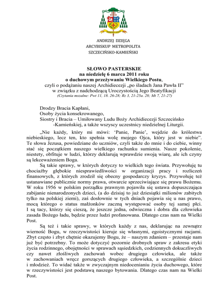 -1- ANDRZEJ DZIĘGA ARCYBISKUP METROPOLITA SZCZECIŃSKO-KAMIEŃSKI SŁOWO PASTERSKIE na niedzielę 6 marca 2011 roku o duchowym przeŜywaniu Wielkiego Postu, czyli o podąŜaniu naszej Archidiecezji „po śladach Jana Pawła II” w związku z nadchodzącą Uroczystością Jego Beatyfikacji (Czytania mszalne: Pwt 11, 18. 26-28; Rz 3, 21-25a. 28; Mt 7, 21-27) Drodzy Bracia Kapłani, Osoby Ŝycia konsekrowanego, Siostry i Bracia – Umiłowany Ludu BoŜy Archidiecezji Szczecińsko -Kamieńskiej, a takŜe wszyscy uczestnicy niedzielnej Liturgii. „Nie kaŜdy, który mi mówi: ‘Panie, Panie’, wejdzie do królestwa niebieskiego, lecz ten, kto spełnia wolę mojego Ojca, który jest w niebie”. Te słowa Jezusa, powiedziane do uczniów, czyli takŜe do mnie i do ciebie, winny stać się początkiem naszego wielkiego rachunku sumienia. Nasze pokolenie, niestety, obfituje w ludzi, którzy deklarują wprawdzie swoją wiarę, ale ich czyny są lekcewaŜeniem Boga. Są takie sprawy, w których dotyczy to wielkich tego świata. Przywołuję tu chociaŜby głębokie niesprawiedliwości w organizacji pracy i rozliczeń finansowych, z których zrodził się obecny gospodarczy kryzys. Przywołuję teŜ ustanawiane publicznie normy prawa, otwarcie sprzeciwiające się prawu BoŜemu. W roku 1956 w polskim porządku prawnym pojawiła się ustawa dopuszczająca zabijanie nienarodzonych dzieci, (a do dzisiaj to juŜ dziesiątki milionów zabitych tylko na polskiej ziemi), zaś dosłownie w tych dniach pojawia się u nas prawo, mocą którego o status małŜonków zaczną występować osoby tej samej płci. I są tacy, którzy się cieszą, Ŝe jeszcze jedna, odwieczna i dobra dla człowieka zasada BoŜego ładu, będzie przez ludzi profanowana. Dlatego czas nam na Wielki Post. Są teŜ i takie sprawy, w których kaŜdy z nas, deklarując na zewnątrz wierność Bogu, w rzeczywistości kieruje się własnymi, egoistycznymi racjami. Zbyt często i zbyt chętnie okazujemy Bogu, Ŝe – naszym zdaniem – przestaje nam juŜ być potrzebny. To moŜe dotyczyć pozornie drobnych spraw z zakresu etyki Ŝycia rodzinnego, obojętności w sprawach sąsiedzkich, codziennych dokuczliwych czy nawet złośliwych zachowań wobec drugiego człowieka, ale takŜe w zachowaniach wręcz gorszących drugiego człowieka, a szczególnie dzieci i młodzieŜ. To widać takŜe w zwyczajnym niedocenianiu Ŝycia duchowego, które w rzeczywistości jest podstawą naszego bytowania. Dlatego czas nam na Wielki Post. -2- W dzisiejszej Ewangelii Jezus – dla naszego własnego dobra – niemal zmusza nas, byśmy zechcieli postawić sobie wewnętrzne, szczere pytanie o prawdziwą motywację naszych codziennych wyborów i czynów. Jednocześnie zachęca nas, byśmy nie bali się kierować wolą Boga. Jezus wręcz zapowiada nadchodzący dramat wielu pozornych swoich uczniów, na zewnątrz deklarujących, a nawet postępujących wobec ludzi zgodnie z zasadami Ewangelii, jednak wewnętrznie kierujących się zupełnie innymi racjami. Umiłowani. Czas nam na Wielki Post. Ten błogosławiony okres Wielkiego Postu jest nam proponowany kaŜdego roku przez Kościół Święty – duchową Matkę naszą. To sprawdzony program duchowego uporządkowania, zaprowadzenia zgodności pomiędzy tym, za czym wobec Boga najgłębiej tęsknimy, a tym, co czynimy. JuŜ za MojŜesza brzmiało słowo Boga: „Weźcie sobie te moje słowa do serca i do duszy. /.../ Kładę dziś przed wami błogosławieństwo albo przekleństwo”. Siostro i Bracie! To ty wybierasz drogę twojego Ŝycia. Bóg moŜe cię tylko prosić. Zmuszać cię nie będzie, chociaŜ będzie cierpiał, jeśli źle wybierzesz. Jesteś przecieŜ wolny. Dlatego potem twoja jest teŜ radość albo gorycz skutków wyboru. Wielki Post to czas błogosławiony dla zwyczajnych uczniów Jezusa. Jako katolicy moŜemy uczynić Wielki Post czasem wielkiej duchowej radości. Takie przeŜywanie tego Okresu jest duchowym obowiązkiem kaŜdego katolika. Przypominam o tym. Jest to szczególny czas na modlitwę, na post i na jałmuŜnę. Najpierw modlitwa. W okresie Wielkiego Postu świadomie rezygnujemy z róŜnych czynności, skądinąd dobrych, ale jednak niekoniecznych, aby w ten sposób odzyskać czas na konieczną modlitwę. Bez modlitwy nie rozpoznamy naszej drogi. Nie przyjmiemy Słowa Boga owocnie. Stąd potrzeba powrotu do modlitwy małŜeńskiej i rodzinnej. Sprawdzonych form tej modlitwy jest bardzo wiele. Ja mogę w tym roku szczególnie zachęcać do rodzinnego czytania i medytacji Pisma świętego, do rodzinnego udziału w naboŜeństwach pokutnych, w tym do Drogi KrzyŜowej oraz do – refleksyjną melodią opatrzonej – polskiej medytacji Męki Pańskiej zwanej: Gorzkie śale. Osobiście chcę teŜ zachęcić do oŜywienia modlitwy róŜańcowej. To szczególna prośba Matki BoŜej, przekazana w czasie uznanych przez Kościół objawień w Lourdes, w Gietrzwałdzie oraz w Fatimie, jako metoda uproszenia zmian na lepsze w Ŝyciu osobistym a takŜe w całym świecie. To teŜ błaganie Matki BoŜej, przekazywane w wielu widzeniach osób prywatnych, o których jeszcze się Kościół formalnie nie wypowiedział. To takŜe wyrazista zachęta i osobisty przykład Jana Pawła II dla naszego pokolenia. RóŜaniec ułatwia uczczenie Boga w tajemnicach Jego dzieł, a takŜe uczczenie Maryi – wiernej SłuŜebnicy Pańskiej, z racji na Jej współdziałanie z Bogiem. Pozwala takŜe na medytacyjne przeŜywanie dwudziestu wskazanych przez Kościół tajemnic Boga, działającego aktywnie dla uratowania kaŜdego człowieka i wybawienia go od złego. Ta modlitwa, prosta i głęboka jak rzadko która, pozwala kaŜdemu takŜe na pogłębioną refleksję nad własnym Ŝyciem i na naprawę wielu Ŝyciowych spraw. Pozwala teŜ wymodlić innym łaskę współpracy z Bogiem i Maryją. O tę modlitwę są proszone dzieci i młodzieŜ, aktualna zaś pozostaje ta prośba wobec wszystkich dorosłych. Kochani. W ten 