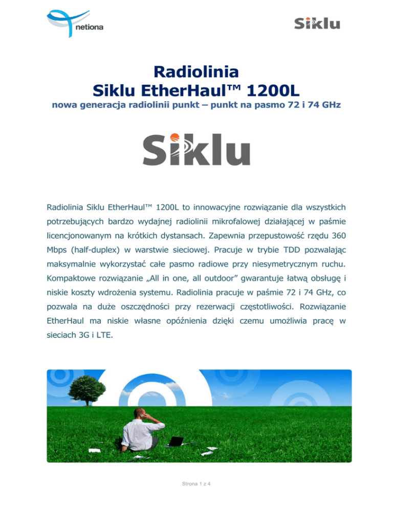 Radiolinia Siklu EtherHaul™ 1200L nowa generacja radiolinii punkt – punkt na pasmo 72 i 74 GHz Radiolinia Siklu EtherHaul™ 1200L to innowacyjne rozwiązanie dla wszystkich potrzebujących bardzo wydajnej radiolinii mikrofalowej działającej w paśmie licencjonowanym na krótkich dystansach. Zapewnia przepustowość rzędu 360 Mbps (half-duplex) w warstwie sieciowej. Pracuje w trybie TDD pozwalając maksymalnie wykorzystać całe pasmo radiowe przy niesymetrycznym ruchu. Kompaktowe rozwiązanie „All in one, all outdoor” gwarantuje łatwą obsługę i niskie koszty wdrożenia systemu. Radiolinia pracuje w paśmie 72 i 74 GHz, co pozwala na duże oszczędności przy rezerwacji częstotliwości. Rozwiązanie EtherHaul ma niskie własne opóźnienia dzięki czemu umożliwia pracę w sieciach 3G i LTE. Strona 1 z 4 www.netiona.pl Główne cechy rozwiązania: Duża przepływność przepustowość rzędu 360 Mbps w warstwie sieciowej Kompaktowe zintegrowane rozwiązanie All In One, All Outdoor oraz niska rozwiązanie waga radiolinii (około 3 kg.) skraca proces instalacji i czyni go szybkim, prostym i niedrogim Wysokie pasmo „E” niewielkie koszty rezerwacji częstotliwości w paśmie E: – niewielkie opłaty 74GHz 500MHz – 150 zł/rok Niskie opóźnienia niskie własne opóźnienia (około 200 μsec wliczając przełączanie), co umożliwia pracę w sieciach 3G i LTE Skalowalność Model EtherHaul 1200 będzie umożliwiał łatwą rozbudowę pozwalając operatorom na rozwijanie sieci w miarę rosnących potrzeb w myśl zasady “pay-as-you grow”. Pojemność i dodatkowe funkcje będą mogły być zmieniane programowo Mały pobór mocy pobór energii urządzenia w granicach 20W znacząco wpływa na oszczędność w eksploatacji Dystans w polskich warunkach środowiskowych maksymalny dystans wynosi około 2 km. Tryb dostępu TDD pozwalający efektywnie wykorzystać pasmo radiowe w przypadku niesymetrycznej transmisji z możliwością regulacji podziału od 50:50 do 25:75 Szyfrowanie AES (po wykupieniu licencji) Interfejsy 10/100/1000Base-T (RJ-45) i SFP 1000Base-LX (1310 nm), SX (850 nm) Obsługa VLANów do 4096 aktywnych VLANów, IEEE 802.1ad (QinQ) QoS bazujący na 802.1Q (VLAN tags), umożliwia alokację zasobów sieciowych w sposób gwarantujący transmisję danych w sposób określony przez operatora Strona 2 z 4 www.netiona.pl Dzięki wymienionym cechom Radiolinia Siklu EH – 1200L idealnie nadaje się dla: operatorów telefonii komórkowej potrzebujących dużych przepływności zastosowań biznesowych – do połączenia oddziałów firm, magazynów, zakładów produkcyjnych połączenia jednostek organizacyjnych administracji publicznej sądownictwa sieci monitoringu (CCTV, monitoring miejski) łączenia oddziałów terenowych szkół czy jednostek opieki zdrowotnej Specyfikacja techniczna: Częstotliwość : 72 i 74 GHz Szerokość kanału: 500 MHz Modulacja: QPSK Typ interfejsu: 10/100/1000BaseX (RJ-45) i optyczny: MMF - 1000BaseSX, SMF - 1000BaseLX Zintegrowany przełącznik warstwy 2 Provider Bridge (802.1ad) Tryb pracy: TDD, zmienna szerokość kanału, kodowania i modulacji (Adaptive Bandwidth, Coding and Modulation - ABC&M) Carrier Ethernet: Zgodność z wymaganiami MEF (Metro Ethernet Forum) Zasilanie: DC i Power over Ethernet (PoE) Moc nadajnika: typowo 5 dBm Antena: średnica 26 cm, zysk 42 dBi Obsługa architektury sieci: Point-to-point, protected p2p, mesh, daisy-chain, ring Modem OFDM zrealizowany na pojedynczym układzie Strona 3 z 4 www.netiona.pl Dystrybucja rozwiązań Siklu Oferty handlowe: [email protected] Wsparcie techniczne przed i po zakupie: [email protected] Netiona Sp. z o.o. tel: (22) 201 25 26 ul. Juranda ze Spychowa 19D www.netiona.pl 03-257 Warszawa [email protected] Cyberbajt Infolinia: 801 000 171 ul. Młyńska 27 www.cyberbajt.pl 22-400 Zamość [email protected] Strona 4 z 4