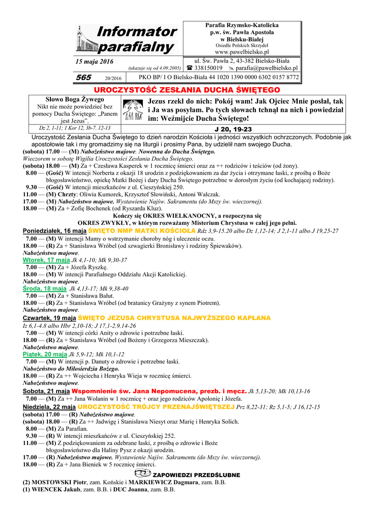 Parafia Rzymsko-Katolicka p.w. św. Pawła Apostoła w Bielsku-Białej Osiedle Polskich Skrzydeł 15 maja 2016 565 20/2016 www.pawelbielsko.pl ul. Św. Pawła 2, 43-382 Bielsko-Biała (ukazuje się od 4.09.2005) 338150019 [email protected] PKO BP/ I O Bielsko-Biała 44 1020 1390 0000 6302 0157 8772 UROCZYSTOŚĆ ZESŁANIA DUCHA ŚWIĘTEGO Słowo Boga Żywego Nikt nie może powiedzieć bez pomocy Ducha Świętego: „Panem jest Jezus”. Jezus rzekł do nich: Pokój wam! Jak Ojciec Mnie posłał, tak i Ja was posyłam. Po tych słowach tchnął na nich i powiedział im: Weźmijcie Ducha Świętego! Dz 2, 1-11; 1 Kor 12, 3b-7. 12-13 J 20, 19-23 Uroczystość Zesłania Ducha Świętego to dzień narodzin Kościoła i jedności wszystkich ochrzczonych. Podobnie jak apostołowie tak i my gromadzimy się na liturgii i prosimy Pana, by udzielił nam swojego Ducha. (sobota) 17.00 — (M) Nabożeństwo majowe. Nowenna do Ducha Świętego. Wieczorem w sobotę Wigilia Uroczystości Zesłania Ducha Świętego. (sobota) 18.00 — (M) Za + Czesława Kasperek w 1 rocznicę śmierci oraz za ++ rodziców i teściów (od żony). 8.00 — (Gość) W intencji Norberta z okazji 18 urodzin z podziękowaniem za dar życia i otrzymane łaski, z prośbą o Boże błogosławieństwo, opiekę Matki Bożej i dary Ducha Świętego potrzebne w dorosłym życiu (od kochającej rodziny). 9.30 — (Gość) W intencji mieszkańców z ul. Cieszyńskiej 250. 11.00 — (M) Chrzty: Oliwia Kumorek, Krzysztof Słowiński, Antoni Walczak. 17.00 — (M) Nabożeństwo majowe. Wystawienie Najśw. Sakramentu (do Mszy św. wieczornej). 18.00 — (M) Za + Zofię Bochenek (od Ryszarda Kluz). Kończy się OKRES WIELKANOCNY, a rozpoczyna się OKRES ZWYKŁY, w którym rozważamy Misterium Chrystusa w całej jego pełni. Poniedziałek, 16 maja ŚWIĘTO NMP MATKI KOŚCIOŁA Rdz 3,9-15.20 albo Dz 1,12-14; J 2,1-11 albo J 19,25-27 7.00 — (M) W intencji Mamy o wstrzymanie choroby nóg i uleczenie oczu. 18.00 — (R) Za + Stanisława Wróbel (od szwagierki Bronisławy i rodziny Śpiewaków). Nabożeństwo majowe. Wtorek, 17 maja Jk 4,1-10; Mk 9,30-37 7.00 — (M) Za + Józefa Ryszkę. 18.00 — (M) W intencji Parafialnego Oddziału Akcji Katolickiej. Nabożeństwo majowe. Środa, 18 maja Jk 4,13-17; Mk 9,38-40 7.00 — (M) Za + Stanisława Bałut. 18.00 — (R) Za + Stanisława Wróbel (od bratanicy Grażyny z synem Piotrem). Nabożeństwo majowe. Czwartek, 19 maja ŚWIĘTO JEZUSA CHRYSTUSA NAJWYŻSZEGO KAPŁANA Iz 6,1-4.8 albo Hbr 2,10-18; J 17,1-2.9.14-26 7.00 — (M) W intencji córki Anity o zdrowie i potrzebne łaski. 18.00 — (R) Za + Stanisława Wróbel (od Bożeny i Grzegorza Mieszczak). Nabożeństwo majowe. Piątek, 20 maja Jk 5,9-12; Mk 10,1-12 7.00 — (M) W intencji p. Danuty o zdrowie i potrzebne łaski. Nabożeństwo do Miłosierdzia Bożego. 18.00 — (R) Za ++ Wojciecha i Henryka Wieja w rocznicę śmierci. Nabożeństwo majowe. Sobota, 21 maja Wspomnienie św. Jana Nepomucena, prezb. i męcz. Jk 5,13-20; Mk 10,13-16 7.00 — (M) Za ++ Jana Wolanin w 1 rocznicę + oraz jego rodziców Apolonię i Józefa. Niedziela, 22 maja UROCZYSTOŚĆ TRÓJCY PRZENAJŚWIĘTSZEJ Prz 8,22-31; Rz 5,1-5; J 16,12-15 (sobota) 17.00 — (R) Nabożeństwo majowe. (sobota) 18.00 — (R) Za ++ Jadwigę i Stanisława Niesyt oraz Marię i Henryka Solich. 8.00 — (M) Za Parafian. 9.30 — (R) W intencji mieszkańców z ul. Cieszyńskiej 252. 11.00 — (M) Z podziękowaniem za odebrane łaski, z prośbą o zdrowie i Boże błogosławieństwo dla Haliny Pysz z okazji urodzin. 17.00 — (R) Nabożeństwo majowe. Wystawienie Najśw. Sakramentu (do Mszy św. wieczornej). 18.00 — (R) Za + Jana Bieniek w 5 rocznicę śmierci. ZAPOWIEDZI PRZEDŚLUBNE (2) MOSTOWSKI Piotr, zam. Końskie i MARKIEWICZ Dagmara, zam. B.B. (1) WIENCEK Jakub, zam. B.B. i DUC Joanna, zam. B.B. OGŁOSZENIA DUSZPASTERSKIE 1. 2. 3. 4. Dzisiejsza składka (ogólnopolska) przeznaczona jest na cele Światowych Dni Młodzieży. W niedzielę 29.05. na Mszy Św. o godz. 930 ubiegłoroczne dzieci I-komunijne będą świętowały rocznicę tego ważnego wydarzenia! Nabożeństwa majowe, w naszym kościele są w sobotę i niedzielę o 1700 a w pozostałe dni tygodnia po Mszy św. wieczornej. W czwartek od godz. 1700 spotkanie dla kandydatów do bierzmowania (wcześniej okazja do spowiedzi św.!) a po nabożeństwie majowym spotkanie dla wspólnego czytania Pisma Św. DIAKONIA SPRZĄTANIA Dziękujemy mieszkańcom z ul. Skrzydlewskiego 5 za posprzątanie kościoła, wystrój kwiatowy i ofiarę na kościół. Msza św. w ich intencji będzie sprawowana 10.07.br. o godz. 930. W najbliższą sobotę o posługę czystości prosimy mieszkańców z ul. Skrzydlewskiego 9. „BOŻE CIAŁO” 2016 26 maja br. przypada uroczystość Najświętszego Ciała i Krwi Chrystusa, zwana popularnie uroczystością Bożego Ciała, i związana z nią procesja. W tym roku pójdziemy ulicami: św. Pawła, Tańskiego, Skrzydlewskiego, Trzech Diamentów, Tańskiego i wrócimy św. Pawła. Proponowane miejsca zatrzymania przy 4 ołtarzach: I –Tańskiego 11; II – Skrzydlewskiego 9; III – Trzech Diamentów 69; IV – św. Pawła 3. W przygotowanie „ołtarzy” prosimy by zaangażowali się nie tylko właściciele czy mieszkańcy posesji, ale także inni. Odpowiedzialnych za ołtarze prosimy o kontakt z Ks. Proboszczem! DIECEZJALNA PIELGRZYMKA LUDZI CHORYCH do sanktuarium Matki Bożej Bolesnej w Bielsku-Białej Hałcnowie, odbędzie się w poniedziałek, 16 maja br. (liturgiczne święto Najświętszej Maryi Panny Matki Kościoła). Początek o godzinie 1400 celebracją Eucharystii, której będzie przewodniczył Ksiądz Biskup Piotr Greger. KLUB INTELIGENCJI KATOLICKIEJ Klub Inteligencji Katolickiej zaprasza w ramach OBCHODÓW JUBILEUSZU 1050-LECIA CHRZTU POLSKI na WYKŁAD ks. dra JANA DURAJA w KSIĄŻNICY BESKIDZKIEJ 18 maja 2016 r. godz. 1700. DUSZPASTERSTWO NAUCZYCIELI Wszystkich Nauczycieli, Wychowawców i prac