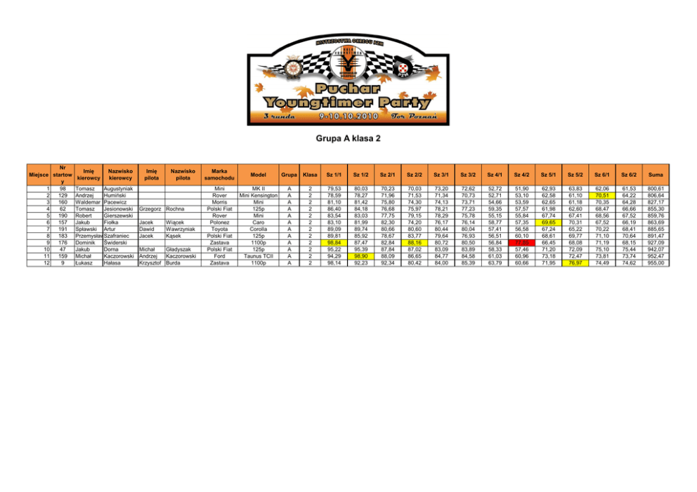 Grupa A klasa 2 Nr Miejsce startow y 1 98 2 129 3 160 4 62 5 190 6 157 7 191 8 183 9 176 10 47 11 159 12 9 Imię kierowcy Nazwisko kierowcy Tomasz Augustyniak Andrzej Humiński Waldemar Pacewicz Tomasz Jesionowski Robert Gierszewski Jakub Fiołka Spławski Artur PrzemysławSzafraniec Dominik Świderski Jakub Dorna Michał Kaczorowski Łukasz Hałasa Imię pilota Nazwisko pilota Grzegorz Rochna Jacek Dawid Jacek Wiącek Wawrzyniak Kąsek Michał Gładyszak Andrzej Kaczorowski Krzysztof Burda Marka samochodu Model Grupa Klasa Sz 1/1 Sz 1/2 Sz 2/1 Sz 2/2 Sz 3/1 Sz 3/2 Sz 4/1 Sz 4/2 Sz 5/1 Sz 5/2 Sz 6/1 Sz 6/2 Suma Mini Rover Morris Polski Fiat Rover Polonez Toyota Polski Fiat Zastava Polski Fiat Ford Zastava MK II Mini Kensington Mini 125p Mini Caro Corolla 125p 1100p 125p Taunus TCII 1100p A A A A A A A A A A A A 2 2 2 2 2 2 2 2 2 2 2 2 79,53 78,59 81,10 86,40 83,54 83,10 89,09 89,81 98,84 95,22 94,29 98,14 80,03 78,27 81,42 84,18 83,03 81,99 89,74 85,92 87,47 95,39 98,90 92,23 70,23 71,96 75,80 76,68 77,75 82,30 80,66 78,67 82,84 87,84 88,09 92,34 70,03 71,53 74,30 75,97 79,15 74,20 80,60 83,77 88,16 87,02 86,65 80,42 73,20 71,34 74,13 78,21 78,29 76,17 80,44 79,64 80,72 83,09 84,77 84,00 72,62 70,73 73,71 77,23 75,78 76,14 80,04 76,93 80,50 83,89 84,58 85,39 52,72 52,71 54,66 59,35 55,15 58,77 57,41 56,51 56,84 58,33 61,03 63,79 51,90 53,10 53,59 57,57 55,84 57,35 56,58 60,10 77,85 57,46 60,96 60,66 62,93 62,58 62,65 61,98 67,74 69,65 67,24 68,61 66,45 71,20 73,18 71,95 63,83 61,10 61,18 62,60 67,41 70,31 65,22 69,77 68,08 72,09 72,47 76,97 62,06 70,51 70,35 68,47 68,56 67,52 70,22 71,10 71,19 75,10 73,81 74,49 61,53 64,22 64,28 66,66 67,52 66,19 68,41 70,64 68,15 75,44 73,74 74,62 800,61 806,64 827,17 855,30 859,76 863,69 885,65 891,47 927,09 942,07 952,47 955,00