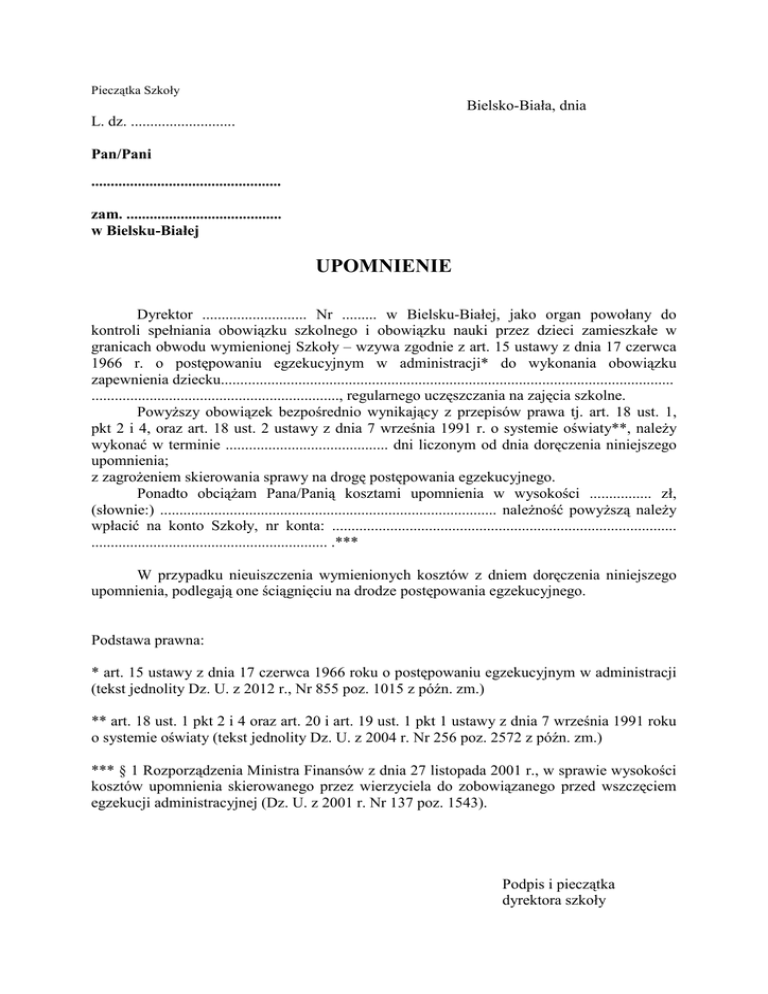 Pieczątka Szkoły Bielsko-Biała, dnia L. dz. ........................... Pan/Pani ................................................. zam. ........................................ w Bielsku-Białej UPOMNIENIE Dyrektor ........................... Nr ......... w Bielsku-Białej, jako organ powołany do kontroli spełniania obowiązku szkolnego i obowiązku nauki przez dzieci zamieszkałe w granicach obwodu wymienionej Szkoły – wzywa zgodnie z art. 15 ustawy z dnia 17 czerwca 1966 r. o postępowaniu egzekucyjnym w administracji* do wykonania obowiązku zapewnienia dziecku..................................................................................................................... ................................................................, regularnego uczęszczania na zajęcia szkolne. Powyższy obowiązek bezpośrednio wynikający z przepisów prawa tj. art. 18 ust. 1, pkt 2 i 4, oraz art. 18 ust. 2 ustawy z dnia 7 września 1991 r. o systemie oświaty**, należy wykonać w terminie .......................................... dni liczonym od dnia doręczenia niniejszego upomnienia; z zagrożeniem skierowania sprawy na drogę postępowania egzekucyjnego. Ponadto obciążam Pana/Panią kosztami upomnienia w wysokości ................ zł, (słownie:) ....................................................................................... należność powyższą należy wpłacić na konto Szkoły, nr konta: ......................................................................................... ............................................................. .*** W przypadku nieuiszczenia wymienionych kosztów z dniem doręczenia niniejszego upomnienia, podlegają one ściągnięciu na drodze postępowania egzekucyjnego. Podstawa prawna: * art. 15 ustawy z dnia 17 czerwca 1966 roku o postępowaniu egzekucyjnym w administracji (tekst jednolity Dz. U. z 2012 r., Nr 855 poz. 1015 z późn. zm.) ** art. 18 ust. 1 pkt 2 i 4 oraz art. 20 i art. 19 ust. 1 pkt 1 ustawy z dnia 7 września 1991 roku o systemie oświaty (tekst jednolity Dz. U. z 2004 r. Nr 256 poz. 2572 z późn. zm.) *** § 1 Rozporządzenia Ministra Finansów z dnia 27 listopada 2001 r., w sprawie wysokości kosztów upomnienia skierowanego przez wierzyciela do zobowiązanego przed wszczęciem egzekucji administracyjnej (Dz. U. z 2001 r. Nr 137 poz. 1543). Podpis i pieczątka dyrektora szkoły Uwagi: 1. wpisać imię i nazwisko dziecka (ucznia) data i miejsce urodzenia i adres zamieszkania. 2. upomnienie sporządza się i wysyła w 2 egzemplarzach, z których jeden przeznaczony jest dla zobowiązanego, a drugi (z potwierdzeniem odbioru) dla wierzyciela (polecony za zwrotnym potwierdzeniem odbioru). Egzemplarz ten po zwróceniu przez pocztę z potwierdzeniem odbioru stanowi dowód doręczenia upomnienia. 3. koszty upomnienia wynoszą czterokrotną wartość opłaty dodatkowej pobieranej przez państwowe przedsiębiorstwo użyteczności publicznej “Poczta Polska za polecenie przesyłki listowej.” Obowiązek uiszczenia kosztów upomnienia przez zobowiązanego powstaje z chwilą doręczenia upomnienia i przypada wierzycielowi.