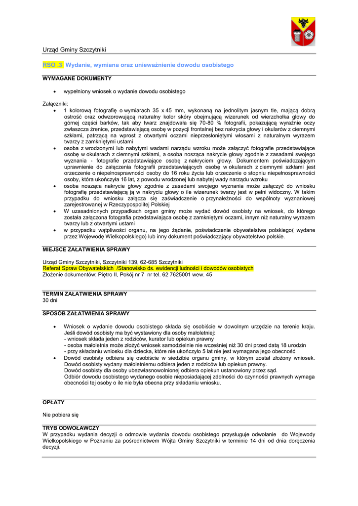 Urząd Gminy Szczytniki RSO .3 Wydanie, wymiana oraz unieważnienie dowodu osobistego WYMAGANE DOKUMENTY wypełniony wniosek o wydanie dowodu osobistego Załączniki: 1 kolorową fotografię o wymiarach 35 x 45 mm, wykonaną na jednolitym jasnym tle, mającą dobrą ostrość oraz odwzorowującą naturalny kolor skóry obejmującą wizerunek od wierzchołka głowy do górnej części barków, tak aby twarz znajdowała się 70-80 % fotografii, pokazującą wyraźnie oczy zwłaszcza źrenice, przedstawiającą osobę w pozycji frontalnej bez nakrycia głowy i okularów z ciemnymi szkłami, patrzącą na wprost z otwartymi oczami nieprzesłoniętymi włosami z naturalnym wyrazem twarzy z zamkniętymi ustami osoba z wrodzonymi lub nabytymi wadami narządu wzroku może załączyć fotografie przedstawiające osobę w okularach z ciemnymi szkłami, a osoba nosząca nakrycie głowy zgodnie z zasadami swojego wyznania - fotografie przedstawiające osobę z nakryciem głowy. Dokumentem poświadczającym uprawnienie do załączenia fotografii przedstawiających osobę w okularach z ciemnymi szkłami jest orzeczenie o niepełnosprawności osoby do 16 roku życia lub orzeczenie o stopniu niepełnosprawności osoby, która ukończyła 16 lat, z powodu wrodzonej lub nabytej wady narządu wzroku osoba nosząca nakrycie głowy zgodnie z zasadami swojego wyznania może załączyć do wniosku fotografię przedstawiającą ją w nakryciu głowy o ile wizerunek twarzy jest w pełni widoczny. W takim przypadku do wniosku załącza się zaświadczenie o przynależności do wspólnoty wyznaniowej zarejestrowanej w Rzeczypospolitej Polskiej W uzasadnionych przypadkach organ gminy może wydać dowód osobisty na wniosek, do którego została załączona fotografia przedstawiająca osobę z zamkniętymi oczami, innym niż naturalny wyrazem twarzy lub z otwartymi ustami w przypadku wątpliwości organu, na jego żądanie, poświadczenie obywatelstwa polskiego( wydane przez Wojewodę Wielkopolskiego) lub inny dokument poświadczający obywatelstwo polskie. MIEJSCE ZAŁATWIENIA SPRAWY Urząd Gminy Szczytniki, Szczytniki 139, 62-685 Szczytniki Referat Spraw Obywatelskich /Stanowisko ds. ewidencji ludności i dowodów osobistych Złożenie dokumentów: Piętro II, Pokój nr 7 nr tel. 62 7625001 wew. 45 TERMIN ZAŁATWIENIA SPRAWY 30 dni SPOSÓB ZAŁATWIENIA SPRAWY Wniosek o wydanie dowodu osobistego składa się osobiście w dowolnym urzędzie na terenie kraju. Jeśli dowód osobisty ma być wystawiony dla osoby małoletniej: - wniosek składa jeden z rodziców, kurator lub opiekun prawny - osoba małoletnia może złożyć wniosek samodzielnie nie wcześniej niż 30 dni przed datą 18 urodzin - przy składaniu wniosku dla dziecka, które nie ukończyło 5 lat nie jest wymagana jego obecność Dowód osobisty odbiera się osobiście w siedzibie organu gminy, w którym został złożony wniosek. Dowód osobisty wydany małoletniemu odbiera jeden z rodziców lub opiekun prawny. Dowód osobisty dla osoby ubezwłasnowolnionej odbiera opiekun ustanowiony przez sąd. Odbiór dowodu osobistego wydanego osobie nieposiadającej zdolności do czynności prawnych wymaga obecności tej osoby o ile nie była obecna przy składaniu wniosku. OPŁATY Nie pobiera się TRYB ODWOŁAWCZY W przypadku wydania decyzji o odmowie wydania dowodu osobistego przysługuje odwołanie do Wojewody Wielkopolskiego w Poznaniu za pośrednictwem Wójta Gminy Szczytniki w terminie 14 dni od dnia doręczenia decyzji. Urząd Gminy Szczytniki PODSTAWA PRAWNA Ustawa z dnia 6 sierpnia 2010 r. o dowodach osobistych (Dz. U. z 2010 r. Nr 167, poz. 1131 ze. zm.) Rozporządzenie Rady Ministrów z dnia 29 stycznia 2015 r. w sprawie wzoru dowodu osobistego oraz sposobu i trybu postępowania w sprawach wydawania dowodów osobistych, ich utraty, uszkodzenia, unieważnienia i zwrotu (Dz. U. z 2015r., poz.212) DODATKOWE INFORMACJE DATA OSTATNIEGO PRZEGLĄDU/ AKTUALIZACJI 2015-03-01