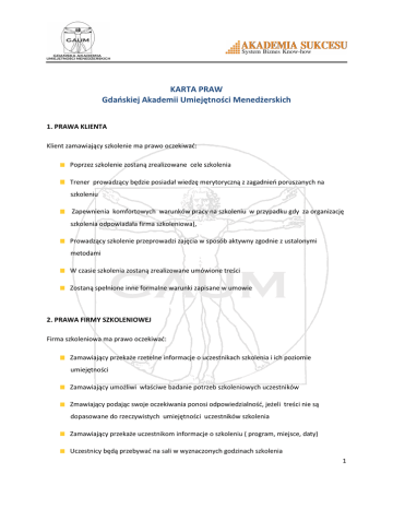 KARTA PRAW Gdańskiej Akademii Umiejętności Menedżerskich 1. PRAWA KLIENTA Klient zamawiający szkolenie ma prawo oczekiwać: Poprzez szkolenie zostaną zrealizowane cele szkolenia Trener prowadzący będzie posiadał wiedzę merytoryczną z zagadnień poruszanych na szkoleniu Zapewnienia komfortowych warunków pracy na szkoleniu w przypadku gdy za organizację szkolenia odpowiadała firma szkoleniowa), Prowadzący szkolenie przeprowadzi zajęcia w sposób aktywny zgodnie z ustalonymi metodami W czasie szkolenia zostaną zrealizowane umówione treści Zostaną spełnione inne formalne warunki zapisane w umowie 2. PRAWA FIRMY SZKOLENIOWEJ Firma szkoleniowa ma prawo oczekiwać: Zamawiający przekaże rzetelne informacje o uczestnikach szkolenia i ich poziomie umiejętności Zamawiający umożliwi właściwe badanie potrzeb szkoleniowych uczestników Zmawiający podając swoje oczekiwania ponosi odpowiedzialność, jeżeli treści nie są dopasowane do rzeczywistych umiejętności uczestników szkolenia Zamawiający przekaże uczestnikom informacje o szkoleniu ( program, miejsce, daty) Uczestnicy będą przebywać na sali w wyznaczonych godzinach szkolenia 1 Uczestnicy nie będą pod wpływem alkoholu lub środków odurzających Uczestnicy szkolenia w pełni zaangażują się w proces szkolenia i nie będą sabotować ustalonych z zamawiającym treści Uczestnicy chętnie wezmą udział w przygotowanych przez trenera działaniach i ćwiczeniach nie sabotując aktywnych metod nauczania, zwłaszcza scenek na forum Uczestnicy dostosują się do ustalonych w czasie szkolenia zasad W przypadku uczestniczenia w szkoleniu przełożonych uczestników szkolenia, zamawiający odpowiada za ewentualny opór grupy związany ze strachem przed oceną i wynikające z tego utrudnienia w realizacji umówionych treści W przypadku organizacji szkolenia przez zamawiającego zapewnione będą właściwe warunki lokalowe i umówione wyposażenie W sytuacji gdy przez zamawiającego zostały nie właściwie określone potrzeby szkoleniowe uczestników szkolenia, trener prowadzący wyjątkowo może zmienić zakres szkolenia, aby dostosować je do rzeczywistych potrzeb grupy w danym zakresie tematycznym. 2