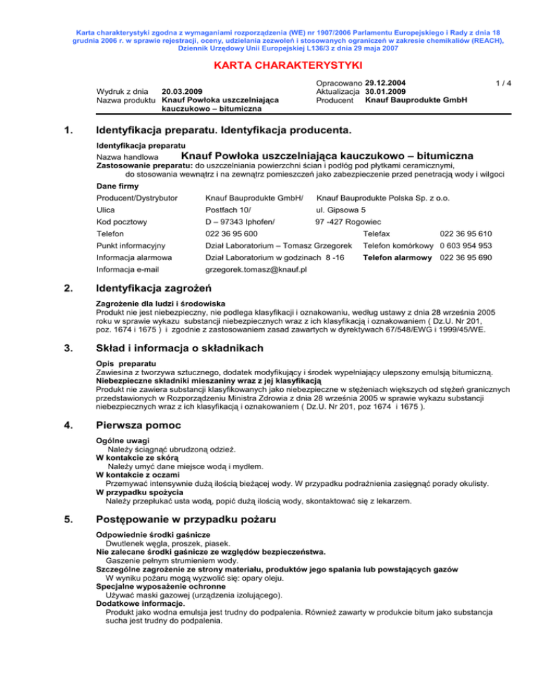 Karta charakterystyki zgodna z wymaganiami rozporządzenia (WE) nr 1907/2006 Parlamentu Europejskiego i Rady z dnia 18 grudnia 2006 r. w sprawie rejestracji, oceny, udzielania zezwoleń i stosowanych ograniczeń w zakresie chemikaliów (REACH), Dziennik Urzędowy Unii Europejskiej L136/3 z dnia 29 maja 2007 KARTA CHARAKTERYSTYKI 20.03.2009 Wydruk z dnia Nazwa produktu Knauf Powłoka uszczelniająca kauczukowo – bitumiczna 1. Opracowano 29.12.2004 Aktualizacja 30.01.2009 Producent Knauf Bauprodukte GmbH 1/4 Identyfikacja preparatu. Identyfikacja producenta. Identyfikacja preparatu Knauf Powłoka uszczelniająca kauczukowo – bitumiczna Nazwa handlowa Zastosowanie preparatu: do uszczelniania powierzchni ścian i podłóg pod płytkami ceramicznymi, do stosowania wewnątrz i na zewnątrz pomieszczeń jako zabezpieczenie przed penetracją wody i wilgoci Dane firmy Producent/Dystrybutor 2. Knauf Bauprodukte GmbH/ Knauf Bauprodukte Polska Sp. z o.o. Ulica Postfach 10/ ul. Gipsowa 5 Kod pocztowy D – 97343 Iphofen/ 97 -427 Rogowiec Telefon 022 36 95 600 Telefax 022 36 95 610 Punkt informacyjny Dział Laboratorium – Tomasz Grzegorek Telefon komórkowy 0 603 954 953 Informacja alarmowa Dział Laboratorium w godzinach 8 -16 Telefon alarmowy 022 36 95 690 Informacja e-mail [email protected] Identyfikacja zagroŜeń ZagroŜenie dla ludzi i środowiska Produkt nie jest niebezpieczny, nie podlega klasyfikacji i oznakowaniu, według ustawy z dnia 28 września 2005 roku w sprawie wykazu substancji niebezpiecznych wraz z ich klasyfikacją i oznakowaniem ( Dz.U. Nr 201, poz. 1674 i 1675 ) i zgodnie z zastosowaniem zasad zawartych w dyrektywach 67/548/EWG i 1999/45/WE. 3. Skład i informacja o składnikach Opis preparatu Zawiesina z tworzywa sztucznego, dodatek modyfikujący i środek wypełniający ulepszony emulsją bitumiczną. Niebezpieczne składniki mieszaniny wraz z jej klasyfikacją Produkt nie zawiera substancji klasyfikowanych jako niebezpieczne w stęŜeniach większych od stęŜeń granicznych przedstawionych w Rozporządzeniu Ministra Zdrowia z dnia 28 września 2005 w sprawie wykazu substancji niebezpiecznych wraz z ich klasyfikacją i oznakowaniem ( Dz.U. Nr 201, poz 1674 i 1675 ). 4. Pierwsza pomoc Ogólne uwagi NaleŜy ściągnąć ubrudzoną odzieŜ. W kontakcie ze skórą NaleŜy umyć dane miejsce wodą i mydłem. W kontakcie z oczami Przemywać intensywnie duŜą ilością bieŜącej wody. W przypadku podraŜnienia zasięgnąć porady okulisty. W przypadku spoŜycia NaleŜy przepłukać usta wodą, popić duŜą ilością wody, skontaktować się z lekarzem. 5. Postępowanie w przypadku poŜaru Odpowiednie środki gaśnicze Dwutlenek węgla, proszek, piasek. Nie zalecane środki gaśnicze ze względów bezpieczeństwa. Gaszenie pełnym strumieniem wody. Szczególne zagroŜenie ze strony materiału, produktów jego spalania lub powstających gazów W wyniku poŜaru mogą wyzwolić się: opary oleju. Specjalne wyposaŜenie ochronne UŜywać maski gazowej (urządzenia izolującego). Dodatkowe informacje. Produkt jako wodna emulsja jest trudny do podpalenia. RównieŜ zawarty w produkcie bitum jako substancja sucha jest trudny do podpalenia. Karta charakterystyki zgodna z wymaganiami rozporządzenia (WE) nr 1907/2006 Parlamentu Europejskiego i Rady z dnia 18 grudnia 2006 r. w sprawie rejestracji, oceny, udzielania zezwoleń i stosowanych ograniczeń w zakresie chemikaliów (REACH), Dziennik Urzędowy Unii Europejskiej L136/3 z dnia 29 maja 2007 KARTA CHARAKTERYSTYKI 20.03.2009 Wydruk z dnia Nazwa produktu Knauf Powłoka uszczelniająca kauczukowo – bitumiczna 6. Opracowano 29.12.2004 Aktualizacja 30.01.2009 Producent Knauf Bauprodukte GmbH 2/4 Postępowanie w przypadku niezamierzonego uwolnienia do środowiska Indywidualne środki ostroŜności NaleŜy uŜywać osobistej odzieŜy ochronnej (patrz punkt 8). Niezbędne środki w zakresie ochrony środowiska Produkt nie moŜe dostać się do zbiorników wodnych lub kanalizacji. Metody oczyszczania i wchłaniania NaleŜy usuwać w świeŜym stanie: usuwać zmywając wodą lub materiałem chłonnym ( np. piasek, mączka drzewna, uniwersalny środek łączący). Następnie usunąć zgodnie z przepisami. 7. Przechowywanie i składowanie preparatu Środki ostroŜności podczas obchodzenia się z substancją Postępować zgodnie z przepisami z zakresu bezpieczeństwa pracy. Podczas pracy z materiałem nie naleŜy jeść, pić i palić papierosów. Unikać kontaktu ze skórą i oczami. Wymagania w zakresie przechowywania i opakowań Przechowywać tylko w oryginalnych, szczelnych opakowaniach, w pomieszczeniach dobrze wentylowanych. Zalecana temperatura przechowywania pomiędzy 5 °C a 30 °C. Wskazówki dotyczące ochrony przeciwpoŜarowej i eksplozyjnej. Nie trzeba podejmować szczególnych środków bezpieczeństwa. 8. Kontrola naraŜenia i środki ochrony indywidualnej Parametry kontroli niebezpiecznych składników w miejscu pracy NDS, NDSCh. Brak niebezpiecznych składników. Podstawa prawna Normatywy higieniczne dla środowiska pracy wg. Rozporządzenia MPiPS z dn.29.11.2002 w sprawie najwyŜszych dopuszczalnych stęŜeń i natęŜeń czynników szkodliwych dla zdrowia w środowisku pracy ( Dz.U. Nr 217 poz.1833 ) z późniejszymi zmianami (Dz.U. Nr 212, poz 1769 z 2005 ) WyposaŜenie osobiste Przestrzegać zasad bezpieczeństwa i higieny pracy. Przed przerwą i po zakończeniu pracy umyć ręce. Ochrona dróg oddechowych W normalnych warunkach pracy nie jest wymagana. Ochrona rąk i ciała Nosić rękawice ochronne. Nosić ochronne ubranie robocze. Ochrona oczu UŜywać szczelnych okularów ochronnych. 9. Właściwości fizykochemiczne stan skupienia: barwa: zapach: temperatura wrzenia: gęstość przy 20°C: zdolność do mieszanie się z wodą: pH - wartość 10. ciecz czarny słaby 100 °C 3 1,2 kg/ dm nierozpuszczalny 9 - 11 Stabilność i reaktywność Warunki, których naleŜy unikać Bezwzględnie unikać ujemnych temperatur po