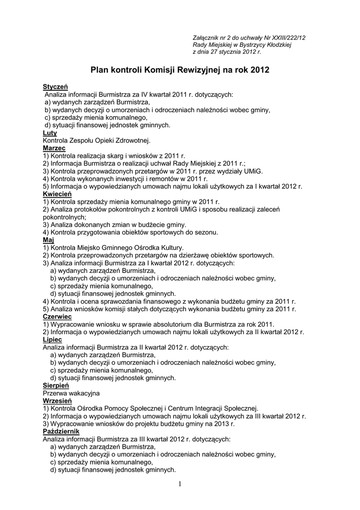 Załącznik nr 2 do uchwały Nr XXIII/222/12 Rady Miejskiej w Bystrzycy Kłodzkiej z dnia 27 stycznia 2012 r. Plan kontroli Komisji Rewizyjnej na rok 2012 Styczeń Analiza informacji Burmistrza za IV kwartał 2011 r. dotyczących: a) wydanych zarządzeń Burmistrza, b) wydanych decyzji o umorzeniach i odroczeniach należności wobec gminy, c) sprzedaży mienia komunalnego, d) sytuacji finansowej jednostek gminnych. Luty Kontrola Zespołu Opieki Zdrowotnej. Marzec 1) Kontrola realizacja skarg i wniosków z 2011 r. 2) Informacja Burmistrza o realizacji uchwał Rady Miejskiej z 2011 r.; 3) Kontrola przeprowadzonych przetargów w 2011 r. przez wydziały UMiG. 4) Kontrola wykonanych inwestycji i remontów w 2011 r. 5) Informacja o wypowiedzianych umowach najmu lokali użytkowych za I kwartał 2012 r. Kwiecień 1) Kontrola sprzedaży mienia komunalnego gminy w 2011 r. 2) Analiza protokołów pokontrolnych z kontroli UMiG i sposobu realizacji zaleceń pokontrolnych; 3) Analiza dokonanych zmian w budżecie gminy. 4) Kontrola przygotowania obiektów sportowych do sezonu. Maj 1) Kontrola Miejsko Gminnego Ośrodka Kultury. 2) Kontrola przeprowadzonych przetargów na dzierżawę obiektów sportowych. 3) Analiza informacji Burmistrza za I kwartał 2012 r. dotyczących: a) wydanych zarządzeń Burmistrza, b) wydanych decyzji o umorzeniach i odroczeniach należności wobec gminy, c) sprzedaży mienia komunalnego, d) sytuacji finansowej jednostek gminnych. 4) Kontrola i ocena sprawozdania finansowego z wykonania budżetu gminy za 2011 r. 5) Analiza wniosków komisji stałych dotyczących wykonania budżetu gminy za 2011 r. Czerwiec 1) Wypracowanie wniosku w sprawie absolutorium dla Burmistrza za rok 2011. 2) Informacja o wypowiedzianych umowach najmu lokali użytkowych za II kwartał 2012 r. Lipiec Analiza informacji Burmistrza za II kwartał 2012 r. dotyczących: a) wydanych zarządzeń Burmistrza, b) wydanych decyzji o umorzeniach i odroczeniach należności wobec gminy, c) sprzedaży mienia komunalnego, d) sytuacji finansowej jednostek gminnych. Sierpień Przerwa wakacyjna Wrzesień 1) Kontrola Ośrodka Pomocy Społecznej i Centrum Integracji Społecznej. 2) Informacja o wypowiedzianych umowach najmu lokali użytkowych za III kwartał 2012 r. 3) Wypracowanie wniosków do projektu budżetu gminy na 2013 r. Październik Analiza informacji Burmistrza za III kwartał 2012 r. dotyczących: a) wydanych zarządzeń Burmistrza, b) wydanych decyzji o umorzeniach i odroczeniach należności wobec gminy, c) sprzedaży mienia komunalnego, d) sytuacji finansowej jednostek gminnych. 1 Listopad Kontrola klubów sportowych w zakresie wykorzystania dotacji z budżetu gminy. Grudzień 1) Analiza projektu budżetu na 2013 r. 2) Informacja o wypowiedzianych umowach najmu lokali użytkowych za IV kwartał 2012 r. 3) Przygotowanie sprawozdania komisji za rok 2012 i planu kontroli na rok 2013. 2