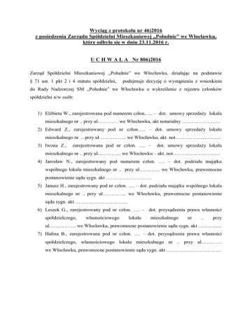 Wyciąg z protokołu nr 46)2016 z posiedzenia Zarządu Spółdzielni Mieszkaniowej „Południe” we Włocławku, które odbyło się w dniu 23.11.2016 r. U C H W A Ł A Nr 806)2016 Zarząd Spółdzielni Mieszkaniowej „Południe” we Włocławku, działając na podstawie § 71 ust. 1 pkt 2 i 4 statutu spółdzielni, podejmuje decyzję o wystąpieniu z wnioskiem do Rady Nadzorczej SM „Południe” we Włocławku o wykreślenie z rejestru członków spółdzielni n/w osób: 1) Elżbieta W., zarejestrowana pod numerem człon….. – dot. umowy sprzedaży lokalu mieszkalnego nr .. przy ul………… we Włocławku, akt notarialny ………………….. 2) Edward Z., zarejestrowany pod nr człon….. – dot. umowy sprzedaży lokalu mieszkalnego nr .. przy ul……………. we Włocławku, akt. not……………………… 3) Iwona Z., zarejestrowana pod nr człon. …. – dot. umowy sprzedaży lokalu mieszkalnego nr .. przy ul………….. we Włocławku – akt. not………………………. 4) Jarosław N., zarejestrowany pod numerem człon. …. – dot. podziału majątku wspólnego lokalu mieszkalnego nr .. przy ul………… we Włocławku, prawomocne postanowienie sądu sygn. akt ……………………… 5) Janusz H., zarejestrowany pod nr człon. …. – dot. podziału majątku wspólnego lokalu mieszkalnego nr .. przy ul………….. we Włocławku, prawomocne postanowienie sądu sygn. akt …………………………. 6) Leszek G., zarejestrowany pod nr człon. …. – dot. przysądzenia prawa własności spółdzielczego, własnościowego lokalu mieszkalnego nr .. przy ul……………. we Włocławku, prawomocne postanowienie sądu sygn. akt ………….. 7) Halina B., zarejestrowana pod nr człon. …. – dot. przysądzenia prawa własności spółdzielczego, własnościowego lokalu mieszkalnego nr .. przy ul………… we Włocławku, prawomocne postanowienie sądu sygn. akt …………………………...
