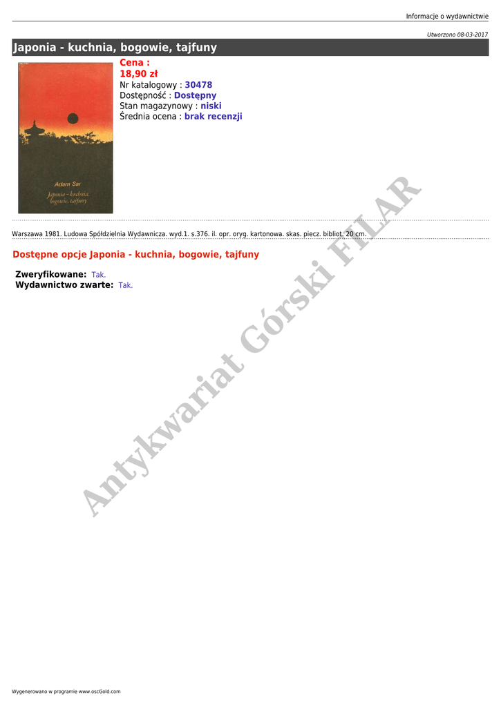 Informacje o wydawnictwie Utworzono 08-03-2017 Japonia - kuchnia, bogowie, tajfuny Cena : 18,90 zł LA R Nr katalogowy : 30478 Dostępność : Dostępny Stan magazynowy : niski Średnia ocena : brak recenzji FI Warszawa 1981. Ludowa Spółdzielnia Wydawnicza. wyd.1. s.376. il. opr. oryg. kartonowa. skas. piecz. bibliot. 20 cm. Dostępne opcje Japonia - kuchnia, bogowie, tajfuny An ty k w ar ia t G ór sk i Zweryfikowane: Tak. Wydawnictwo zwarte: Tak. Wygenerowano w programie www.oscGold.com
