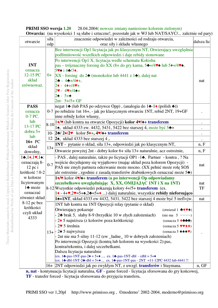 These Materials cannot be used, Copied or Redistributed Without Permission Which is Granted After Free Registration. Redistributed for Profit of any Data is Prohibited and Cannot be used Without the Consent of the Author PRIMI SSO wersja 1.20 28.04.2004( nowsze zmiany naniesiono kolorem zielonym) Otwarcia: (na wysokości 1 są słabe i sztuczne!, pozostałe jak w WJ lub NAT/SAYC/... zależnie od pary) siła znaczenie odpowiedzi w zależności od rodzaju otwarcia, otwarcie dalsza lic odp oraz siły i składu własnego Bez interwencji Op1 licytacja jak po klasycznym NT, Otwierający uwzględnia ew podlimitowość wszelkich odpowiedzi i daje rebidy stonowane Po interwencji Op1 X, licytacja wedle schematu Kokisha 1NT pas – trójznaczny forsing do XX (8+ do gry karna, 5♣+/4♥♠ lub 5♦+/4♥♠, oznacza 5♥♠ i 4♣/3♦, 12-15 PC 0+ XX - forsing do 2♣ (monokolor lub 4441 z 1♣), dalej nat skład 2♣ - 4♣+/4♦+, nat zrównoważ. 2♦ - 4♦+/4♥+ 2♥ - 4♥+/4♠+ 2♠ - 5+♠ 2nt- 5+/5+ GF negat 1♣ (lub PAS po odzywce Opp) , (analogia do 1♣-1♦ (polish ♣)) PASS oznacza 0-7 po rebidzie 1nt 16+, - jak po klasycznym otwarciu 1NT, rebid 2NT, 19+GF . 0-7 PC. inne rebidy kolor własny, lub 1♦/♥ (lub kontra na otwarcie Opozycji) kolor 4♥/♠+ transferem . 13-17 PC 8-10 1♠, układ 4333 ew. 4432, 5431, 5422 bez starszej 4, może być 5♣+ . dobra 5+ . 10- 2♣/ 2♦/2♥ kolor 5♦+, 4♥/♠+ transferem lub 12 2♠, układ 4333 bez starszej 4 , . 16+ PC 1NT - pytanie o skład, siła 13+, odpowiedzi jak po klasycznym NT, n, F skład 13+ Otwarcie powyżej 2nt - dobry kolor 6+ siła 13+ naturalnie, acz ostrożnie, n, F dowolny, 1♣,1♦,1♥,1♠: - PAS , dalej naturalnie, także po licytacji OP1 -1♣, Partner - kontra , ? Na oznaczają 8wejście decydujemy się wyjątkowo (mając układ poza kolorem Opozycji) 0-7 nat 12 pc i PAS nie zmyli partnera odezwanie może mocno. (XX pełnić może rolę SOS krótkość ! 0-2 ale ostrożnie , zgodnie z zasadą transferów drabinkowych oznaczać może 5♣) w kolorze 1♦/♥ kolor 4♥/♠+ transferem (a po interwencji Op odpowiadamy licytowanym nat szczebelkowo uwzględniając X, XX, OMIJAJĄC 1NT i X na 1NT) 1♣ może 8-12 Wszystkie odpowiedzi pokazują kolory 4+/5+ transferem (ex. TF oznaczać 1♦ - 4+♥,2♥=5+♠,2♣=5+♦ ...) dalej naturalnie, wszystkie rebidy nieforsująco również skład 1♠=1NT, układ 4333 ew 4432, 5431, 5422 bez starszej 4 może być 5 trefl+jw. nat 8-12 pc bez 1NT lub kontra na 1NT Opozycji relay (pytanie o skład) krótkości Otwierający pokazuje (otwierał 1 ♣♦♥♠) czyli układ - 2♣ brak 5, słaby 8-9 (brzydkie 10 w złych założeniach) (nie ma 5 ----) 4333 - 2♦ 5 najniższa (z kolorów poza krótkością) (oznacza 5 ♦♣♣♣) - 2♥ 5 średnia (oznacza 5 ♥♥♦♦) (oznacza 5 ♠♠♠♥) 13+ - 2♠ 5 najwyższa . - 2nt nie ma 5 silny 11-12 (ew _ładne_ 10 w dobrych założeniach) Po interwencji Opozycji (kontrą lub kolorem na wysokości 2):pas, kontra/rekontra, i dalej szczebelkami. Dalsza licytacja naturalnie (ex. 1♣-pas-1NT-pas-2♦ = 5+♦ ..., ex. 1♣-pas-1NT-dbl - rdbl = 5+♦ (ex. 1♣-dbl-1NT-2♣-dbl = 5+♦ ... ex. 1♣-pas-1NT-pas - 2NT =11-12PC 4432 lub-4441 !! 16+ 2NT odpowiedzi jak po zwykłym NT, z uwzgl. transferów i Staymana. n, GF n, nat - kontynuacja licytacji naturalna, GF - game forced - licytacja sforsowana do gry końcowej, TF - transfer forced - licytacja sforsowana do przyjęcia transferu, PRIMI SSO ver 1,20pl http://www.primisso.org , ©moderno’ 2002-2004, [email protected]