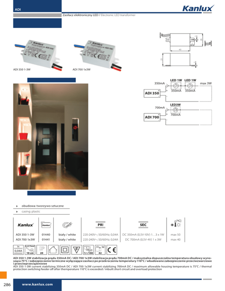 ADI 28 3 Zasilacz elektroniczny LED / Electronic LED transformer 5 3 23 40 ADI 700 1x3W + + - - ADI 350 350mA 350mA max 3W LED3W 700mA + + - - ADI 700 LED 1W LED 1W 350mA ADI 350 1-3W 700mA obudowa: tworzywo sztuczne casing: plastic ADI 350 1-3W 01440 biały / white 220-240V~; 50/60Hz; 0,04A DC 350mA (0,5V-10V) 1…3 x 1W max 50 ADI 700 1x3W 01441 biały / white 220-240V~; 50/60Hz; 0,04A DC 700mA (0,5V-4V) 1 x 3W max 40 4 x 0,75mm2 0,04A 10 cm 20 1/-/100 42 ADI 350 1-3W stabilizacja prądu 350mA DC / ADI 700 1x3W stabilizacja prądu 700mA DC / maksymalna dopuszczalna temperatura obudowy wynosząca 75°C / zabezpieczenie termiczne wyłączające zasilacz po przekroczeniu temperatury 110°C / wbudowane zabezpieczenie przeciwzwarciowe i przeciwprzeciążeniowe ADI 350 1-3W current stabilizing 350mA DC / ADI 700 1x3W current stabilizing 700mA DC / maximum allowable housing temperature is 75°C / thermal protection switching feeder off after themperature 110°C is exceeded / inbuilt short circuit and overload protection 286 www.kanlux.com