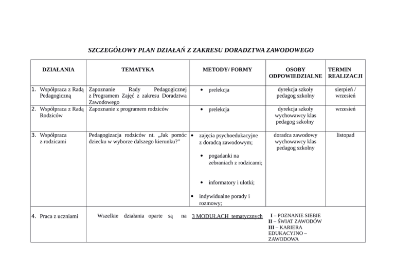 SZCZEGÓŁOWY PLAN DZIAŁAŃ Z ZAKRESU DORADZTWA ZAWODOWEGO DZIAŁANIA TEMATYKA METODY/ FORMY 1. Współpraca z Radą Zapoznanie Rady Pedagogicznej Pedagogiczną z Programem Zajęć z zakresu Doradztwa Zawodowego 2. Współpraca z Radą Zapoznanie z programem rodziców Rodziców 3. Współpraca z rodzicami Pedagogizacja rodziców nt. „Jak pomóc dziecku w wyborze dalszego kierunku?” 4. Praca z uczniami Wszelkie działania oparte są OSOBY ODPOWIEDZIALNE TERMIN REALIZACJI prelekcja dyrekcja szkoły pedagog szkolny sierpień / wrzesień prelekcja dyrekcja szkoły wychowawcy klas pedagog szkolny wrzesień doradca zawodowy wychowawcy klas pedagog szkolny listopad zajęcia psychoedukacyjne z doradcą zawodowym; pogadanki na zebraniach z rodzicami; informatory i ulotki; indywidualne porady i rozmowy; na 3 MODUŁACH tematycznych I – POZNANIE SIEBIE II – ŚWIAT ZAWODÓW III – KARIERA EDUKACYJNO – ZAWODOWA DZIAŁANIA TEMATYKA / TREŚCI MODUŁ I. 1. Dostarczenie uczniom wiedzy o sobie METODY/ FORMY OSOBY ODPOWIEDZIALNE POZNANIE SIEBIE 1. Poznanie siebie warunkiem własnego rozwoju. TERMIN REALIZACJI Uświadomienie swoich mocnych i słabych stron. Uświadomienie własnych zdolności i talentów. Praca nad poziomem samooceny. Doskonalenie umiejętności autoprezentacji. cały rok szk./ wg potrzeb pogadanki na godzinach wychowawczych; warsztaty psychoedukacyjne; autodiagnoza preferencji – kwestionariusze, ankiety wychowawcy klas wychowawcy klas pedagog szkolny psycholog pedagog szkolny psycholog 2. Gospodarowanie czasem wolnym. Umiejętność organizacji wolnego czasu. Korzyści płynące z umiejętności gospodarowania czasem wolnym. 3. Motywacja – co to jest i po co ? zajęcia psychoedukacyjne; pogadanki; cały rok szk./ wg potrzeb Motywacja zewnętrzna i wewnętrzna. Czynniki motywujące i demotywujące. Znaczenie motywacji w życiu człowieka. filmy edukacyjne; zajęcia psychoedukacyjne; pogadanki; wychowawcy klas filmy edukacyjne; zajęcia psychoedukacyjne; pogadanki; doradca zawodowy cały rok szk./ wg potrzeb pedagog szkolny 4. Stres – wróg, czy przyjaciel ? Stres pozytywny i negatywny. Osobowość, a radzenie sobie ze stresem. Kształtowanie odporności emocjonalnej. Poznanie metod relaksacji. cały rok szk. wychowawcy klas pedagog szkolny 5. Komunikacja interpersonalna. Umiejętność współpracy w grupie. Komunikacja werbalna i pozawerbalna. Warunki skutecznej komunikacji. Bariery komunikacyjne. filmy edukacyjne; zajęcia psychoedukacyjne; pogadanki; pogadanki; kwestinariusz „Profil psycholog cały rok szk. wychowawcy klas pedagog szkolny 6. Jak skutecznie się uczyć? Wieloraka inteligencja, a sposoby uczenia się. wychowawcy klas pedagog szkolny cały rok szk. Nowoczesne sposoby i techniki uczenia się. Cechy pamięci. MODUŁ II. 1. Dostarczenie uczniom wiedzy o zawodach wielorakiej inteligencji” zajęcia psychoedukacyjne nt. „Nowoczesne metody i techniki uczenia się”; psycholog ŚWIAT ZAWODÓW 1. Informacja zawodowa, czyli co warto wiedzieć o zawodach ? spotkania z przedstawicielami Klasyfikacja zawodów. różnych zawodów (policjant, ratownik medyczny, Poznanie charakterystycznych cech pielęgniarka, strażak, różnych zawodów: urzędnik, psycholog itp.); - informacje ogólne o zawodzie, - warunki i środowisko pracy, cykl zajęć warsztatowych - zadania i czynności, - wymagania psychofizyczne, z doradcą zawodowym - przeciwwskazania zdrowotne, - zarobki, - szanse zatrudnienia. Ścieżki kształcenia w kierunku poszczególnych zawodów. 2. Kalejdoskop zawodów- zawody przyszłości. Multimedialne Centrum Informacji Zawodowej; wychowawcy klas cały rok szk./ wg potrzeb pedagog szkolny doradca zawodowy wychowawcy klas cały rok szk./ wg potrzeb Poznanie różnych grup zawodów w obszarach m. in. zarządzanie, marketing, handel, finanse, biuro. Poznanie zawodów przyszłości. filmy edukacyjne (m.in. cykl „Drogi zawodowe”) cykl zajęć warsztatowe z doradcą zawodowym pedagog szkolny doradca zawodowy 3. Zainteresowania – inspiracja do działania i sposób na relaks. Jaką rolę odgrywają zainteresowania w życiu człowieka? Znaczenie zainteresowań na różnych etapach rozwoju zawodowego. Zainteresowania jako źródło informacji o człowieku. Motywy wyboru zainteresowań wskazówką dla decyzji zawodowych. cykl zajęć z doradcą zawodowym; pogadanki na godzinach wychowawczych; warsztaty psychoedukacyjne z psychologiem; korzystanie z Multimedialnego Centrum Informacji Zawodowej; filmy edukacyjne. doradca zawodowy wychowawcy klas pedagog szkolny psycholog (PPP) cały rok szk./ wg potrzeb 4. Cechy osobowościowe, a wybór zawodu. Predyspozycje zawodowe. Znaczenie cech osobowości w wyborze szkoły i zawodu. Cechy człowieka przedsiębiorczego. Metody pracy nad poprawą wybranych cech charakteru. cykl zajęć z doradcą zawodowym; doradca zawodowy pogadanki; wychowawcy klas cały rok szk. pedagog szkolny kwestionariusze i ankiety; filmy edukacyjne (m.in. cykl „Drogi zawodowe”, „Zawód przyszłości - gdzie szukać, jak zdobyć?”); zajęcia psychoedukacyjne nt. „Jak budować pozytywne relacje rówieśnicze?”; 5. Współpraca w grupie. Budowanie pozytywnych relacji rówieśniczych. Przestrzeganie obowiązujących norm i zasad. Podejmowanie decyzji na drodze ogólnego porozumienia. rozmowy i porady indywidualne; programy multimedialne; pogadanki; psycholog wychowawcy klas pedagog szkolny II semestr wg terminarza zajęć MODUŁ III. KARIERA 1.Dostarczenie 1. Szkolnictwo ponadgimnazjalne – wiedzy o szkolnictwie ścieżki kształcenia. ponadgimnazjalnym Typy szkół ponadgimnazjalnych: oraz rynku pracy - Liceum ogólnokształcące, - liceum profilowane, - technikum, - zasadnicza szkoła zawodowa. Oferty szkół ponadgimnazjalnych. Zasady rekrutacji w poszczególnych szkołach. Redagowanie dokumentów składanych do szkół : - CV, - LIST MOTYWACYJNY, - PODANIE. EDUKACYJNO – zapoznanie z ofertą edukacyjną szkół (ulotki, informatory, gazet