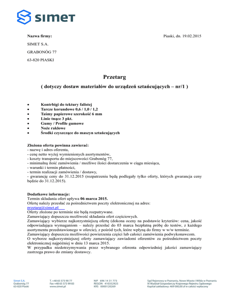 Piaski, dn. 19.02.2015 Nazwa firmy: SIMET S.A. GRABONÓG 77 63820 PIASKI Przetarg ( dotyczy dostaw materiałów do urządzeń sztańcujących – nr/1 ) Kontrbigi do tektury falistej Tarcze korundowe 0,6 / 1,0 / 1,2 Taśmy papierowe szerokość 6 mm Linie tnące 3 pkt. Gumy / Profile gumowe Noże raklowe Środki czyszczące do maszyn sztańcujących Złożona oferta powinna zawierać: nazwę i adres oferenta, cenę netto wyżej wymienionych asortymentów, koszty transportu do miejscowości Grabonóg 77, minimalną ilość zamówienia / możliwe ilości dostarczenia w ciągu miesiąca, warunki i termin płatności, termin realizacji zamówienia / dostawy, gwarancję ceny do 31.12.2015 (rozpatrzeniu będą podlegały tylko oferty, których gwarancja ceny będzie do 31.12.2015). Dodatkowe informacje: Termin składania ofert upływa 06 marca 2015. Ofertę należy przesłać za pośrednictwem poczty elektronicznej na adres: [email protected] Oferty złożone po terminie nie będą rozpatrywane. Zamawiający dopuszcza możliwość składania ofert częściowych. Zamawiający wybierze najkorzystniejszą ofertę (dokona oceny na podstawie kryteriów: cena, jakość odpowiadająca wymaganiom – należy przesłać do 03 marca bezpłatną próbę do testów, z każdego asortymentu przedstawionego w ofercie), z pośród tych, które wpłyną do firmy w w/w terminie. Zamawiający dopuszcza możliwości powierzenia części lub całości zamówienia podwykonawcom. O wyborze najkorzystniejszej oferty zamawiający zawiadomi oferentów za pośrednictwem poczty elektronicznej najpóźniej w dniu 13 marca 2015. W przypadku niedotrzymywania przez wybranego oferenta odpowiedniej jakości zamawiający zastrzega prawo do zmiany dostawcy.