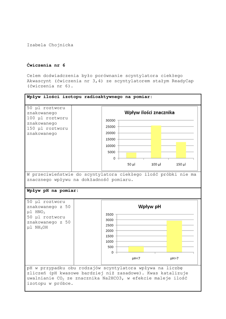 Izabela Chojnicka Ćwiczenia nr 6 Celem doświadczenia było porównanie scyntylatora ciekłego Akwascynt (ćwiczenia nr 3,4) ze scyntylatorem stałym ReadyCap (ćwiczenia nr 6). Wpływ ilości izotopu radioaktywnego na pomiar: 50 µl roztworu znakowanego 100 µl roztworu znakowanego 150 µl roztworu znakowanego W przeciwieństwie do scyntylatora ciekłego ilość próbki nie ma znacznego wpływu na dokładność pomiaru. Wpływ pH na pomiar: 50 µl roztworu znakowanego z 50 µl HNO3 50 µl roztworu znakowanego z 50 µl NH4OH pH w przypadku obu rodzajów scyntylatora wpływa na liczbę zliczeń (pH kwasowe bardziej niż zasadowe). Kwas katalizuje uwalnianie CO2 ze znacznika Na2HCO3, w efekcie maleje ilość izotopu w próbce. Wpływ wody na pomiar: 50 µl roztworu znakowanego z 50 µl wody destylowanej Woda odparowuje z próbki i nie ma wpływu na pomiar. Wpływ zabarwienia roztworu na pomiar: 50 µl roztworu znakowanego z 50 µl barwnika czerwonego 50 µl roztworu znakowanego z 50 µl barwnika zielonego 50 µl roztworu znakowanego z 50 µl barwnika niebieskiego W przypadku obu scyntylatorów barwa wpływa na pomiar, jednak w przypadku scyntylatora stałego, przeciwnie do scyntylatora ciekłego, kolor niebieski najbardziej zmniejsza liczbę zliczeń im ciemniejsza barwa próbki, tym większy wpływ na pomiar. próbka 1 2 3 4 5 6 7 8 9 Aktywność ReadyCap 4500.25 25844.88 12857.61 561.22 2915.71 86087.83 30925.53 50617.08 11021.20