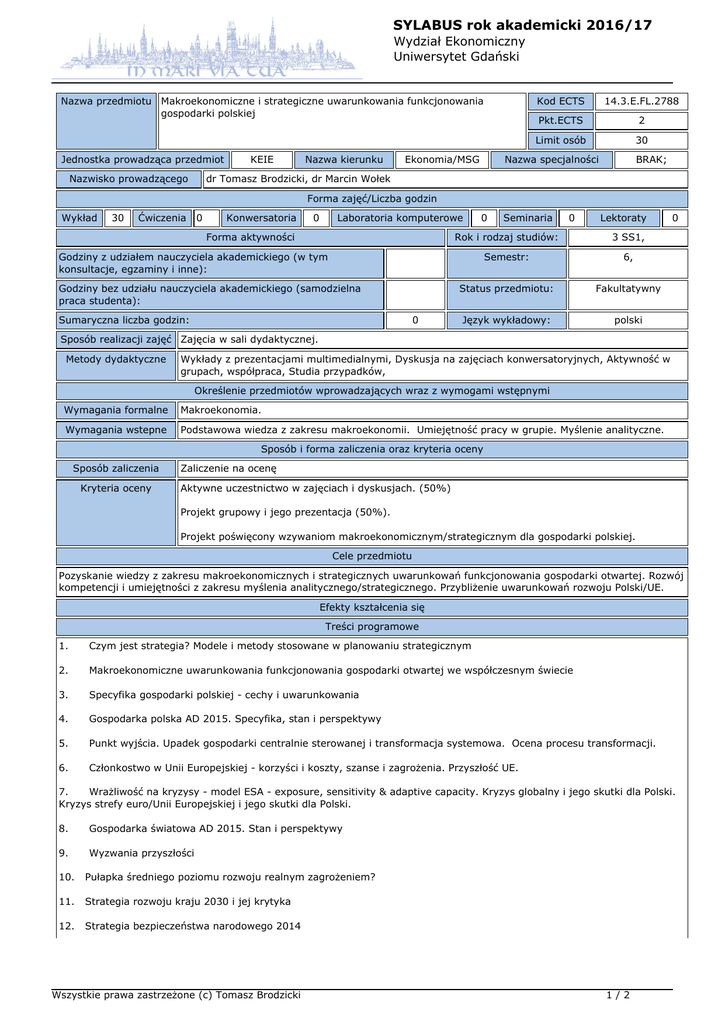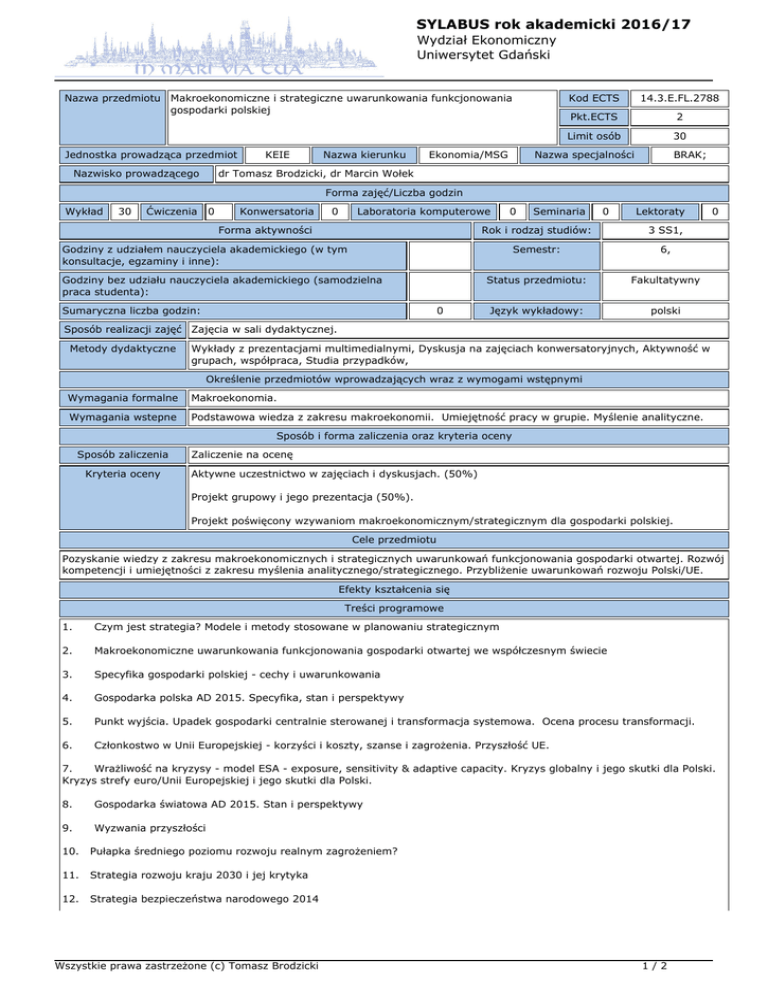 SYLABUS rok akademicki 2016/17 Wydział Ekonomiczny Uniwersytet Gdański Nazwa przedmiotu Makroekonomiczne i strategiczne uwarunkowania funkcjonowania gospodarki polskiej Jednostka prowadząca przedmiot Nazwisko prowadzącego KEIE Nazwa kierunku Ekonomia/MSG Kod ECTS 14.3.E.FL.2788 Pkt.ECTS 2 Limit osób 30 Nazwa specjalności BRAK; dr Tomasz Brodzicki, dr Marcin Wołek Forma zajęć/Liczba godzin Wykład 30 Ćwiczenia 0 Konwersatoria 0 Laboratoria komputerowe Forma aktywności 0 Sumaryczna liczba godzin: 0 0 Lektoraty Rok i rodzaj studiów: 3 SS1, Semestr: 6, Status przedmiotu: Fakultatywny Język wykładowy: polski Godziny z udziałem nauczyciela akademickiego (w tym konsultacje, egzaminy i inne): Godziny bez udziału nauczyciela akademickiego (samodzielna praca studenta): Seminaria 0 Sposób realizacji zajęć Zajęcia w sali dydaktycznej. Metody dydaktyczne Wykłady z prezentacjami multimedialnymi, Dyskusja na zajęciach konwersatoryjnych, Aktywność w grupach, współpraca, Studia przypadków, Określenie przedmiotów wprowadzających wraz z wymogami wstępnymi Wymagania formalne Makroekonomia. Wymagania wstepne Podstawowa wiedza z zakresu makroekonomii. Umiejętność pracy w grupie. Myślenie analityczne. Sposób i forma zaliczenia oraz kryteria oceny Sposób zaliczenia Kryteria oceny Zaliczenie na ocenę Aktywne uczestnictwo w zajęciach i dyskusjach. (50%) Projekt grupowy i jego prezentacja (50%). Projekt poświęcony wzywaniom makroekonomicznym/strategicznym dla gospodarki polskiej. Cele przedmiotu Pozyskanie wiedzy z zakresu makroekonomicznych i strategicznych uwarunkowań funkcjonowania gospodarki otwartej. Rozwój kompetencji i umiejętności z zakresu myślenia analitycznego/strategicznego. Przybliżenie uwarunkowań rozwoju Polski/UE. Efekty kształcenia się Treści programowe 1. Czym jest strategia? Modele i metody stosowane w planowaniu strategicznym 2. Makroekonomiczne uwarunkowania funkcjonowania gospodarki otwartej we współczesnym świecie 3. Specyfika gospodarki polskiej - cechy i uwarunkowania 4. Gospodarka polska AD 2015. Specyfika, stan i perspektywy 5. Punkt wyjścia. Upadek gospodarki centralnie sterowanej i transformacja systemowa. Ocena procesu transformacji. 6. Członkostwo w Unii Europejskiej - korzyści i koszty, szanse i zagrożenia. Przyszłość UE. 7. Wrażliwość na kryzysy - model ESA - exposure, sensitivity & adaptive capacity. Kryzys globalny i jego skutki dla Polski. Kryzys strefy euro/Unii Europejskiej i jego skutki dla Polski. 8. Gospodarka światowa AD 2015. Stan i perspektywy 9. Wyzwania przyszłości 10. Pułapka średniego poziomu rozwoju realnym zagrożeniem? 11. Strategia rozwoju kraju 2030 i jej krytyka 12. Strategia bezpieczeństwa narodowego 2014 Wszystkie prawa zastrzeżone (c) Tomasz Brodzicki 1/2 SYLABUS rok akademicki 2016/17 Wydział Ekonomiczny Uniwersytet Gdański 13. Zmiana paradygmatu rozwojowego - wnioski z raportu Hausnera 14. Opcje rozwojowe dla Polski - dyskusja. 15. Perspektywy rozwoju. Wykaz literatury podstawowej i uzupełniającej Filar D. (2015), Między zieloną wyspą a dryfującą krą. Gospodarka Polski w latach 2007-2015, Wydawnictwo Arche, Gdańsk. Hausner J. i in. (2015), Państwo i My. Osiem grzechów głównych Rzeczpospolitej, Fundacja Gospodarki i Administracji Publicznej, Kraków. BBN (2014), Strategia bezpieczeństwa narodowego RP, BBN, Warszawa. Burda M., Wyplosz Ch. (2012), Makroekonomia. Podręcznik europejski, PWN, Warszawa. Hauser J. i in. (2013), Konkurencyjna Polska. Jak awansować w światowej lidze gospodarczej?, Fundacja GAP, Kraków. Hauser J. i in. (2014), Kurs na innowację. Jak wyprowadzić Polskę z rozwojowego dryftu?, Fundacja GAP, Kraków. KPRM (2009), Polska 2030. Raport. Wyzwania rozwojowe, Warszawa. MAiC (2013), Polska 2030. Trzecia fala nowoczesności. Długookresowa Strategia Rozwoju Kraju, Warszawa. Kontakt [email protected], [email protected], Wszystkie prawa zastrzeżone (c) Tomasz Brodzicki 2/2